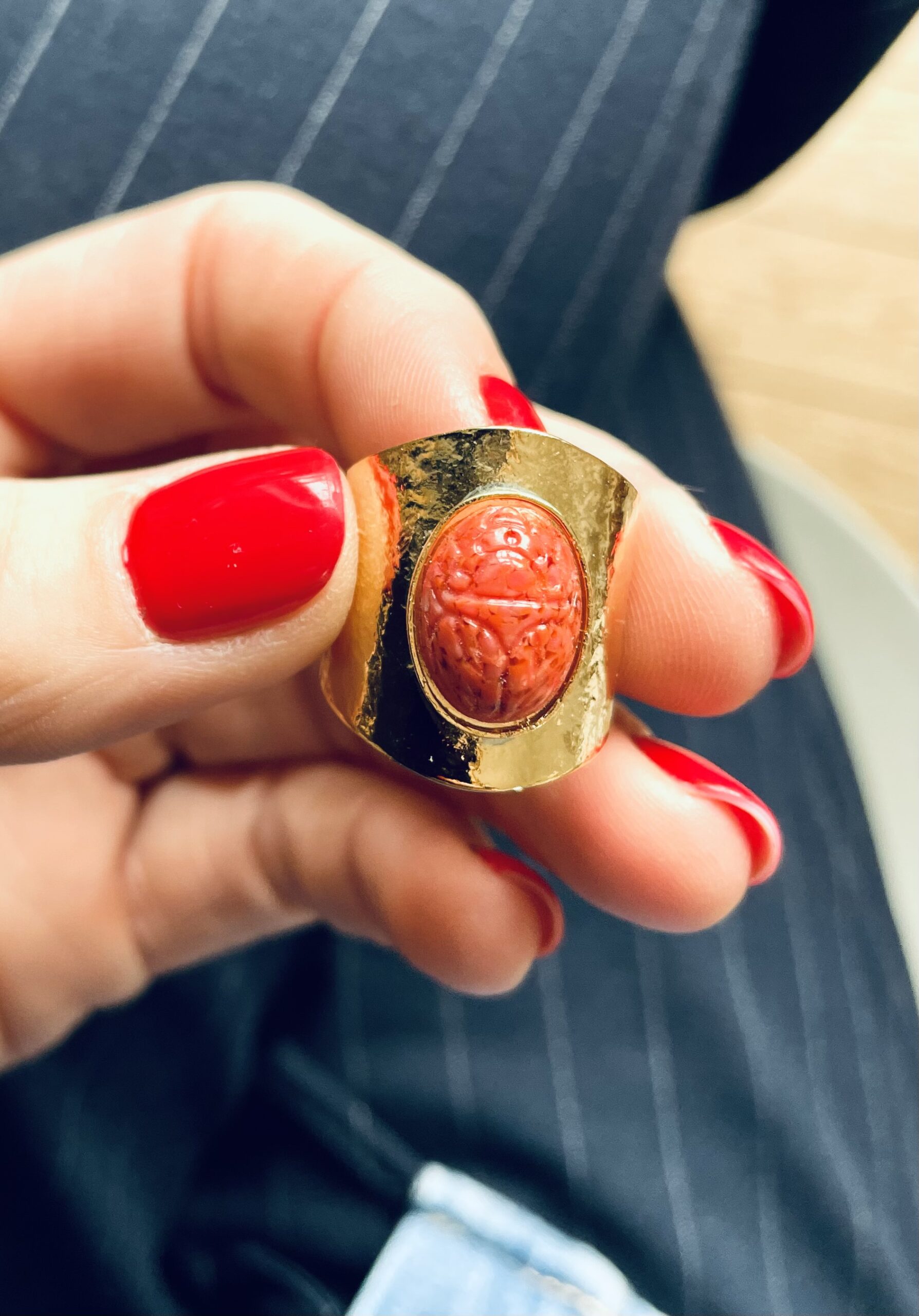 Cette bague a été montée dans notre atelier situé en Belgique. Elle est ajustable: de la taille 53 à 58mm. Coloris: corail, gold. Matières: Laiton plaqué à l’or fin, verre. Pour une plus longue durée, évitez le contact avec l’eau , l’humidité,… Largeur: 2,3cm.