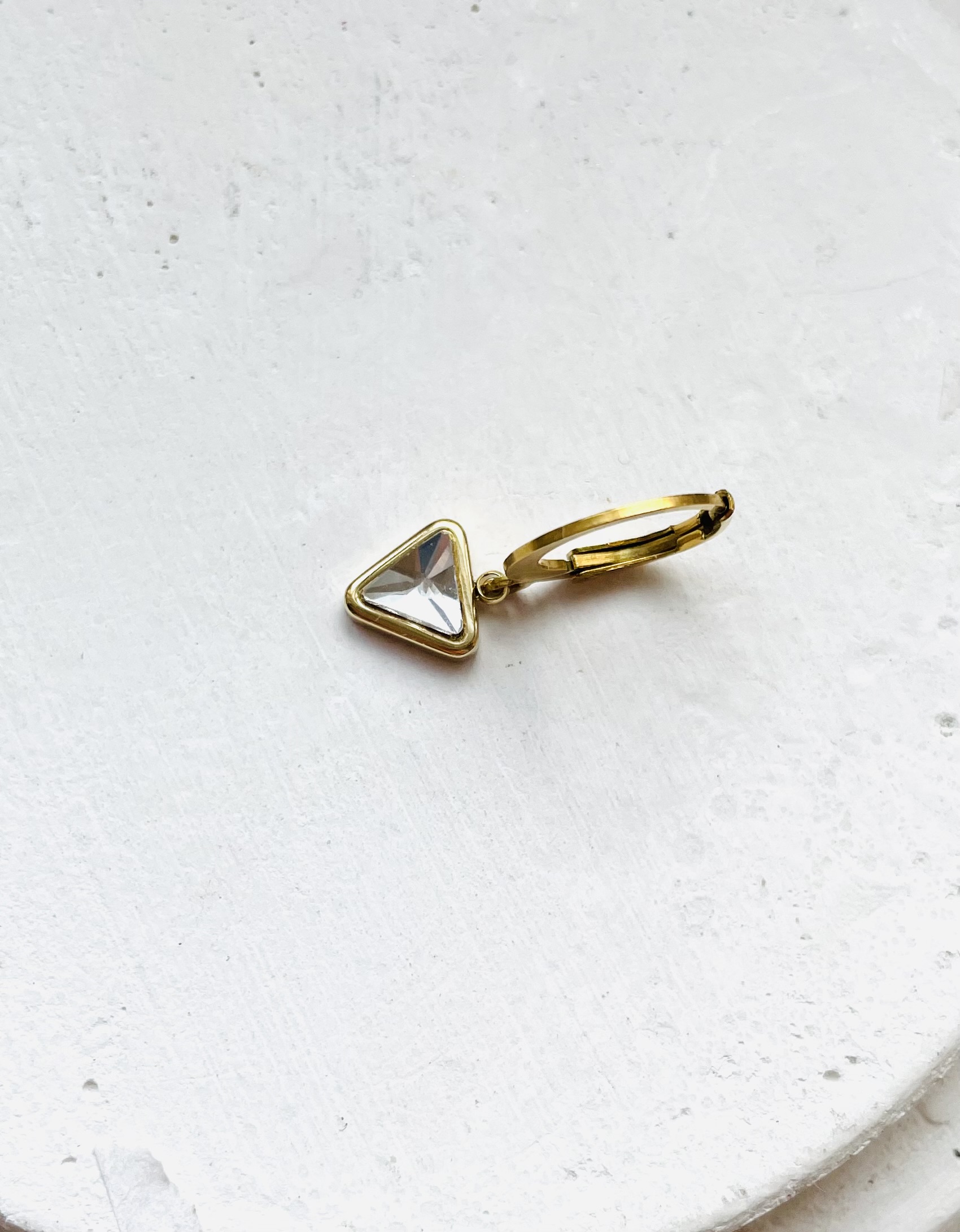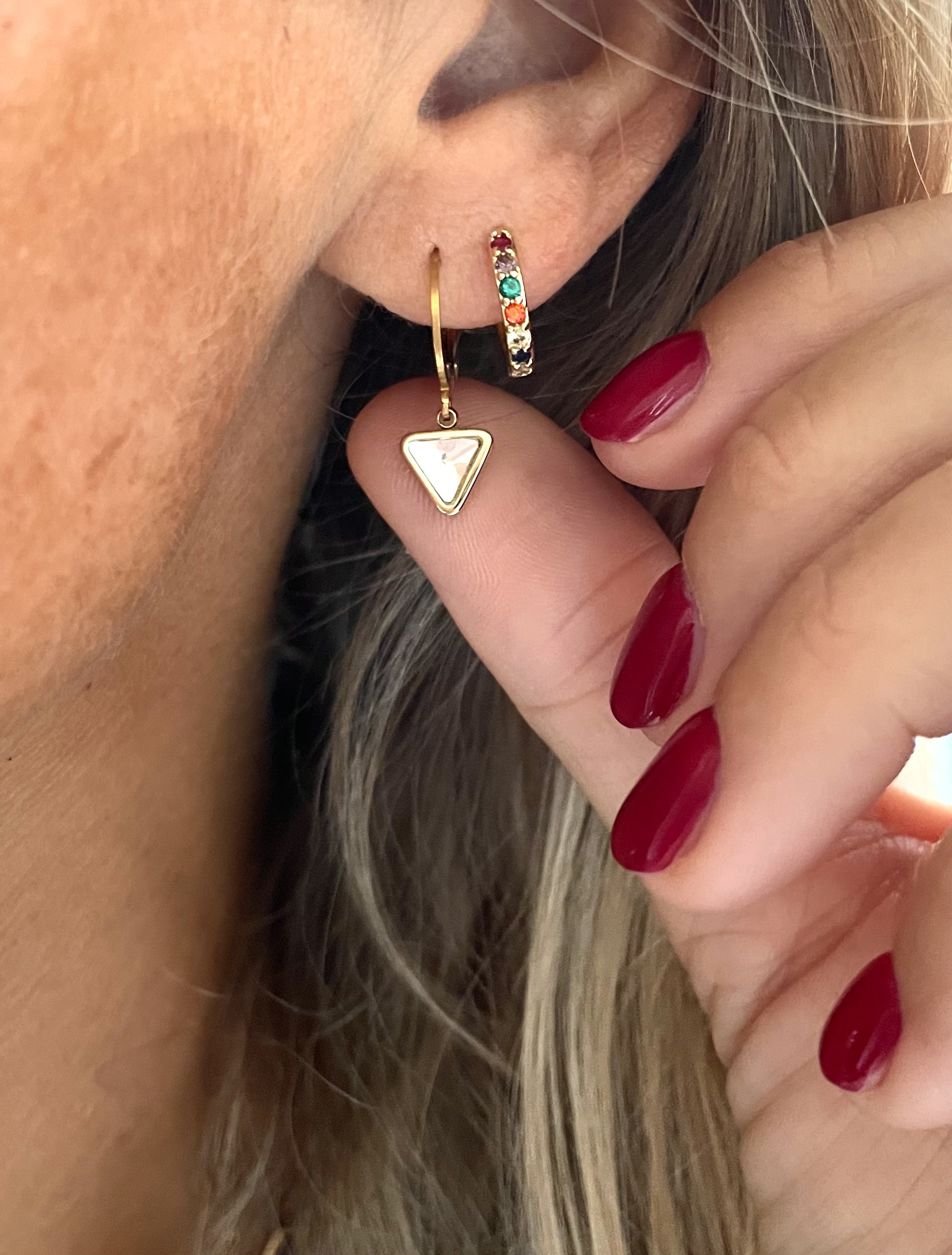 Cette créole a été réalisée à la main et en série limitée dans notre atelier situé en Belgique. Elle se compose d’une base en acier inoxydable et d’une breloque en verre et plaqué or. Longueur: 2,2cm. Existe aussi en vert. Coloris: gold, transparent.