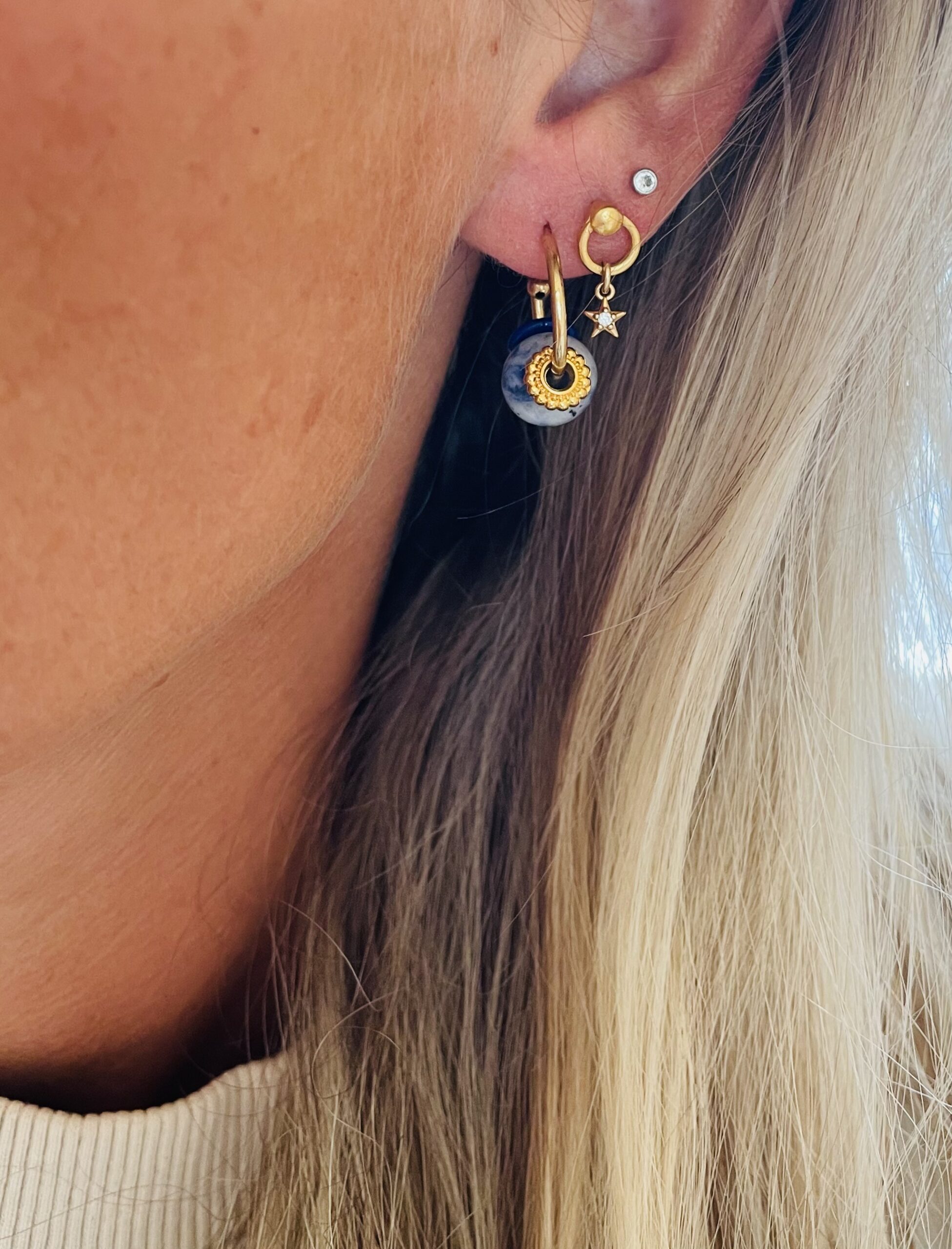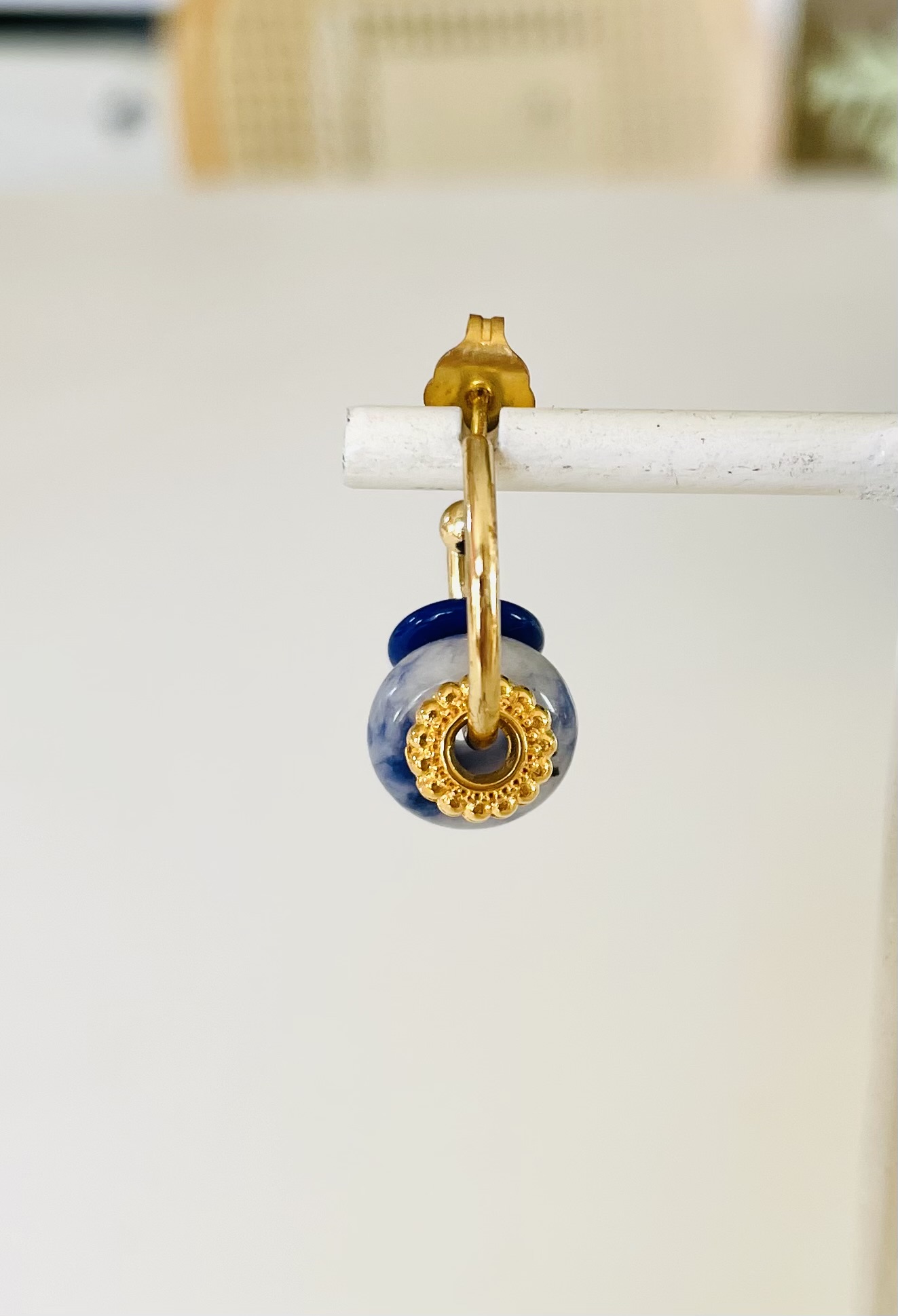 Cette jolie créole a été fabriquée à la main et en série limitée dans notre atelier situé en Belgique. Elle se compose d’une base en acier inoxydables et de donuts en pierre, en résine et en plaqué or. Longueur: 2.3cm. Coloris: bleu et gold.