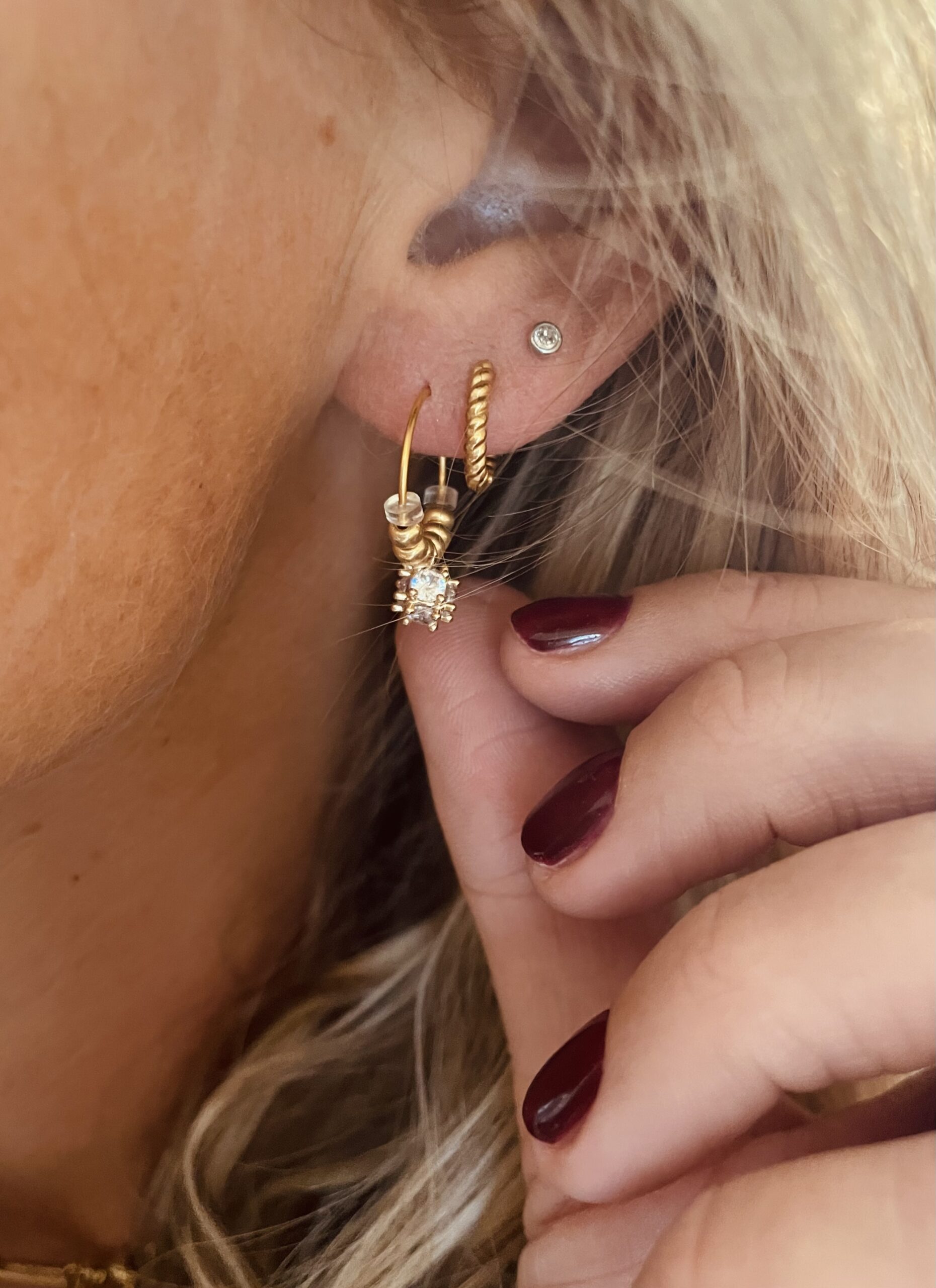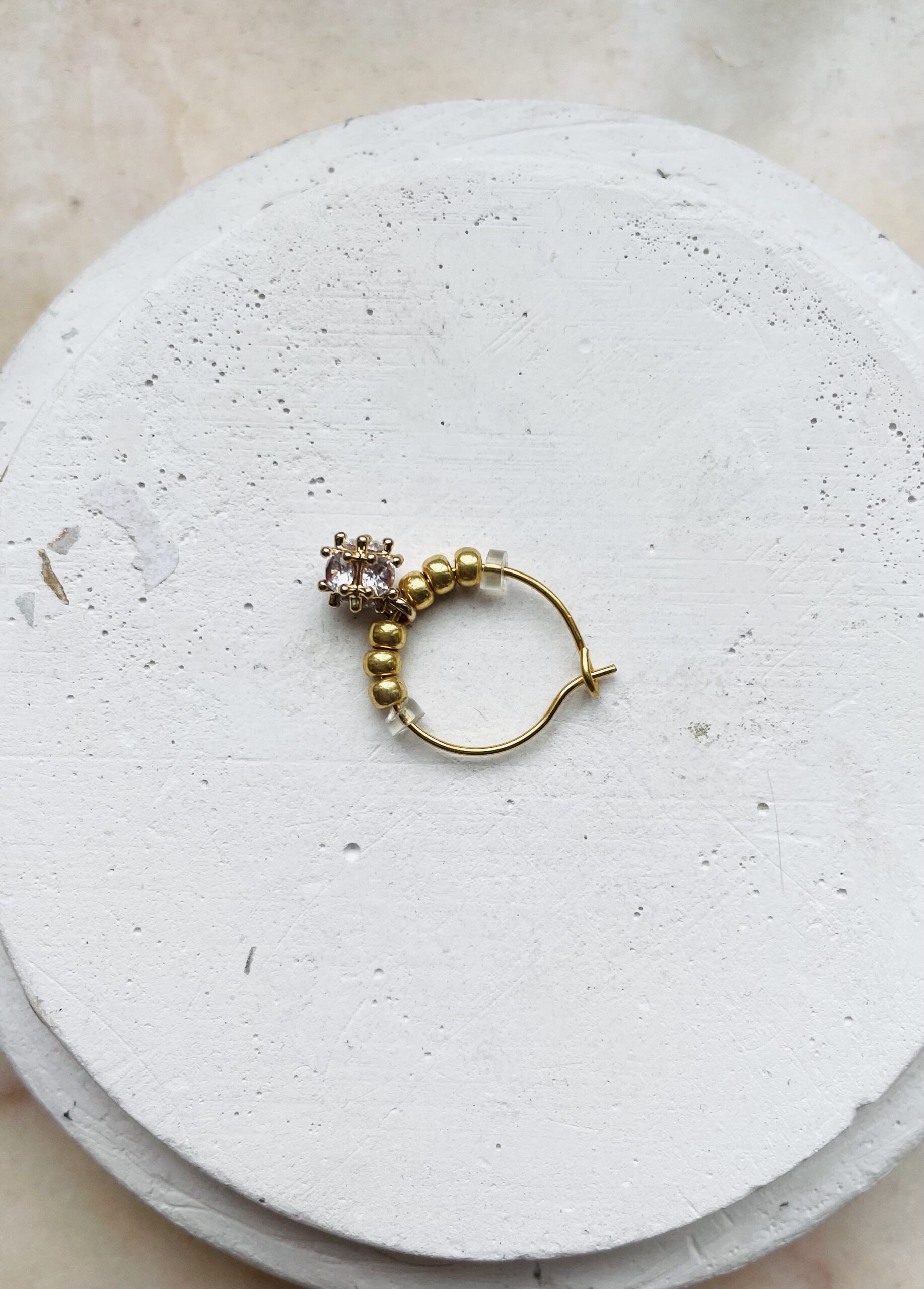 Cette monoboucle a été réalisée à la main et en série limitée dans notre atelier situé en Belgique. Elle se compose d’une base en acier inoxydable, de perles en verre et d’une breloque en zircon. Longueur: 2cm. Coloris: transparent et gold.