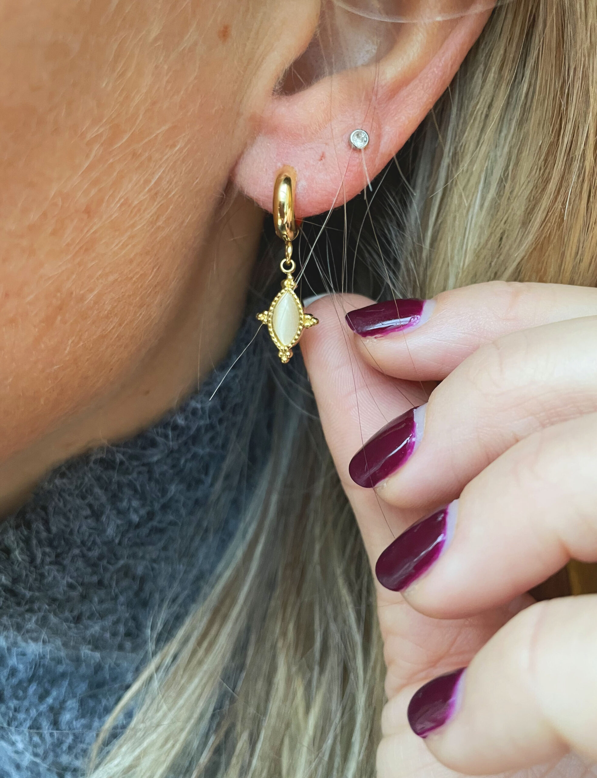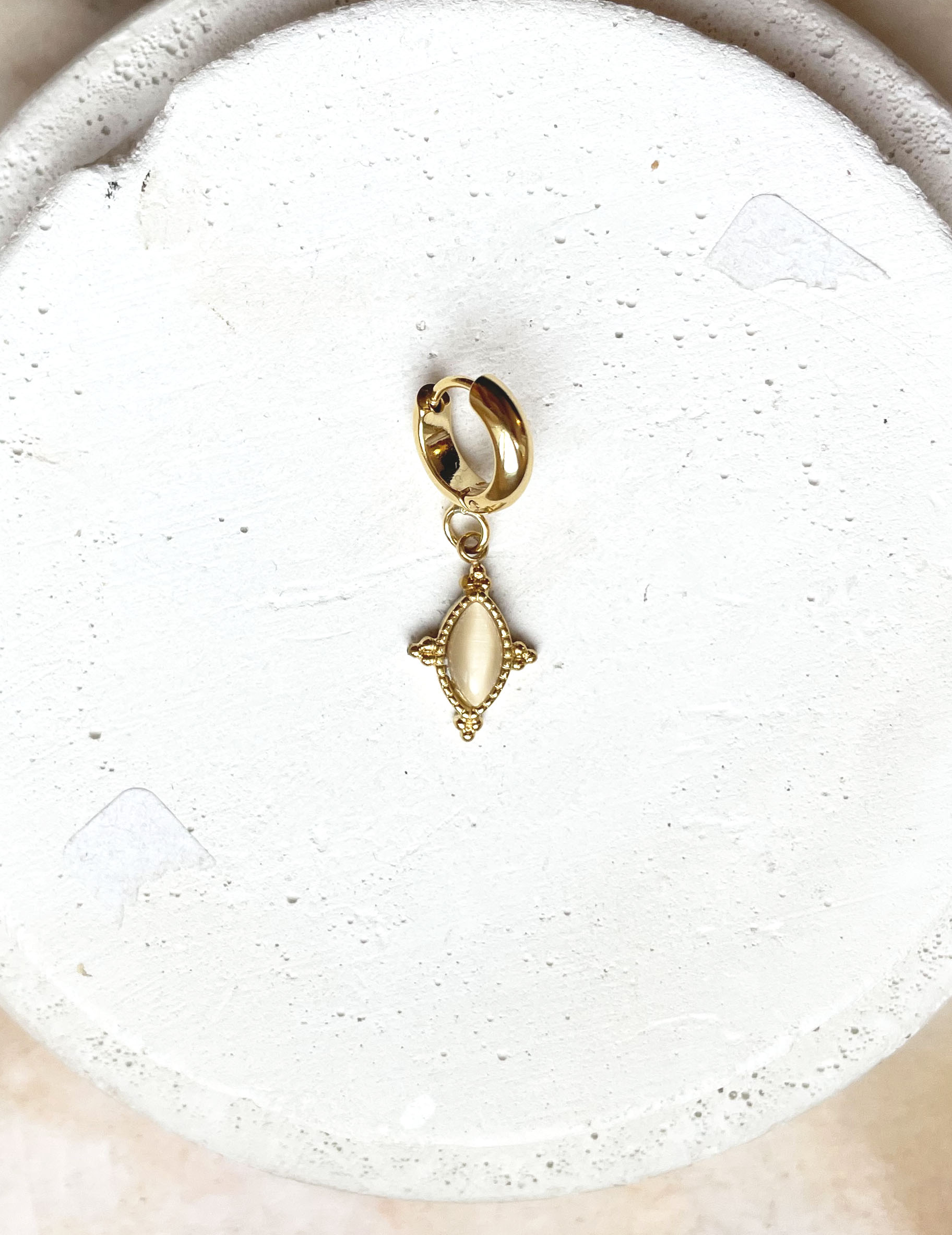 Cette monoboucle a été réalisée à la main et en série limitée dans notre atelier situé en Belgique. Elle se compose d’éléments en acier inoxydable et d’un cabochon en agate. Longueur: 2,5cm. Coloris: blanc translucide, gold.