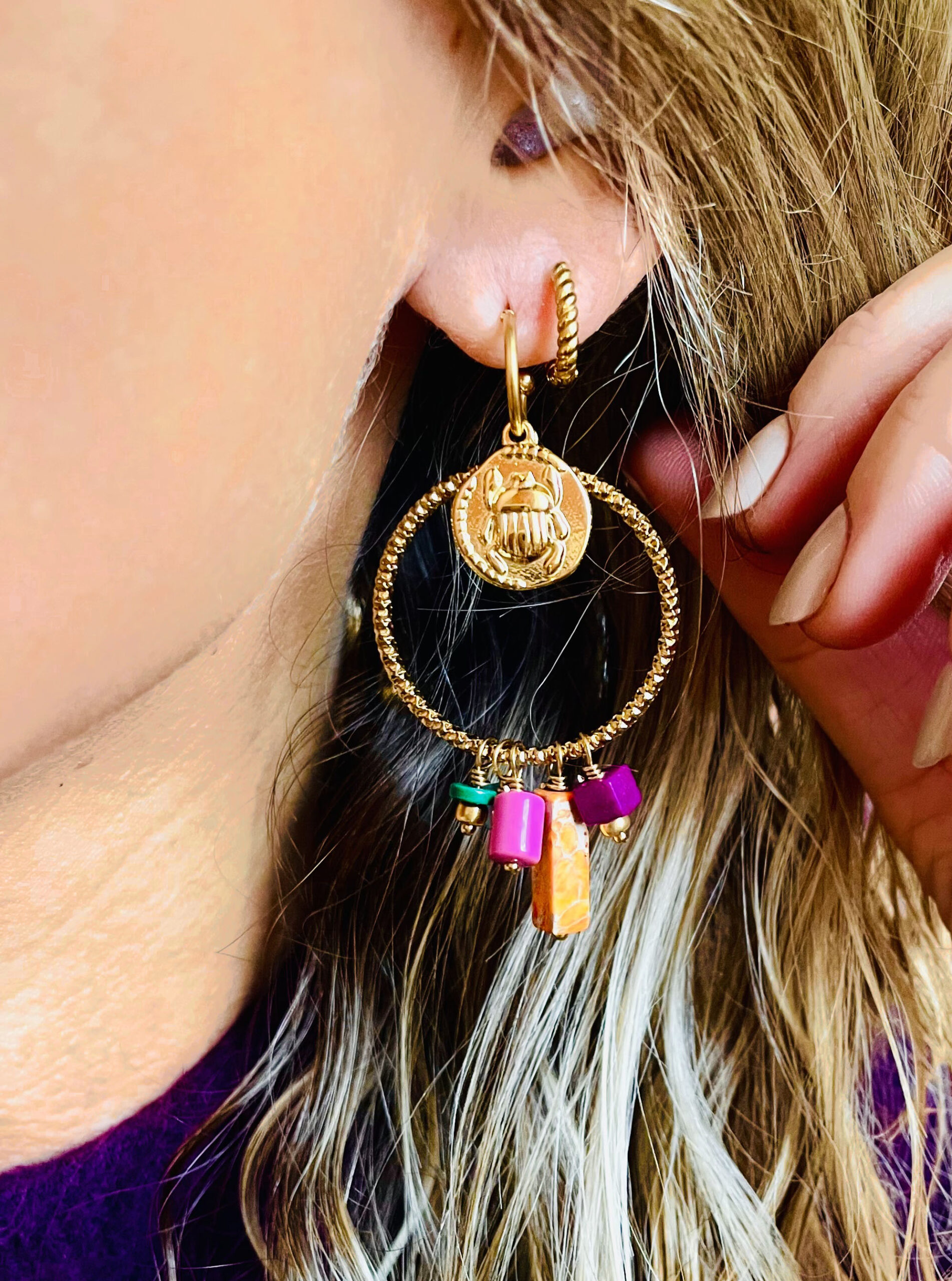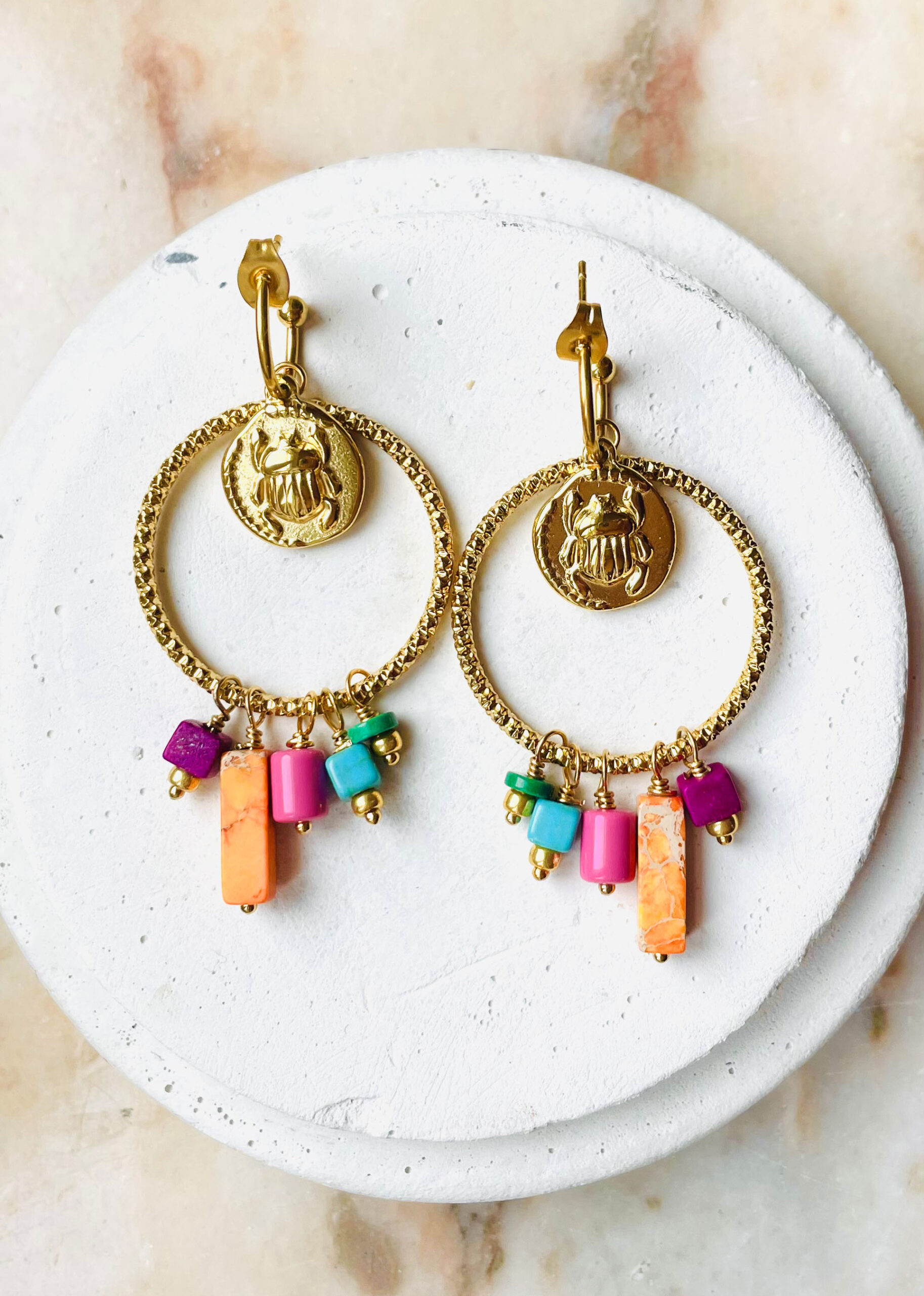 Cette paire de boucles d’oreille (avec base créoles), a été réalisée à la main et en série limitée dans notre atelier situé en Belgique. Elle se compose de pierres, d’acier inoxydable et de verre. Coloris: rose, orange, vert, turquoise,gold. Longueur: 6cm. Petit +: la breloque scarabée peut se retirer.