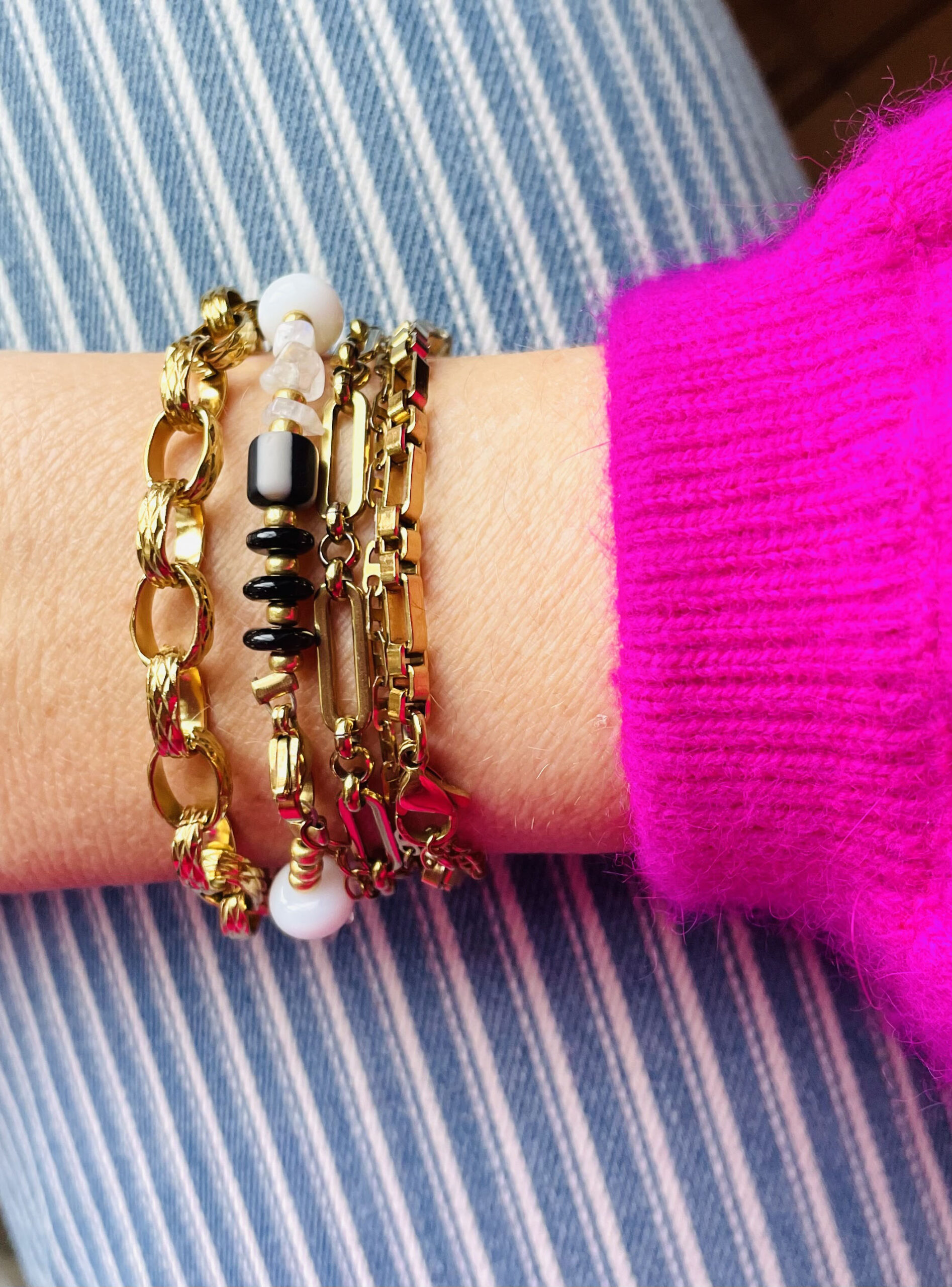 Ce bracelet a été réalisé à la main et en série limitée dans notre atelier situé en Belgique. Il se compose de perles en verre, en résine et en pierres. Coloris: noir, blanc, gold. Longueur: 17cm > 19,5cm.