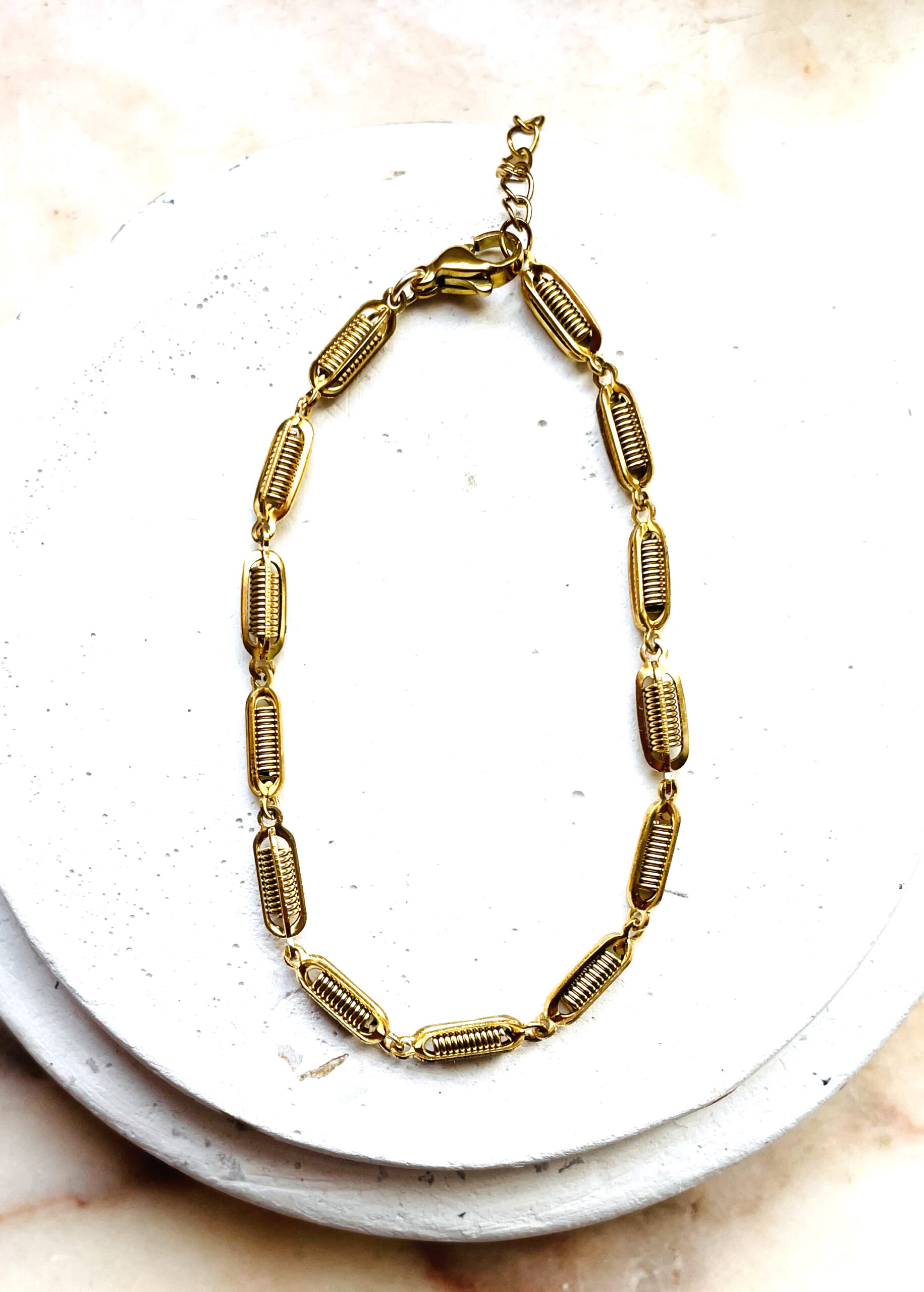 Ce bracelet a été fabriqué à la main et en série limitée dans notre atelier situé en Belgique. Il se compose de maillons en acier inoxydable. Longueur: 17cm > 19,5cm. Coloris: gold.