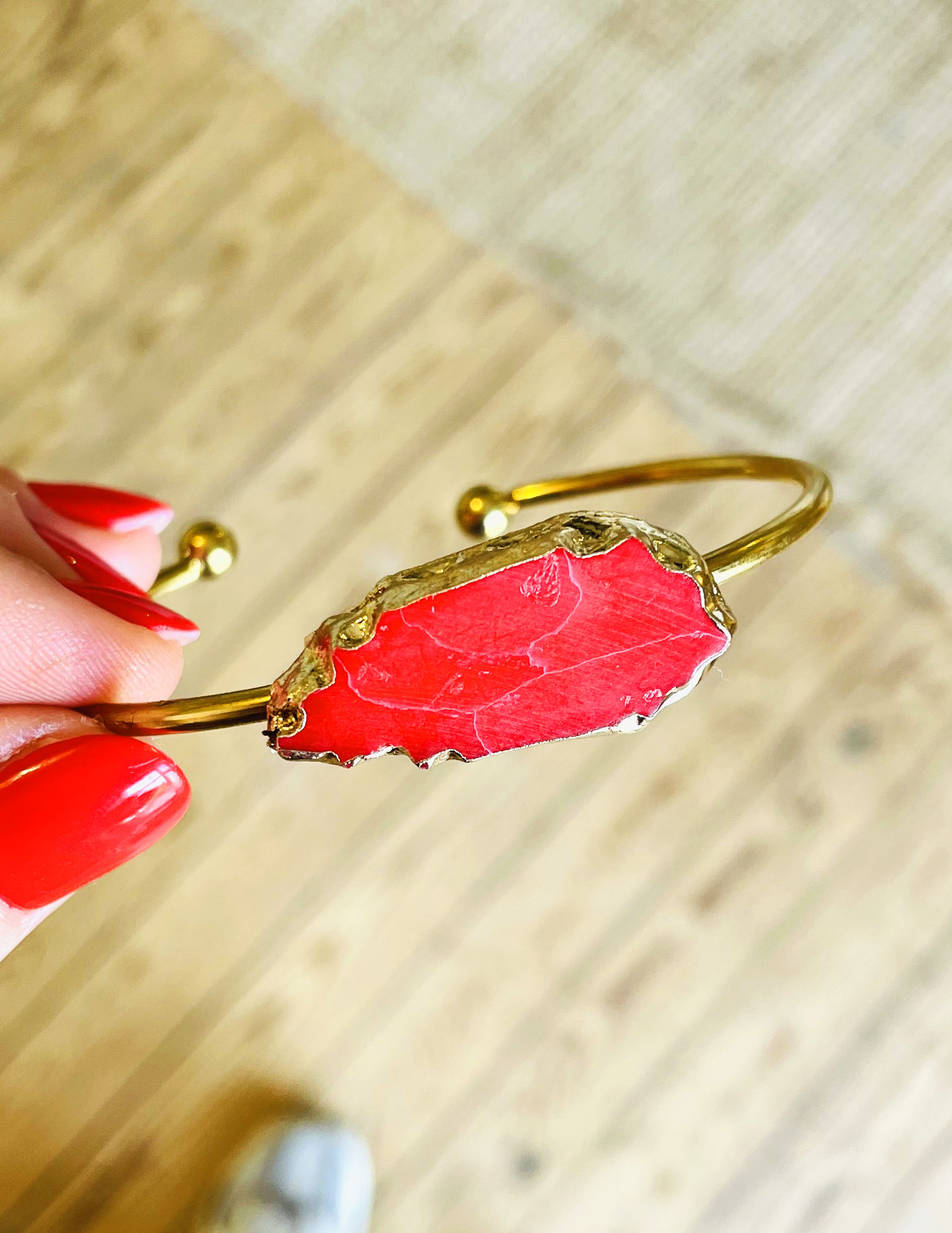 Ce jonc a été réalisé à la main et en série limitée dans notre atelier situé en Belgique. Il se compose d’une base en acier inoxydable et d’un pièce centrale en reconstitution de pierre entourée d’aluminium. Diamètre: 6,5cm > 6cm Coloris: rouge orangé  et gold. Pour évitez un changement de couleurs, évitez le contact avec l’eau, l’humidité, etc.