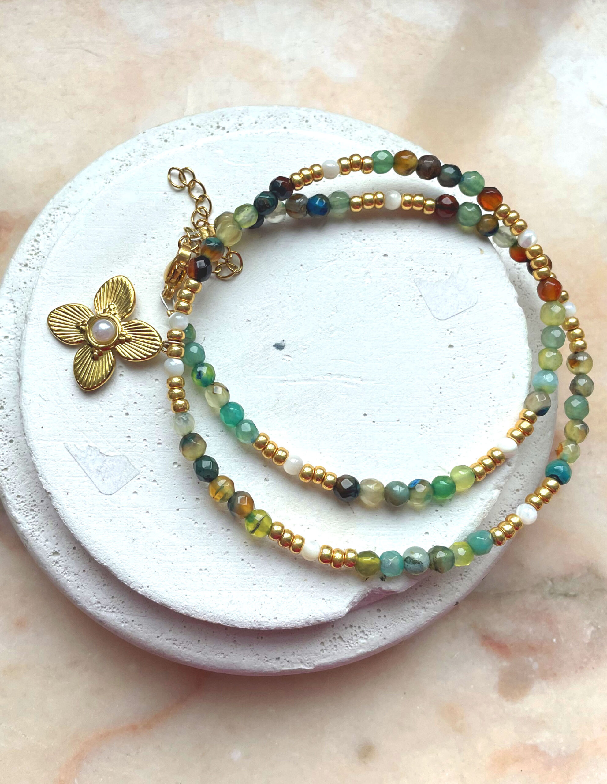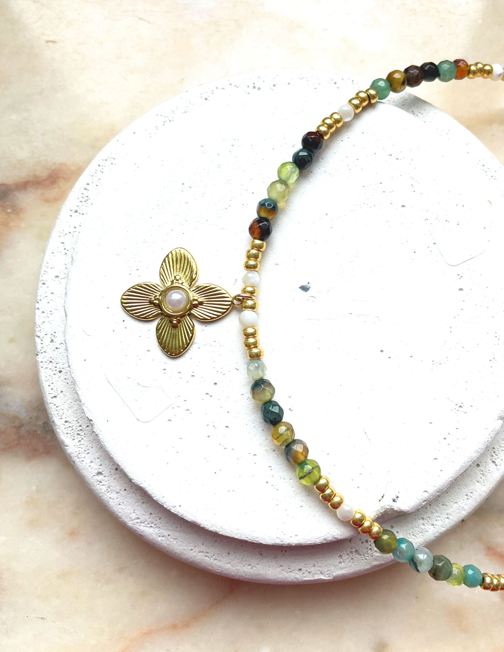 Ce collier a été réalisé à la main et en série limitée dans notre atelier situé en Belgique. Il se compose de perles en agate, en verre et d’éléments en acier inoxydable. Longueur: 42cm > 47cm. Coloris: vert, marron, ocre, gold, nacre.