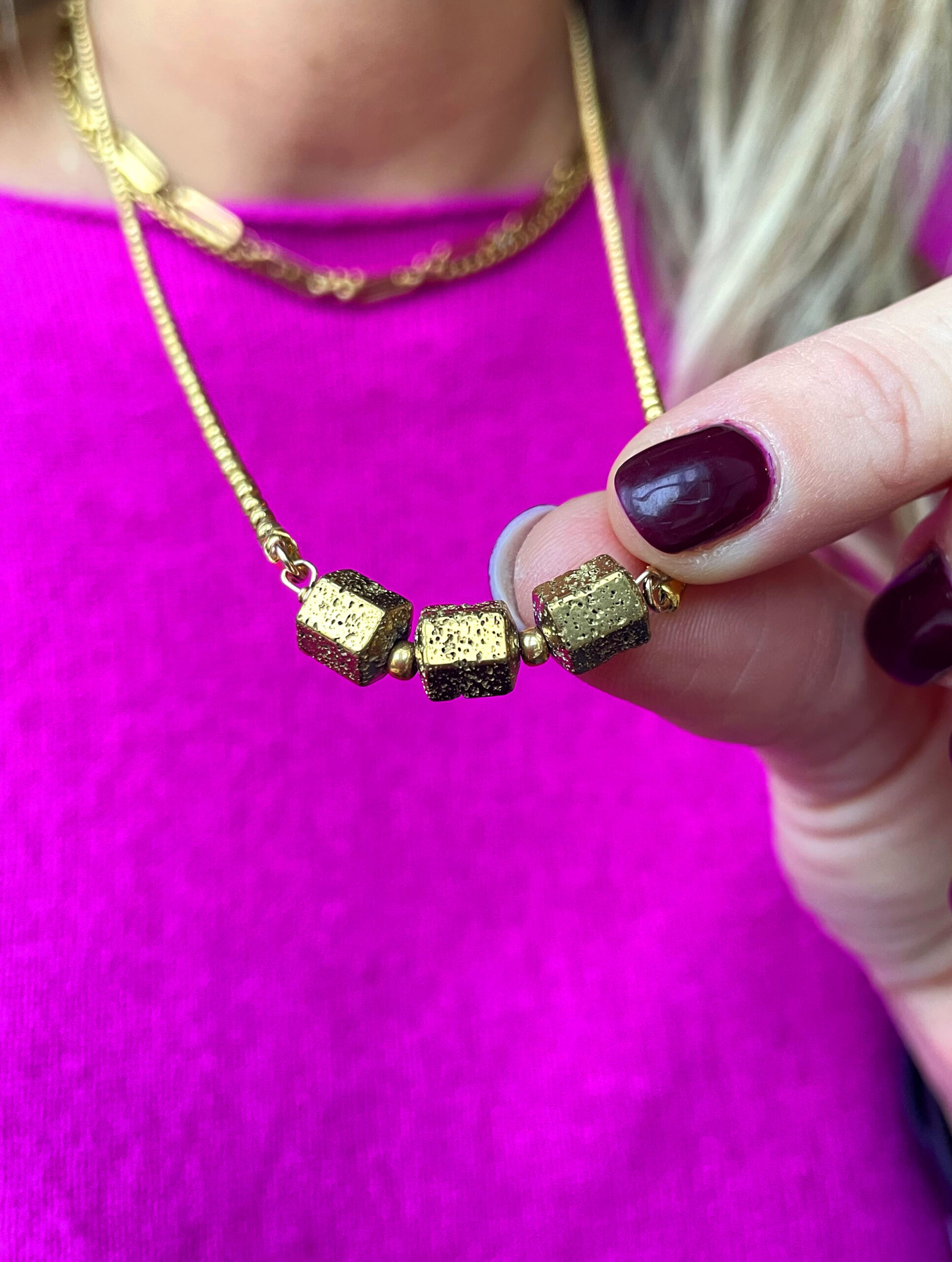 Collier mi-long réalisé à la main et en série limitée dans notre atelier situé en Belgique. Il se compose d’une base en acier inoxydable et de pierres en hématite. Longueur: 63cm > 68cm. Coloris: gold.