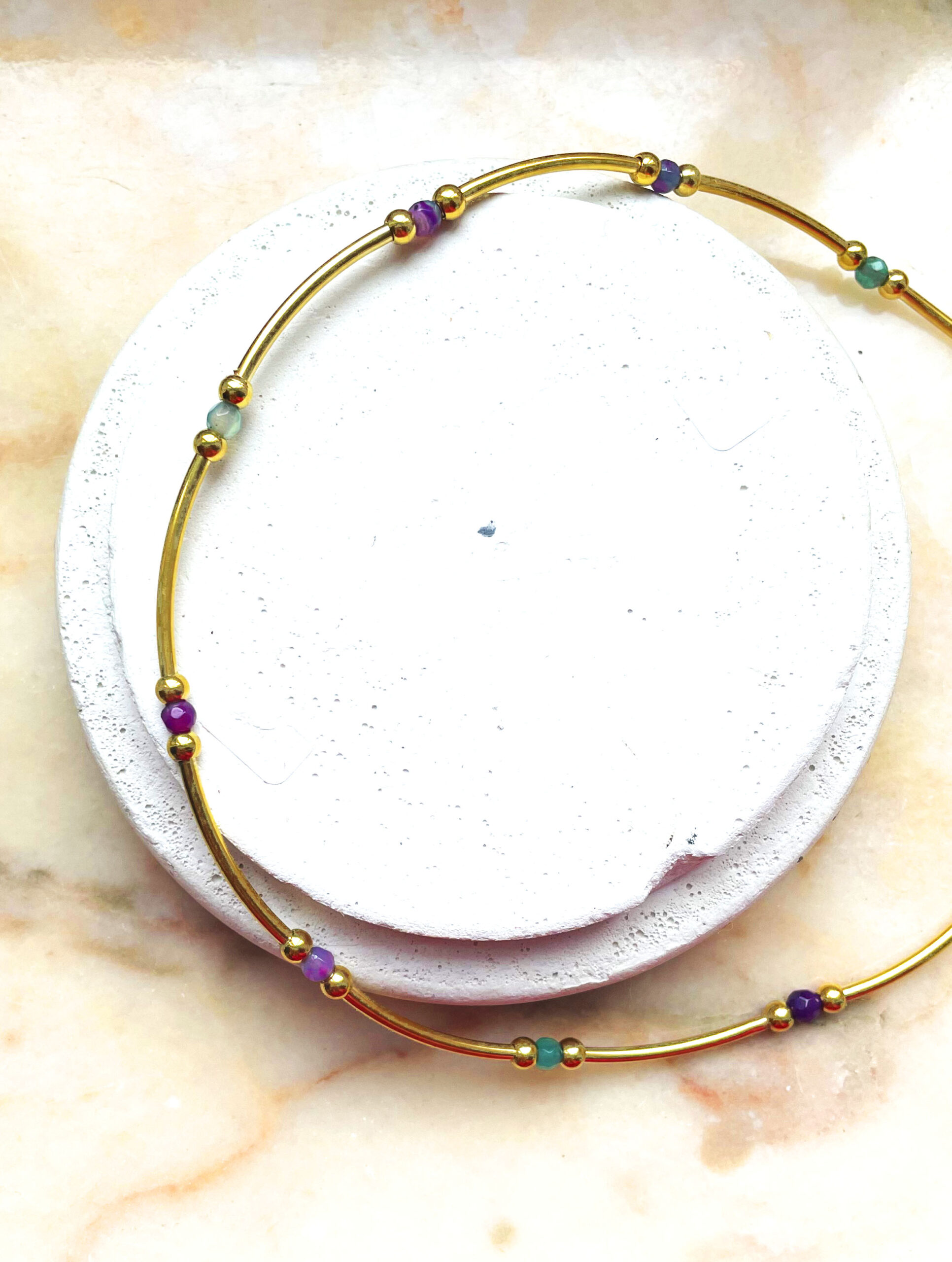 Ce collier ras du cou, a été réalisé à la main et en série limitée dans notre atelier situé en Belgique. Il se compose de perles en tourmaline et d’éléments en acier inoxydable. Longueur: 32cm > 37cm. Coloris: Mauve, fushia, vert, blanc, gold,…