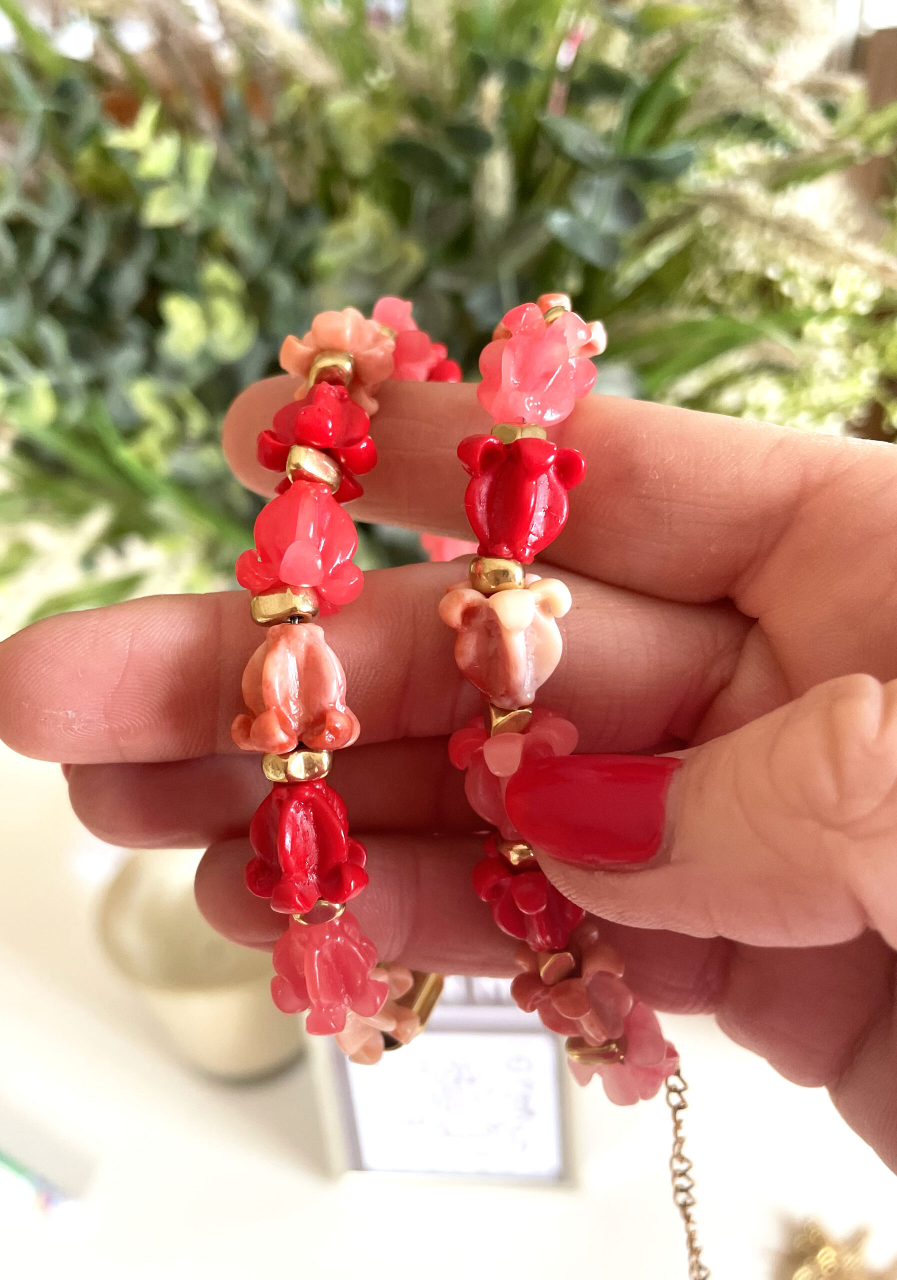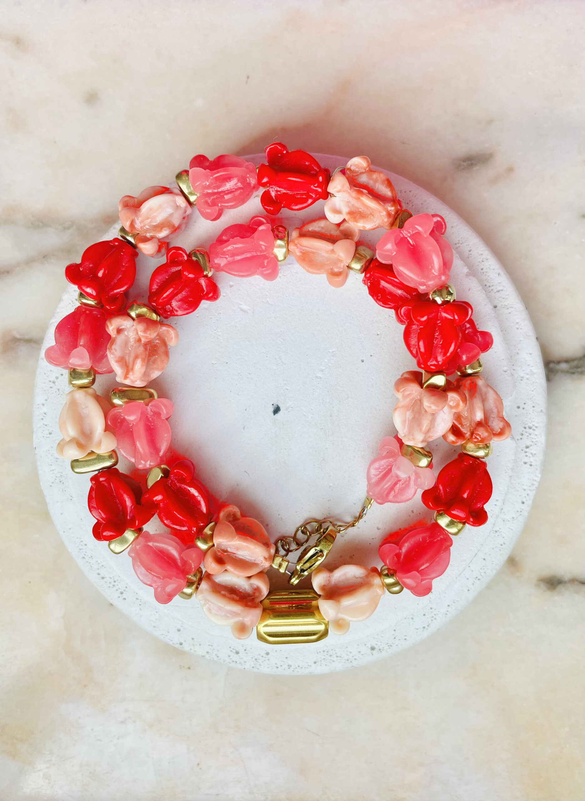 Ce collier a été réalisé à la main et en série limitée dans notre atelier situé en Belgique. Il se compose de perles en résine, en hématite et acier inoxydable. Longueur: 42cm > 47cm. Coloris: rouge, corail, gold.