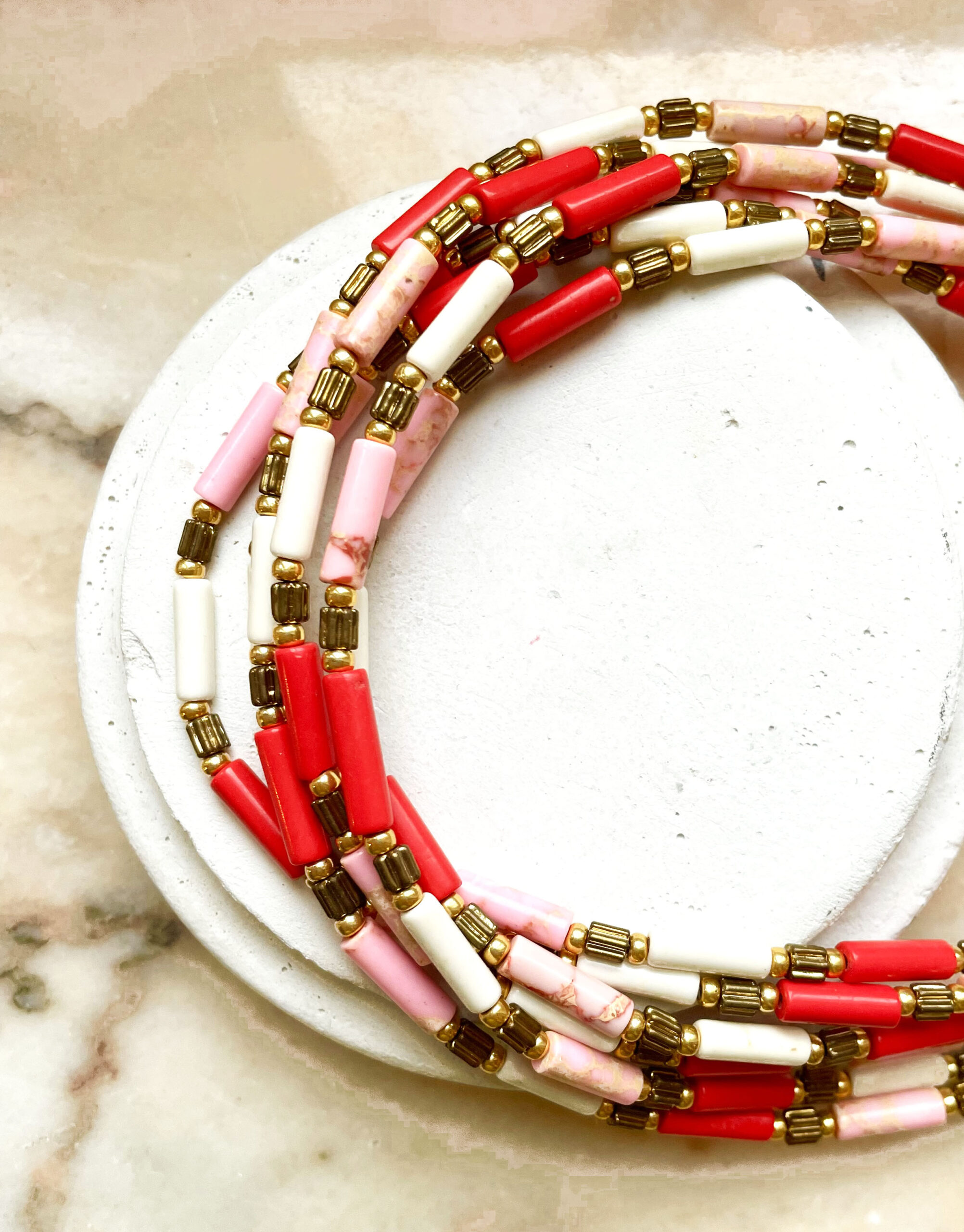 Ce collier a été réalisé à la main et en série limitée dans notre atelier situé en Belgique. Il se compose de perles en pierres, en verre et d’éléments en acier inoxydable. Longueur: 40cm > 45cm. Colopris: rose pastel, blanc, rouge orangé et gold.