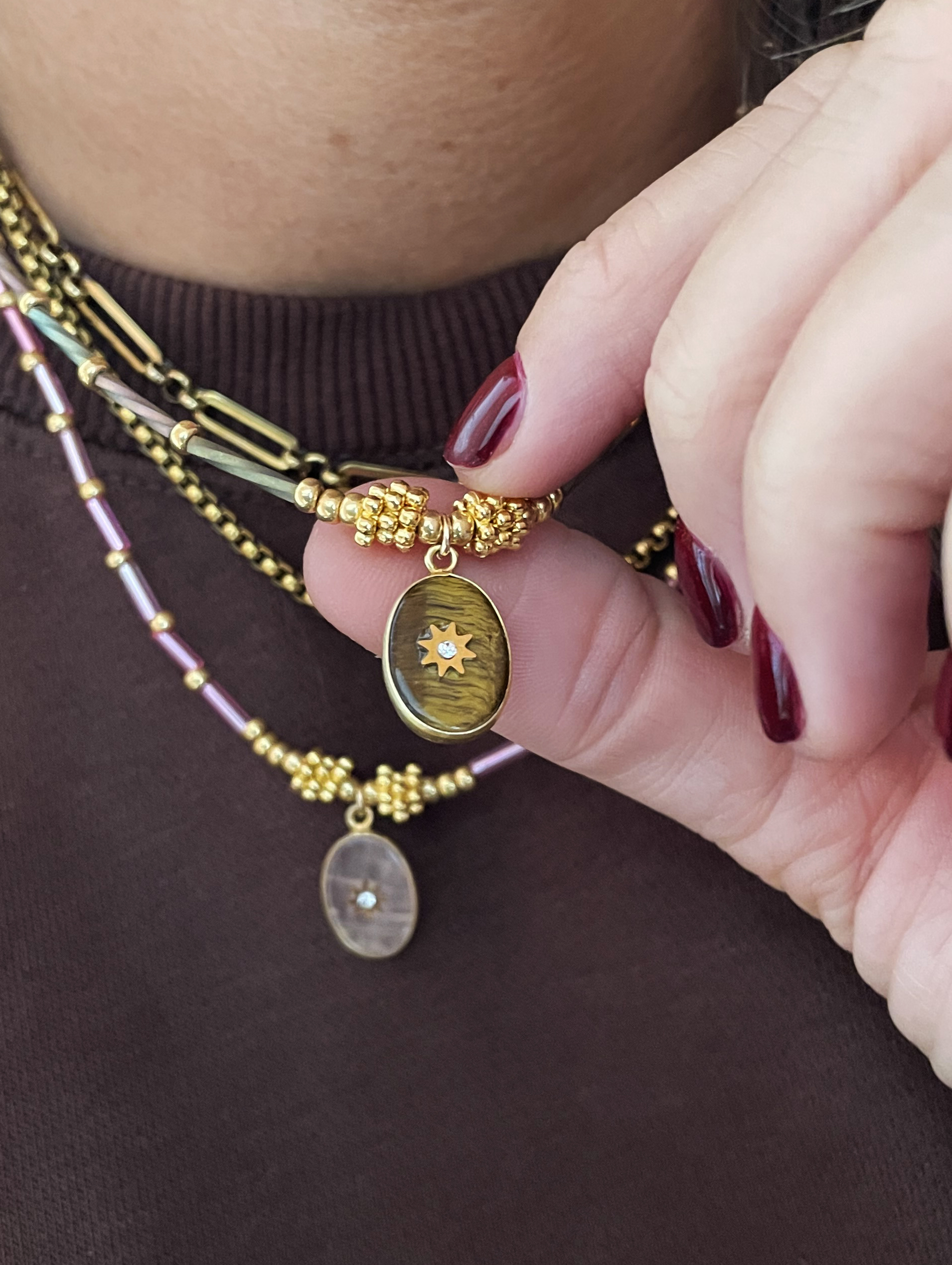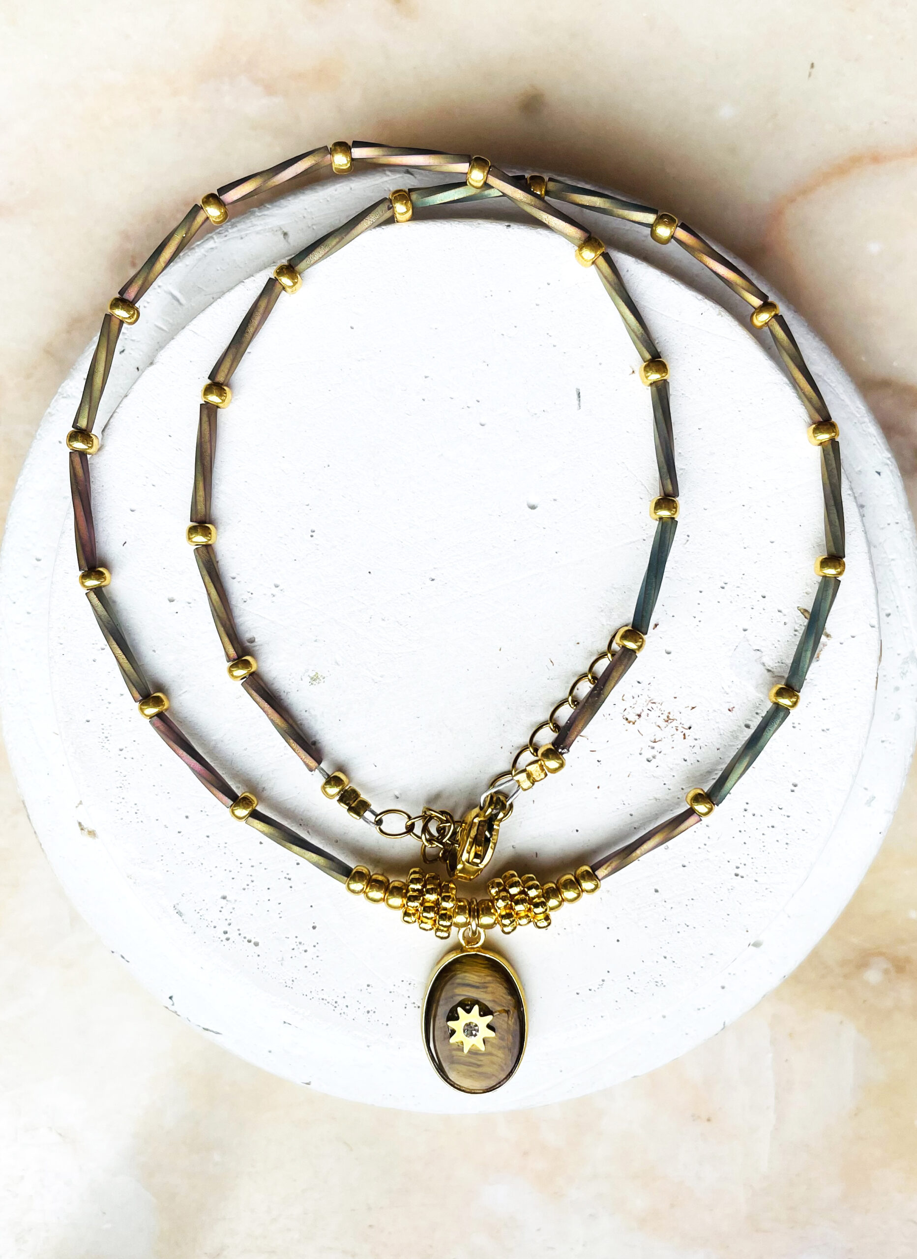 Ce collier a été fabriqué à la main et en série limitée dans notre atelier situé en Belgique. Il se compose de perles en verre et d’un pendentif en gold filled et oeil de tigre. Coloris: marron et gold. Longueur: 40cm > 45cm.