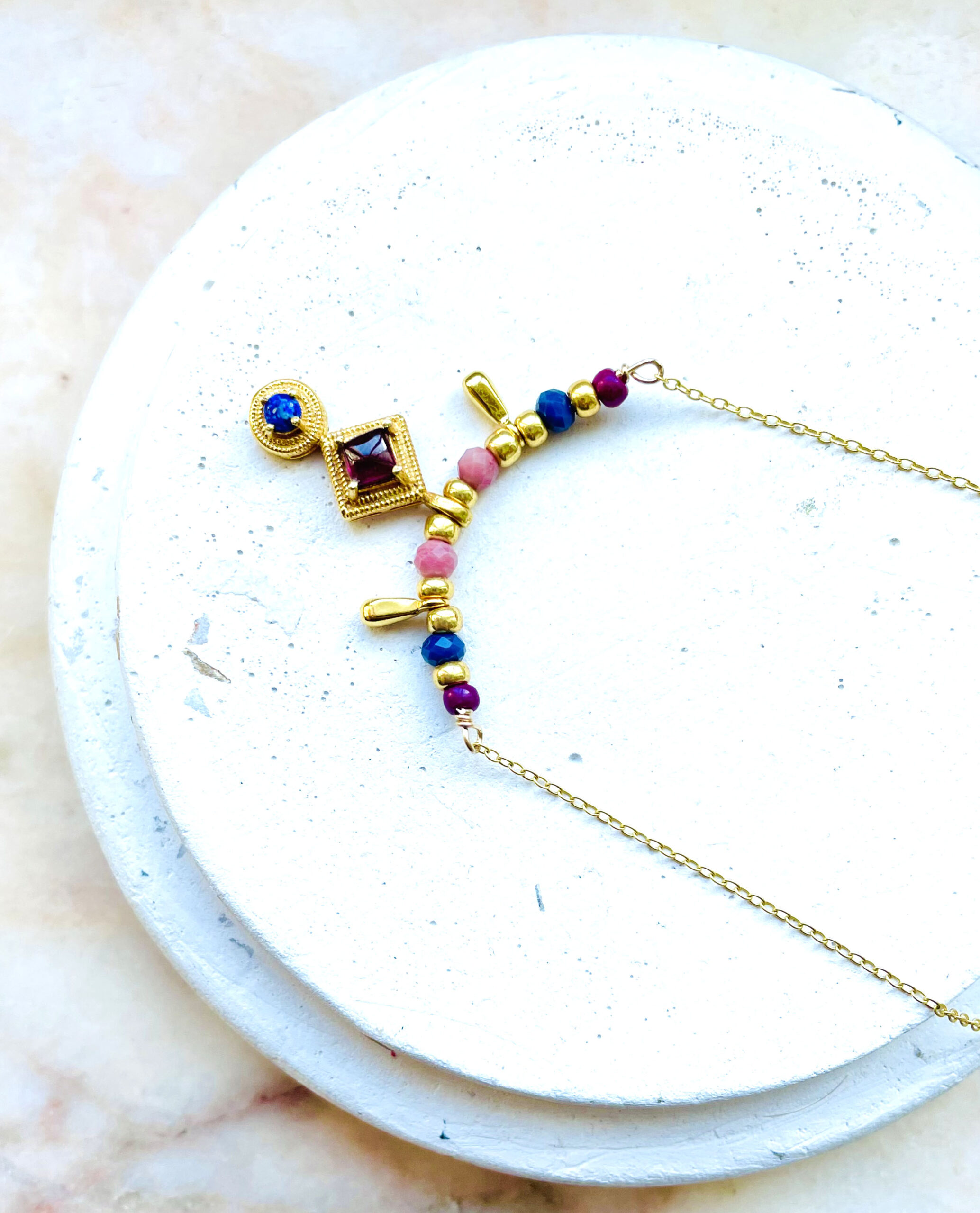 Ce collier a été réalisé à la main et en série limitée dans notre atelier situé en Belgique. Il se compose d’une chaine en laiton plaqué or, de perles en pierres et en verre et d’un pendentif en grenat et lapis lazuri. Coloris: bleu, grenade, vieux rose et gold. Longueur: 50cm > 55cm.