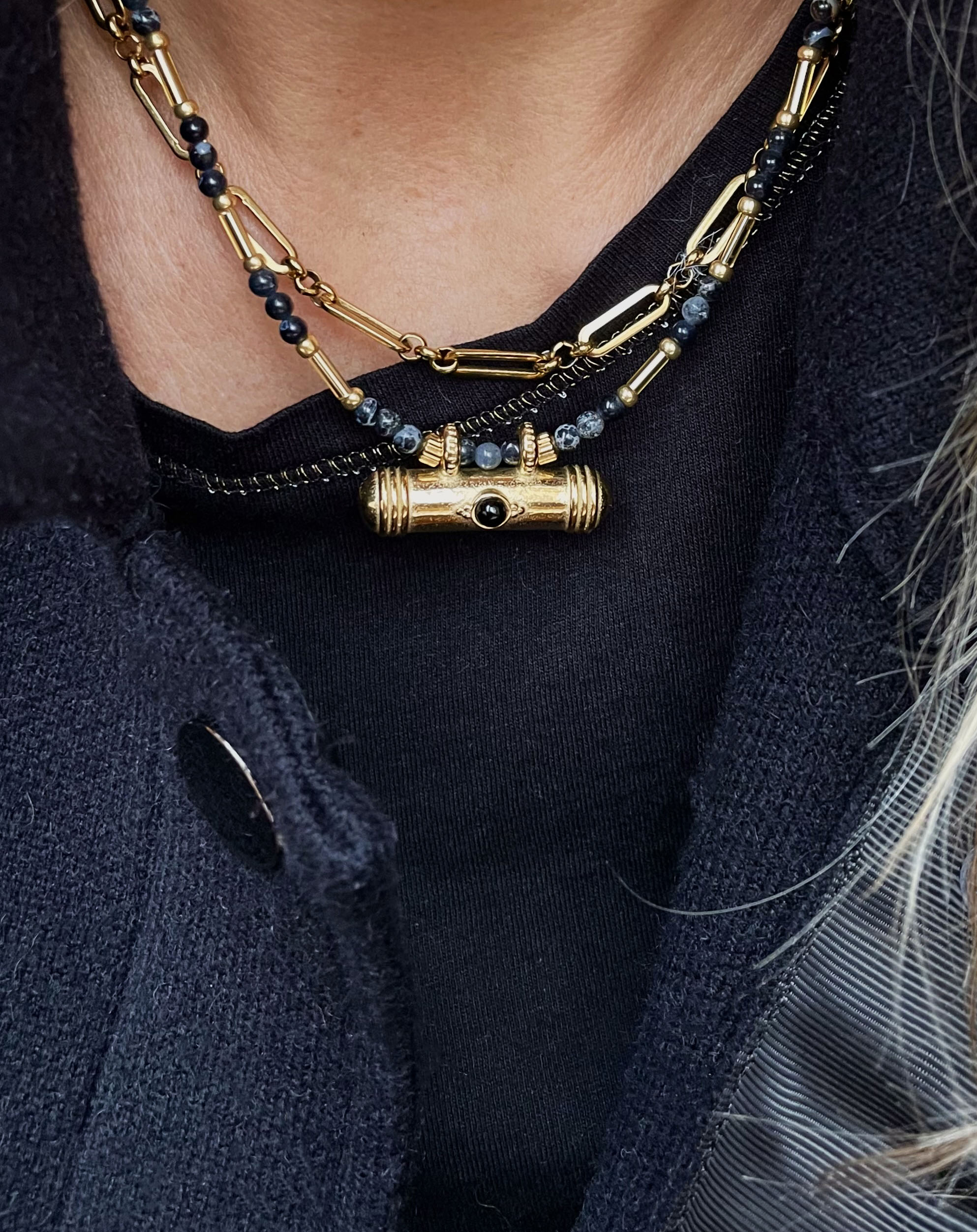 Ce collier a été réalisé à la main et en série limitée dans notre atelier situé en Belgique. Il se compose de perles en verre et en pierres de jaspe impériale et régalite et d’un pendnentif en acier inoxydable et obsidienne. Longueur: 40,5cm > 45,5cm. Coloris: noir, gris, gold.