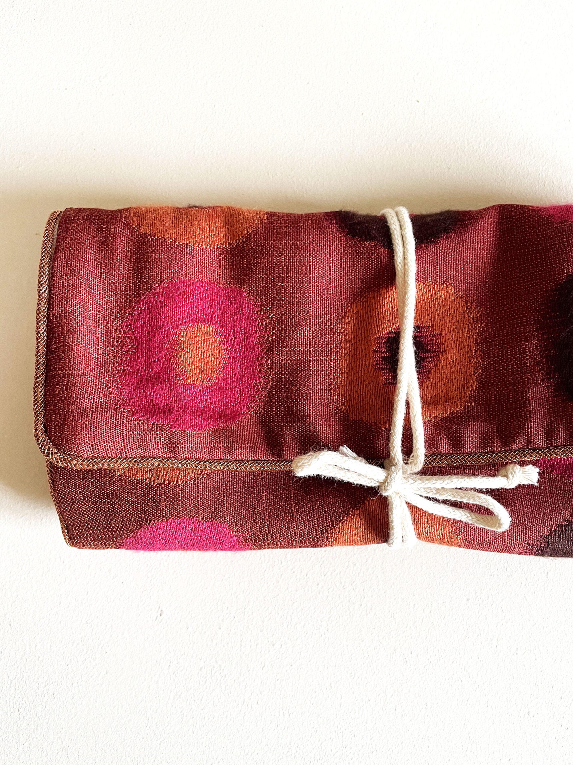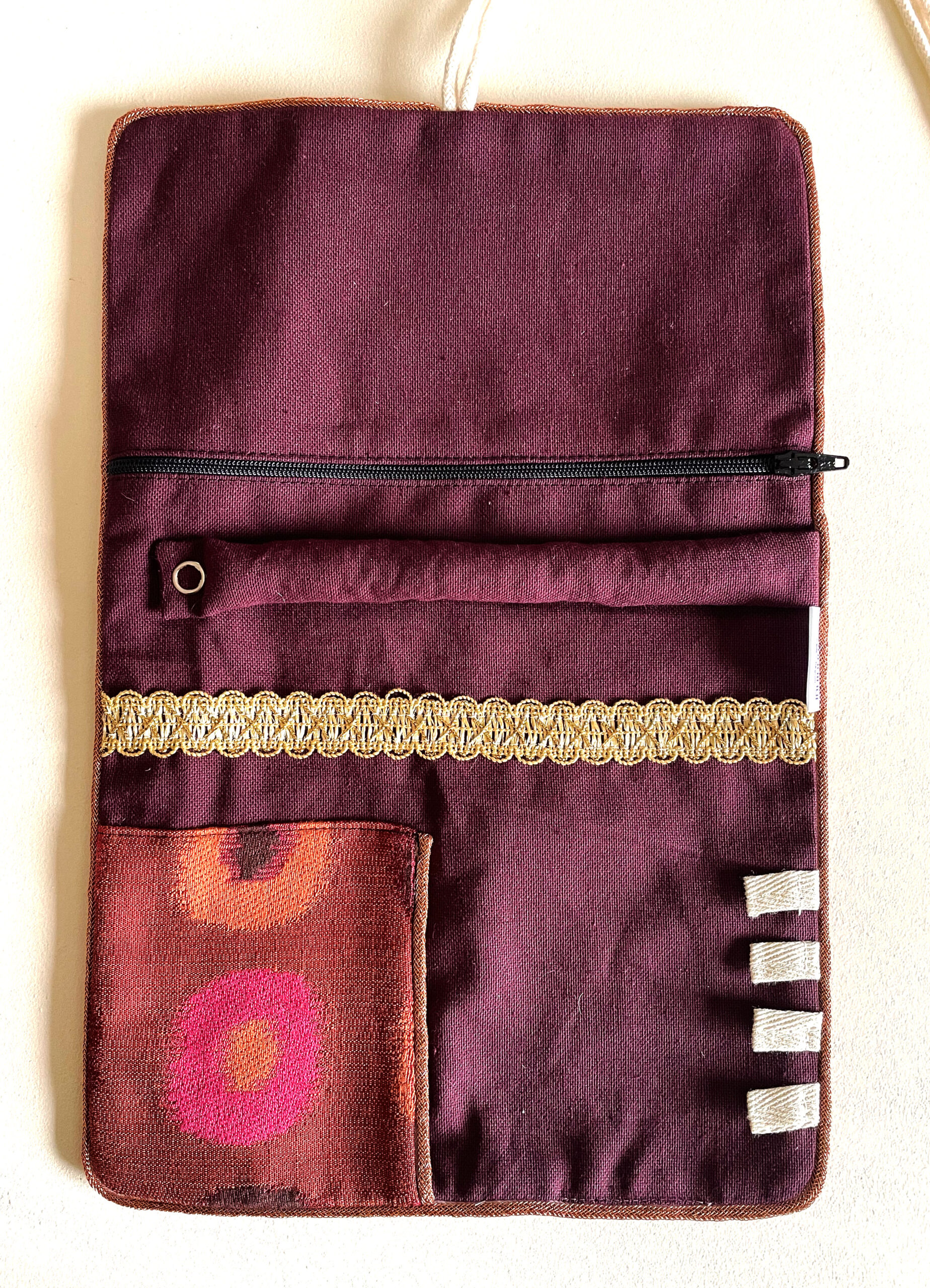 Cette pochette a été pensée et imaginée dans l’atelier Chouhuihui et réalisée dans un atelier protégé situé en Belgique. Les tissus ont été sélectionnés avec beaucoup de soin dans un magasin de tissus d’ameublement en Belgique ou le choix s’est porté sur des restants de chutes afin d’éviter le gaspillage. Le boudin avec pression permet de ranger bague et/ou créoles, les 4 rubans les colliers qui se glissent ensuite dans la poche, le compartiment a tirette sert à y placer les barrettes, les joncs, les bijoux plus imposants et la dentelle est à utiliser pour les boucles d’oreille. Taille de la pochette ouverte: 31cm x 21cm, Taille de la pochette fermée: 21cm x 11cm. Matières: Coton, polyester,… Coloris: ecru, bordeaux, fushia, camel, marron, aubergine,…