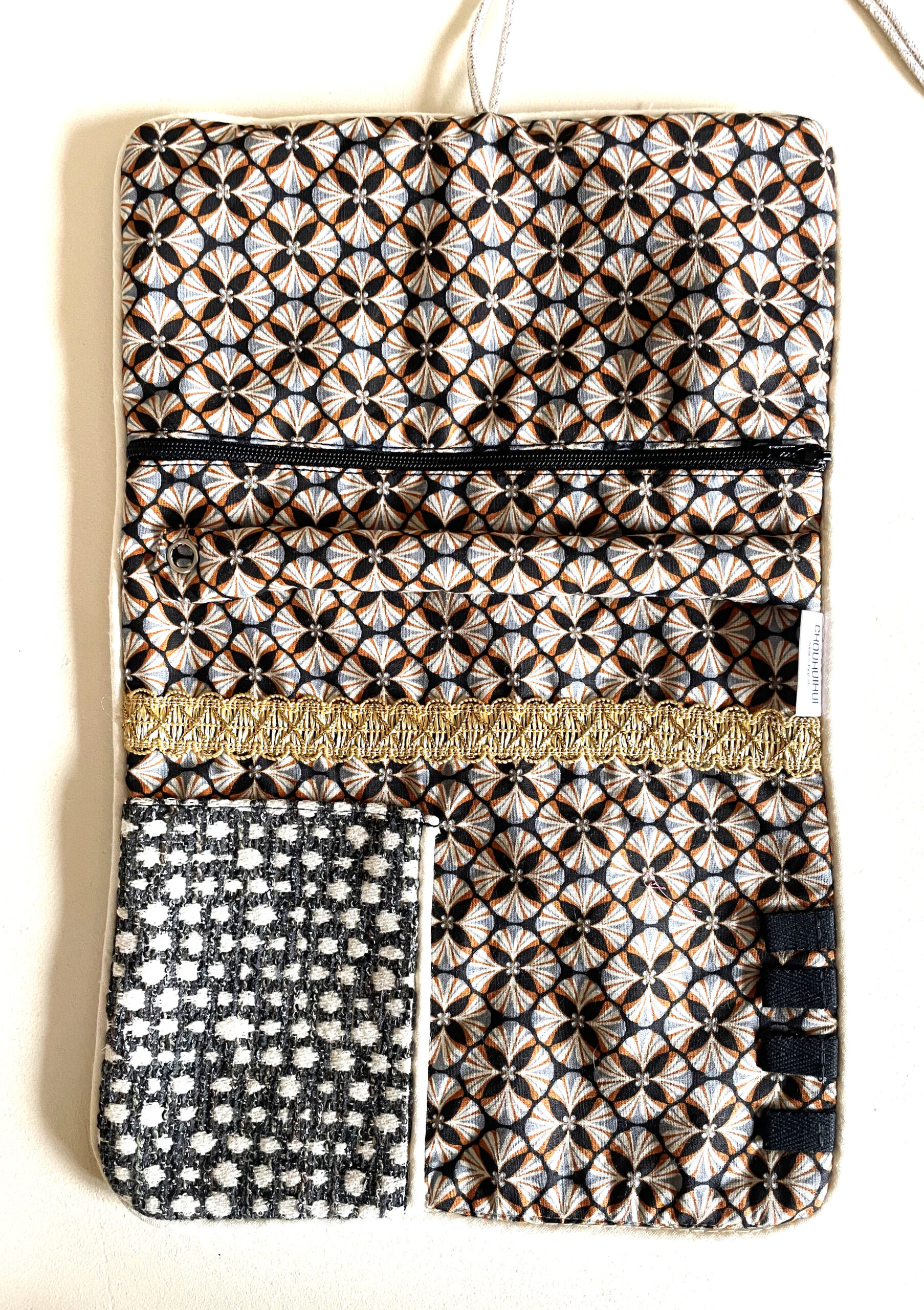 Cette pochette a été pensée et imaginée dans l’atelier Chouhuihui et réalisée dans un atelier protégé situé en Belgique. Les tissus ont été sélectionnés avec beaucoup de soin dans un magasin de tissus d’ameublement en Belgique ou le choix s’est porté sur des restants de chutes afin d’éviter le gaspillage. Le boudin avec pression permet de ranger bague et/ou créoles, les 4 rubans les colliers qui se glissent ensuite dans la poche, le compartiment a tirette sert à y placer les barrettes, les joncs, les bijoux plus imposants et la dentelle est à utiliser pour les boucles d’oreille. Taille de la pochette ouverte: 31cm x 21cm, Taille de la pochette fermée: 21cm x 11cm. Matières: Coton, polyester,… Coloris: gris, blanc, noir, camel, bleu.