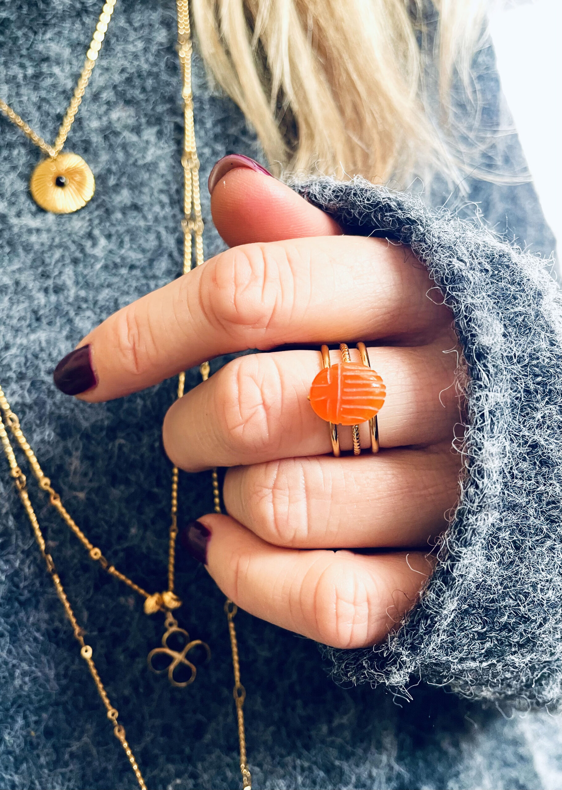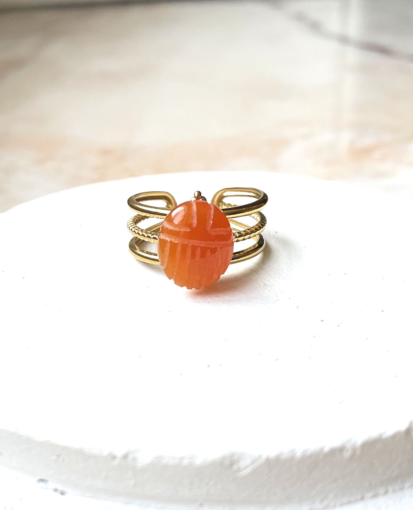 Cette bague a été montée dans notre atelier situé en Belgique. Elle se compose d’une base en acier inoxydable et d’un cabochon scarabée en cornaline. Coloris: orange, gold. Taille: ajustable: Peut convenir de la taille 52 à 58.