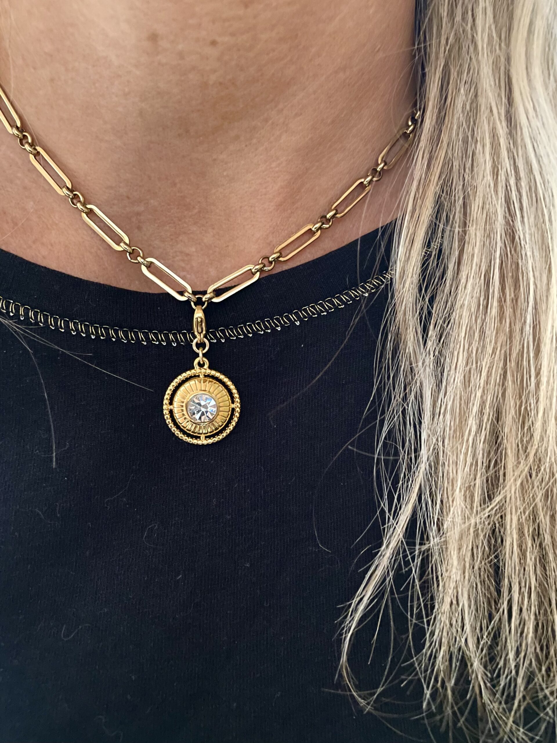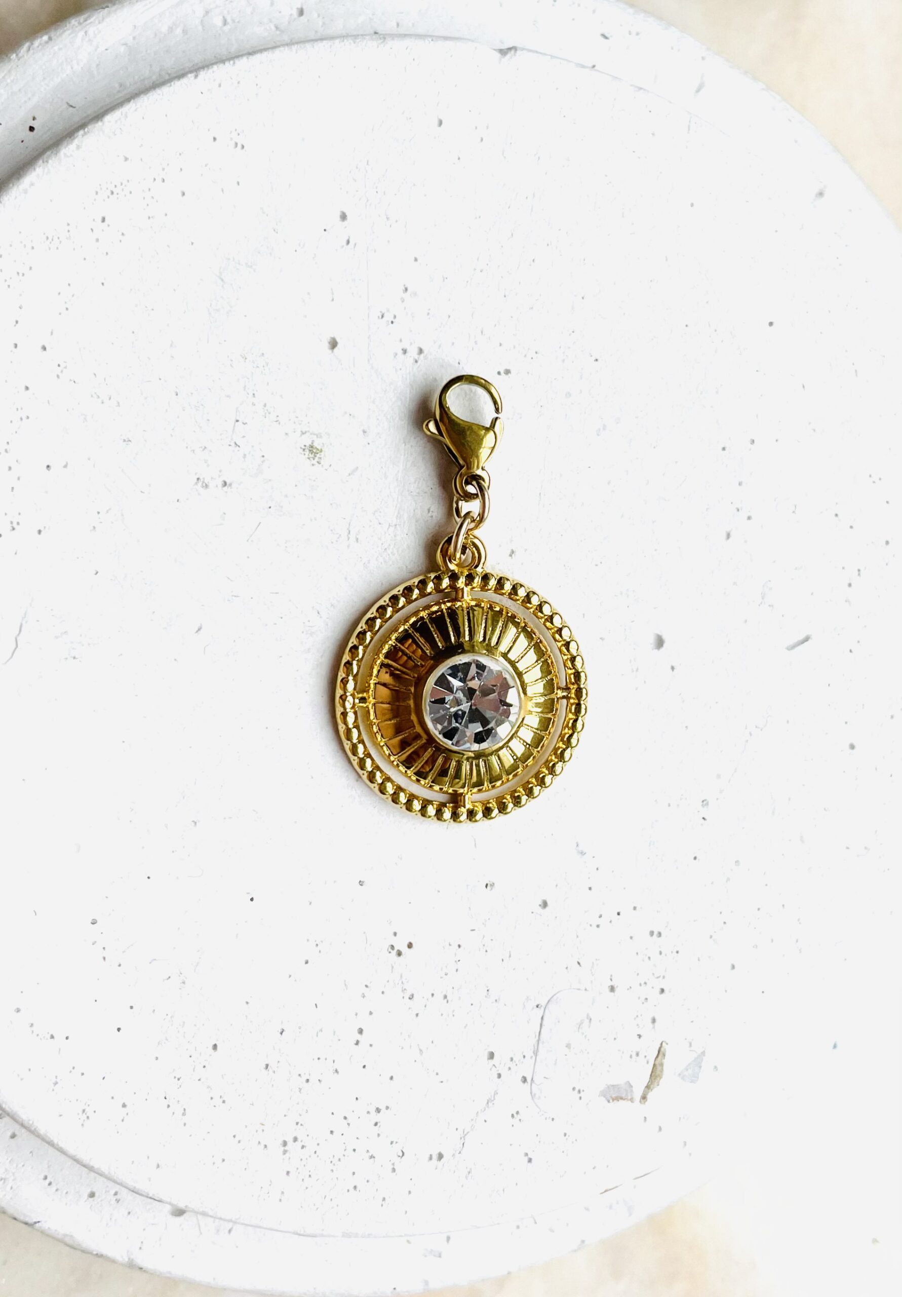Ce pendentif a été assemblé dans notre atelier situé en Belgique. Il se compose d’éléments en acier inoxydable et zircon. Coloris: gold et transparent. L’embout est un mousqueton de 1cm de hauteur. Longueur: 3,2cm.