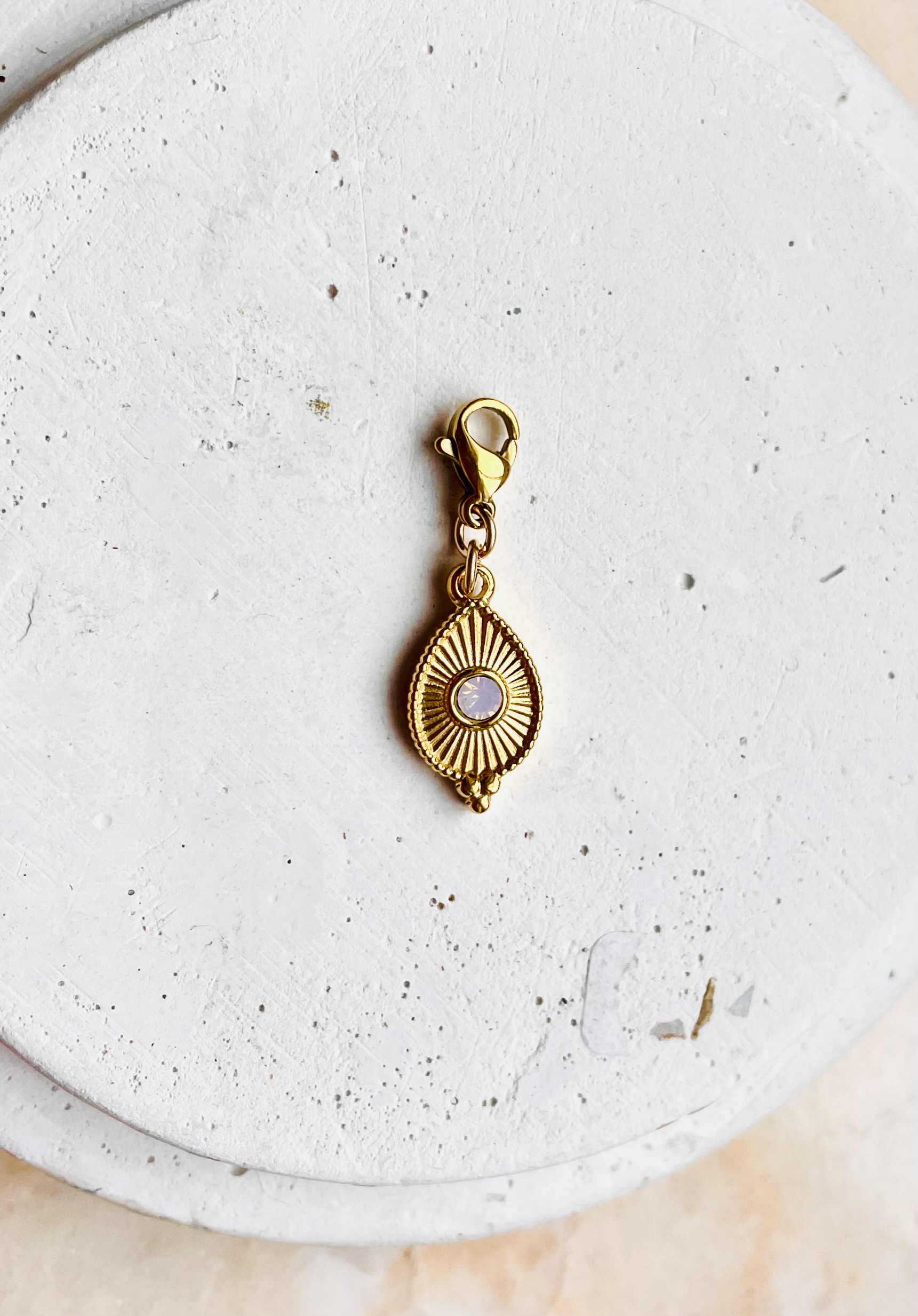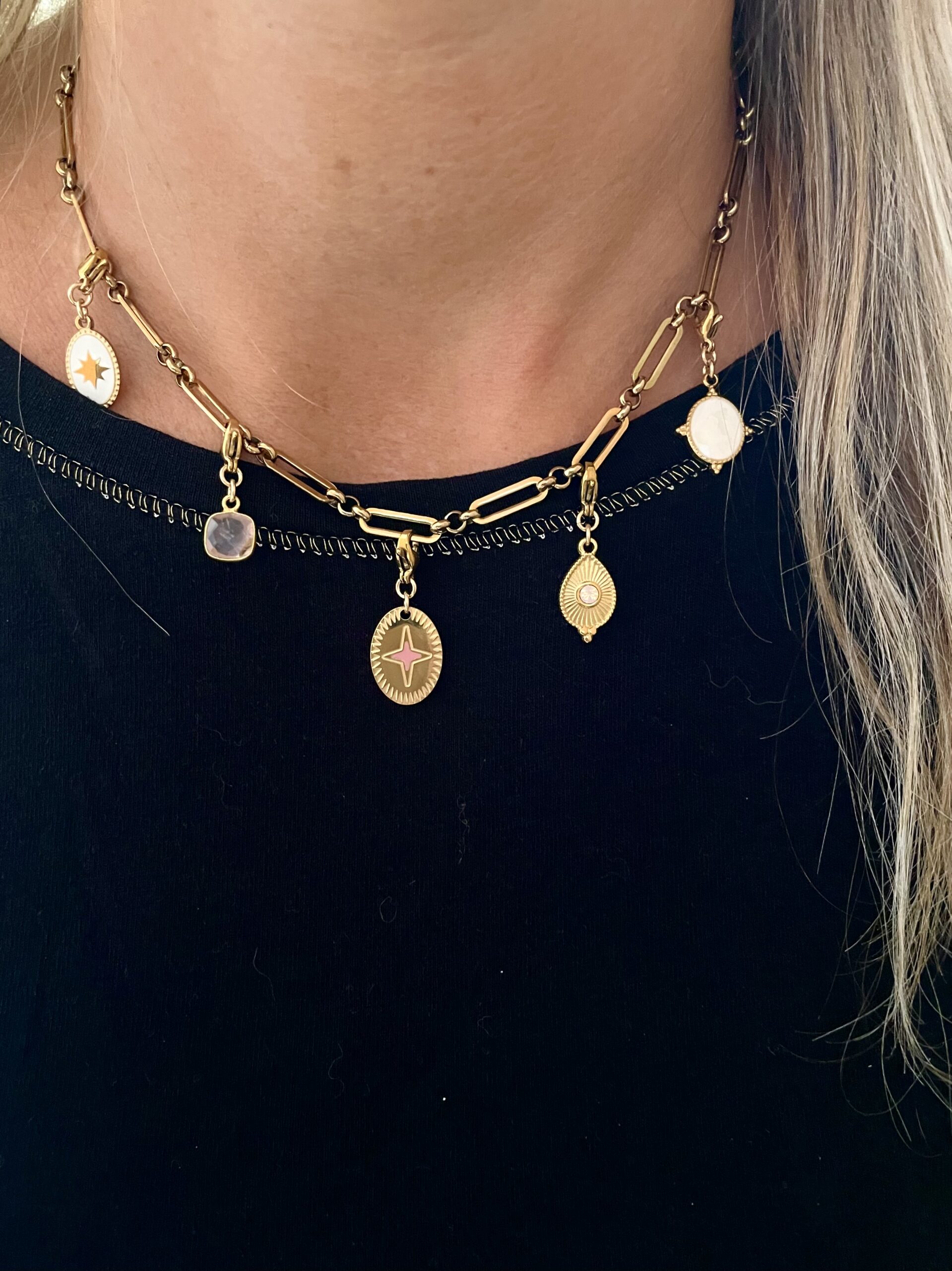 Ce pendentif a été assemblé dans notre atelier situé en Belgique. Il se compose d’éléments en acier inoxydable et zircon. Coloris: gold et rose pastel. L’embout est un mousqueton de 1cm de hauteur. Longueur: 3cm.