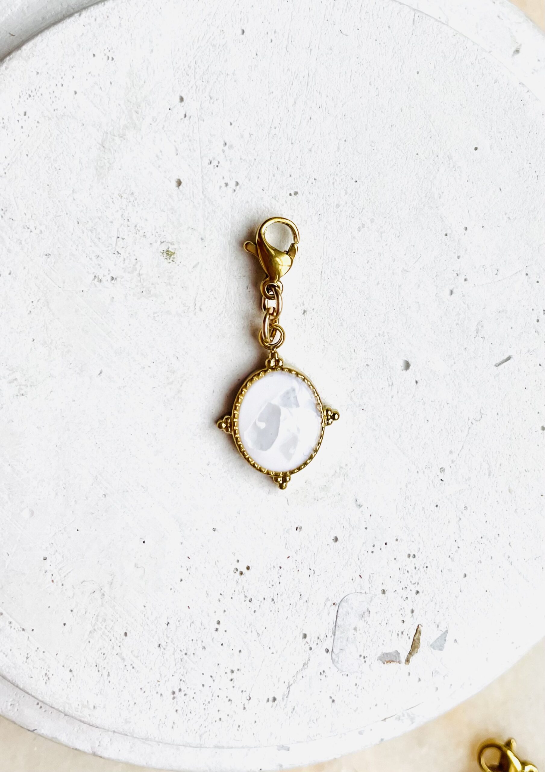 Ce pendentif a été assemblé dans notre atelier situé en Belgique. Il se compose d’éléments en acier inoxydable émaillé. Coloris: gold et blanc. L’embout est un mousqueton de 1cm de hauteur. Longueur: 3cm.