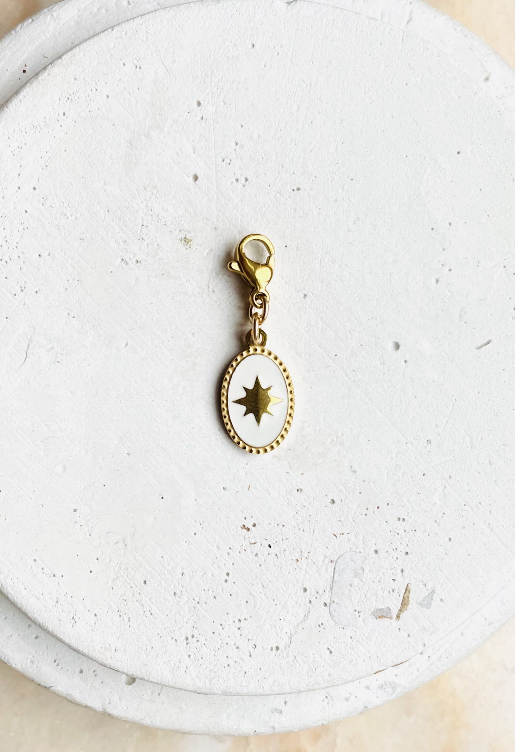 Ce pendentif a été assemblé dans notre atelier situé en Belgique. Il se compose d’éléments en acier inoxydable émaillé. Coloris: gold et blanc. L’embout est un mousqueton de 1cm de hauteur. Longueur: 2,6cm.