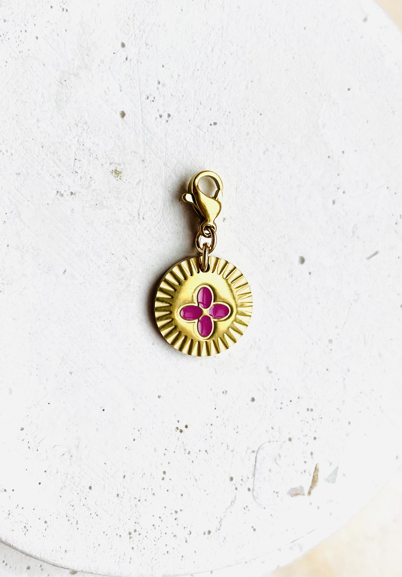 Ce pendentif a été assemblé dans notre atelier situé en Belgique. Il se compose d’éléments en acier inoxydable émaillé. Coloris: gold et rose. L’embout est un mousqueton de 1cm de hauteur. Longueur: 2,5cm.