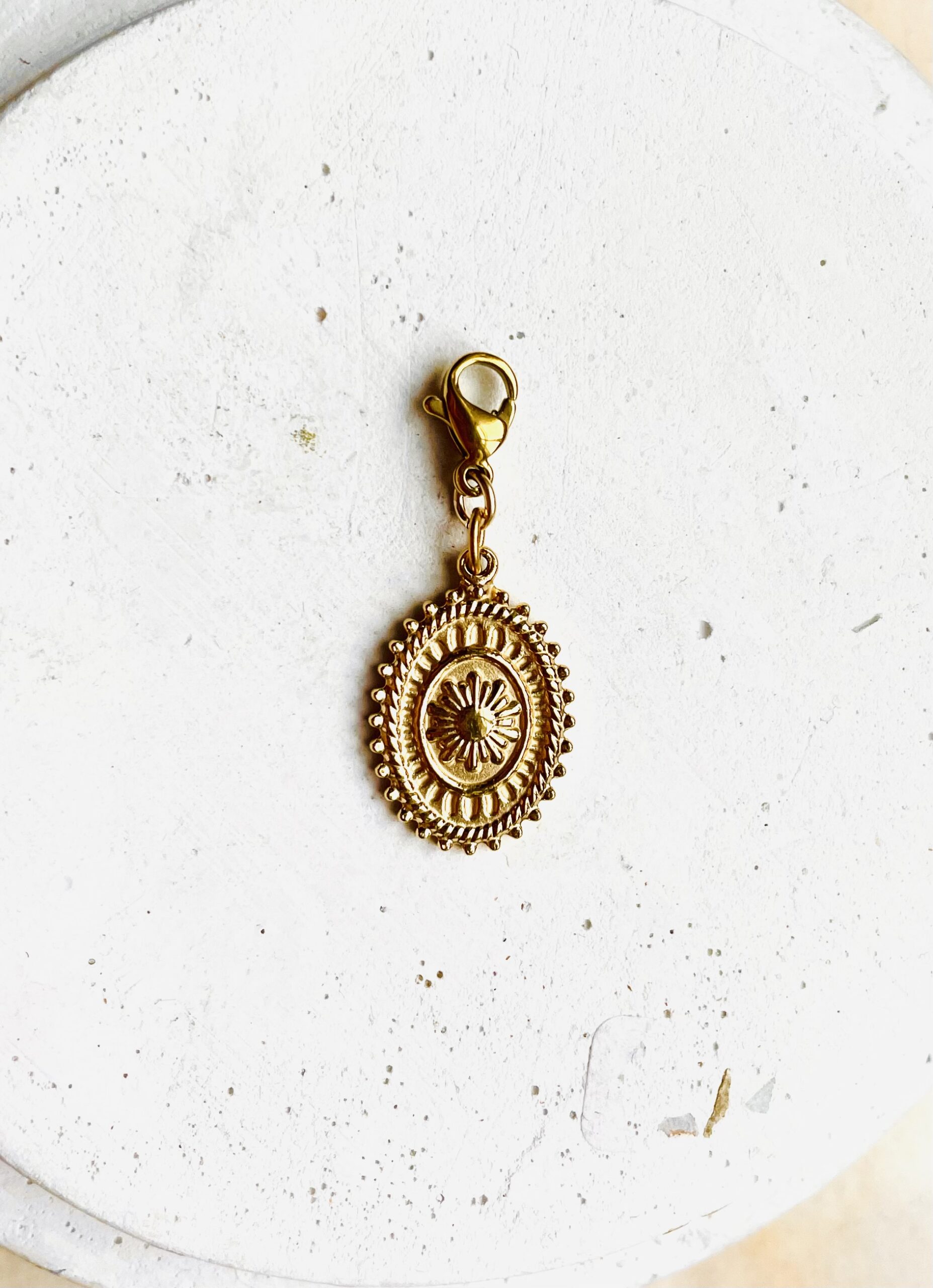 Ce pendentif a été assemblé dans notre atelier situé en Belgique. Il se compose d’éléments en acier inoxydable. Coloris: gold. L’embout est un mousqueton de 1cm de hauteur. Longueur: 3,2cm.
