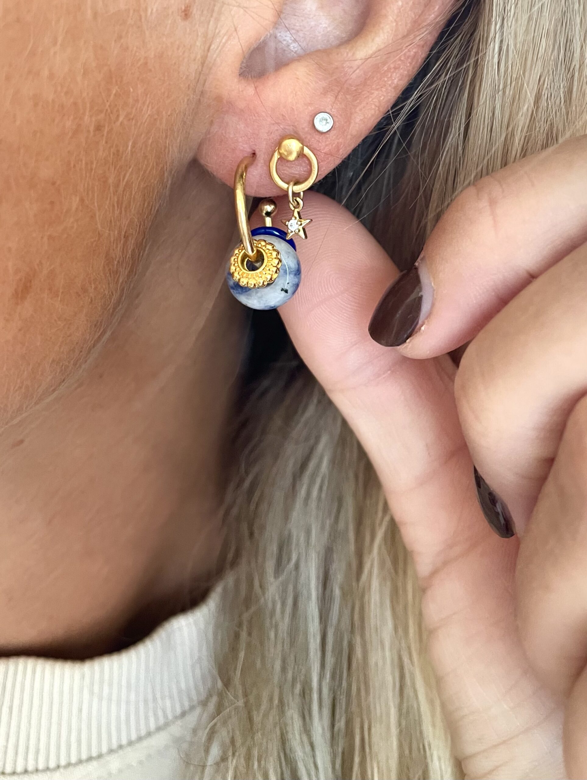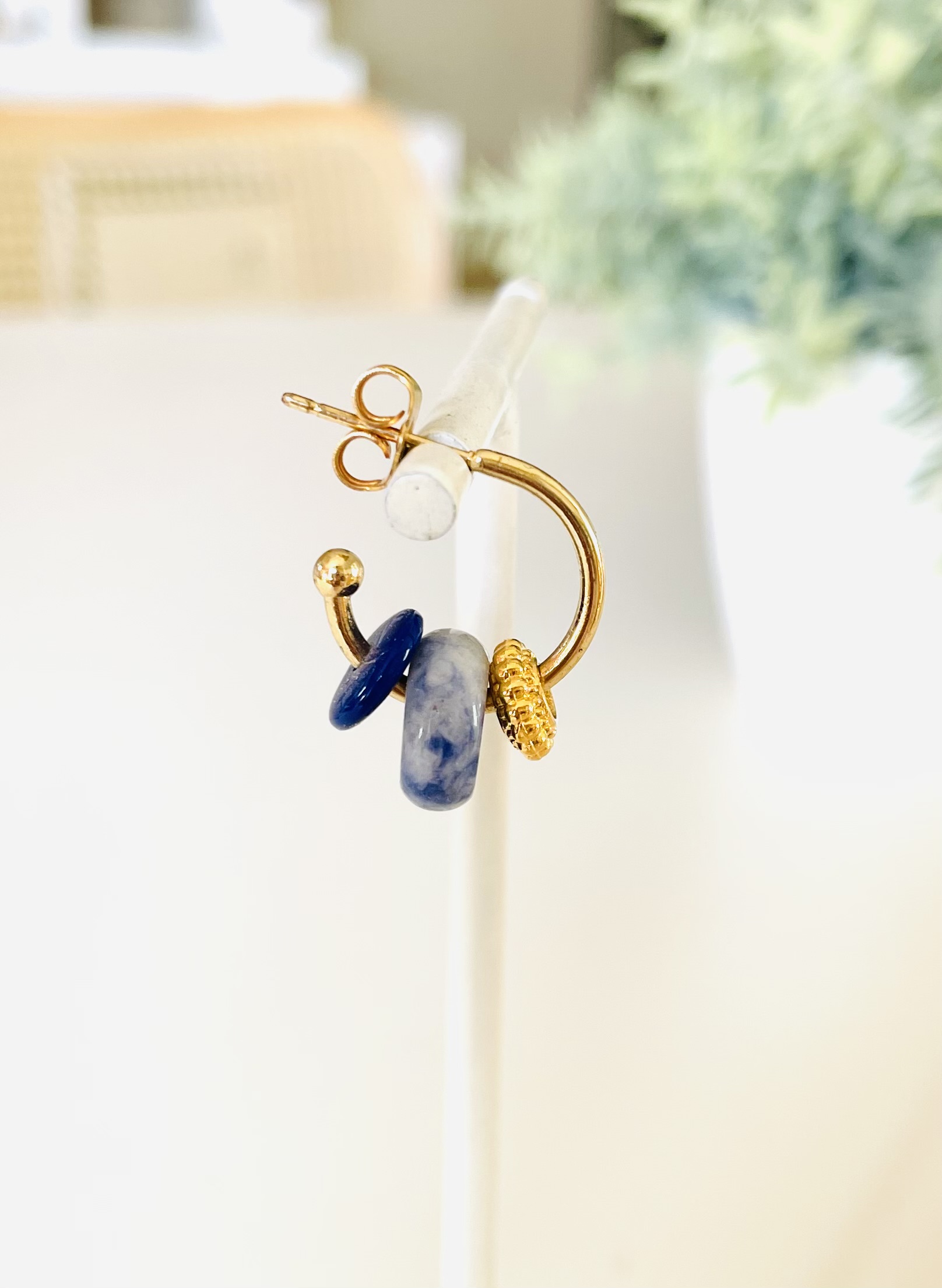 Cette jolie créole a été fabriquée à la main et en série limitée dans notre atelier situé en Belgique. Elle se compose d’une base en acier inoxydables et de donuts en pierre, en résine et en plaqué or. Longueur: 2.3cm. Coloris: bleu et gold.
