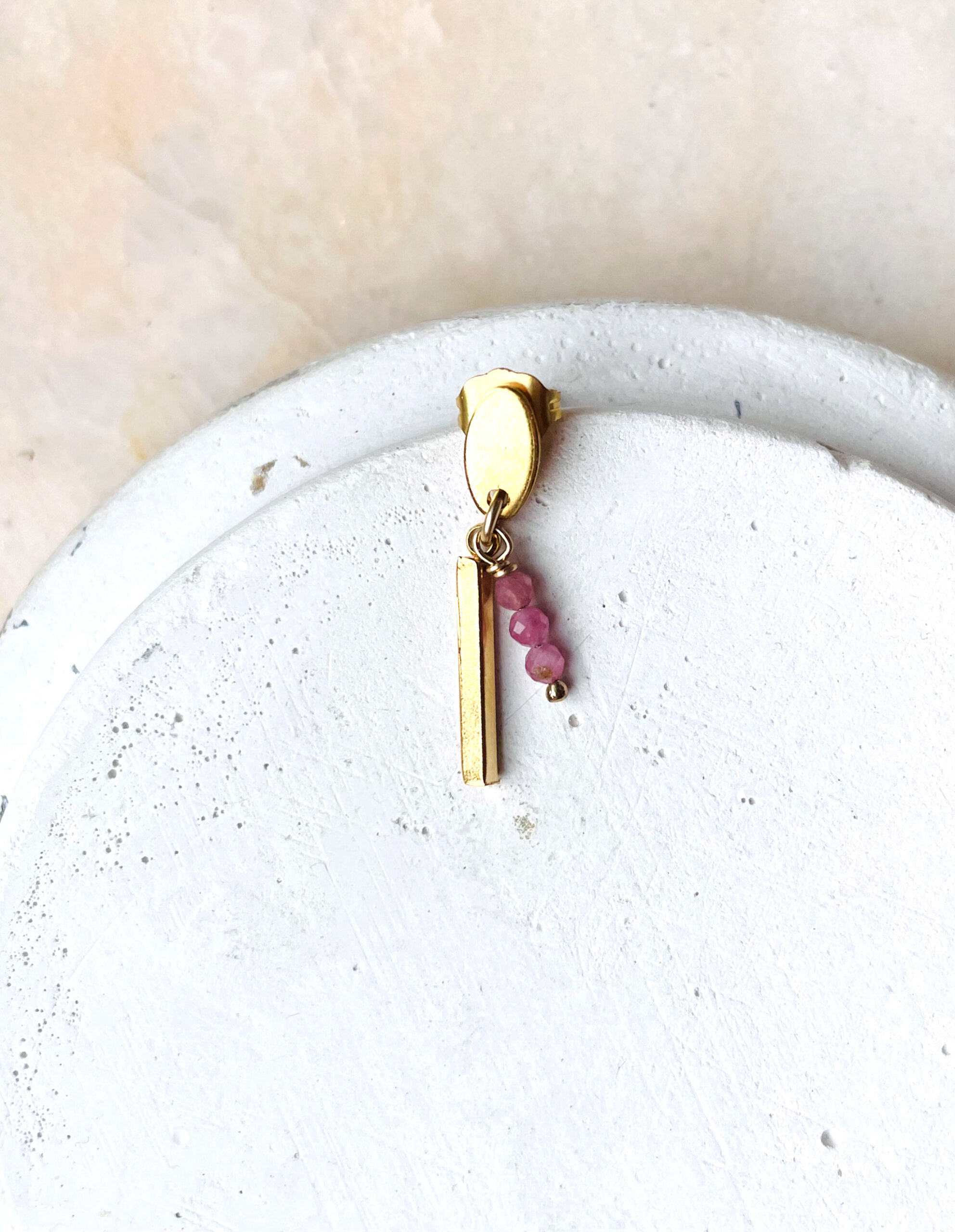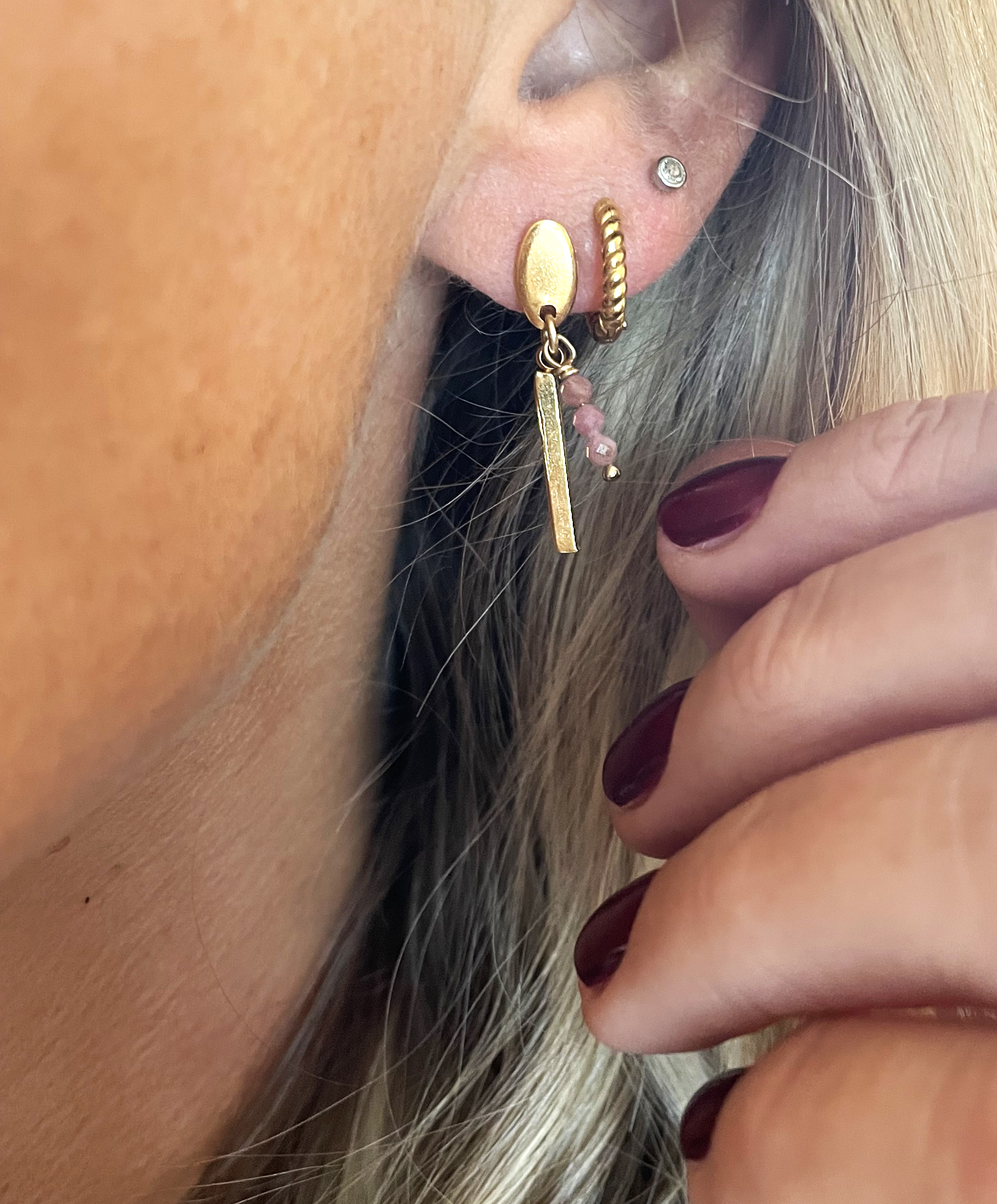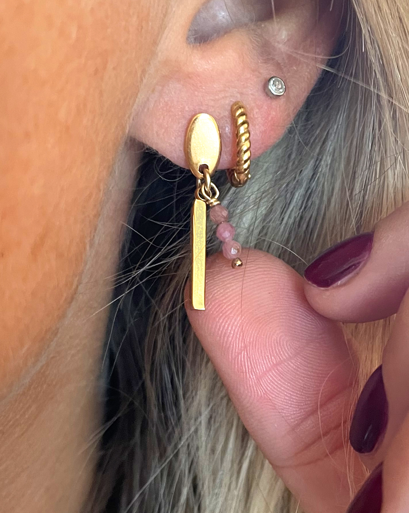 Cette monoboucle a été réalisée à la main et en série limitée dans notre atelier situé en Belgique. Elle se compose d’une base en laiton plaqué or, d’un élément en acier inoxydable, de perles en pierre. Longueur: 2,6cm Coloris: rose t et gold.