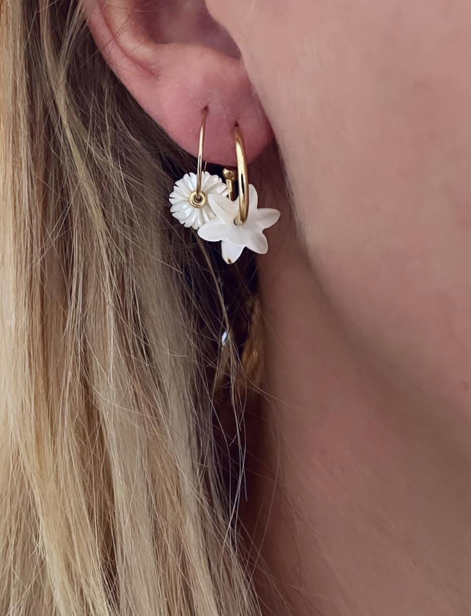 Cette monoboucle a été réalisée dans notre atelier en série limitée. Elle se compose d’une base en laiton plaqué or et d’une fleur en nacre. Longueur: 2cm. Coloris: nacre et gold. C’est la plus grande créole des deux (voir photo), celle qui est dans le 1er trou.