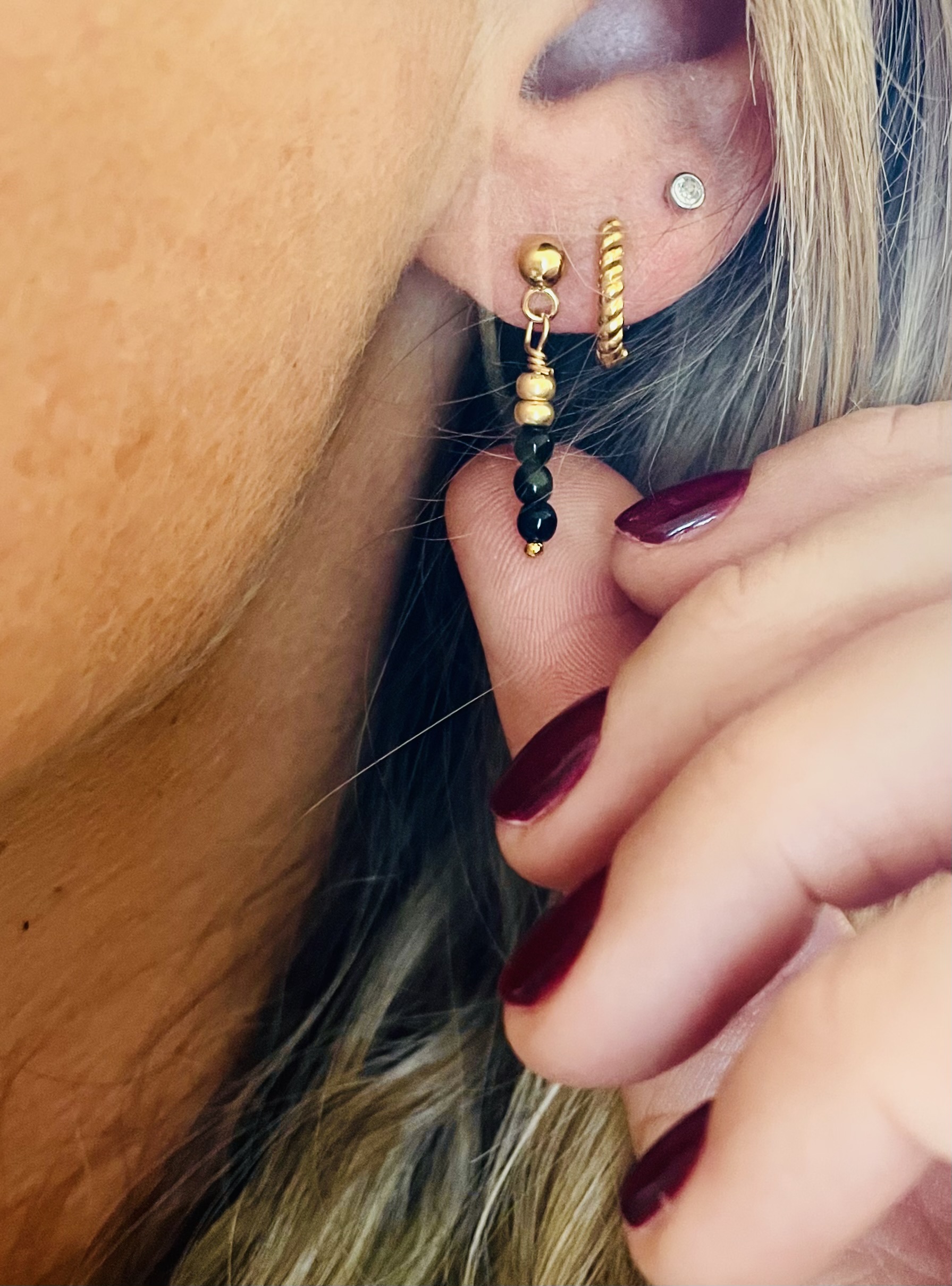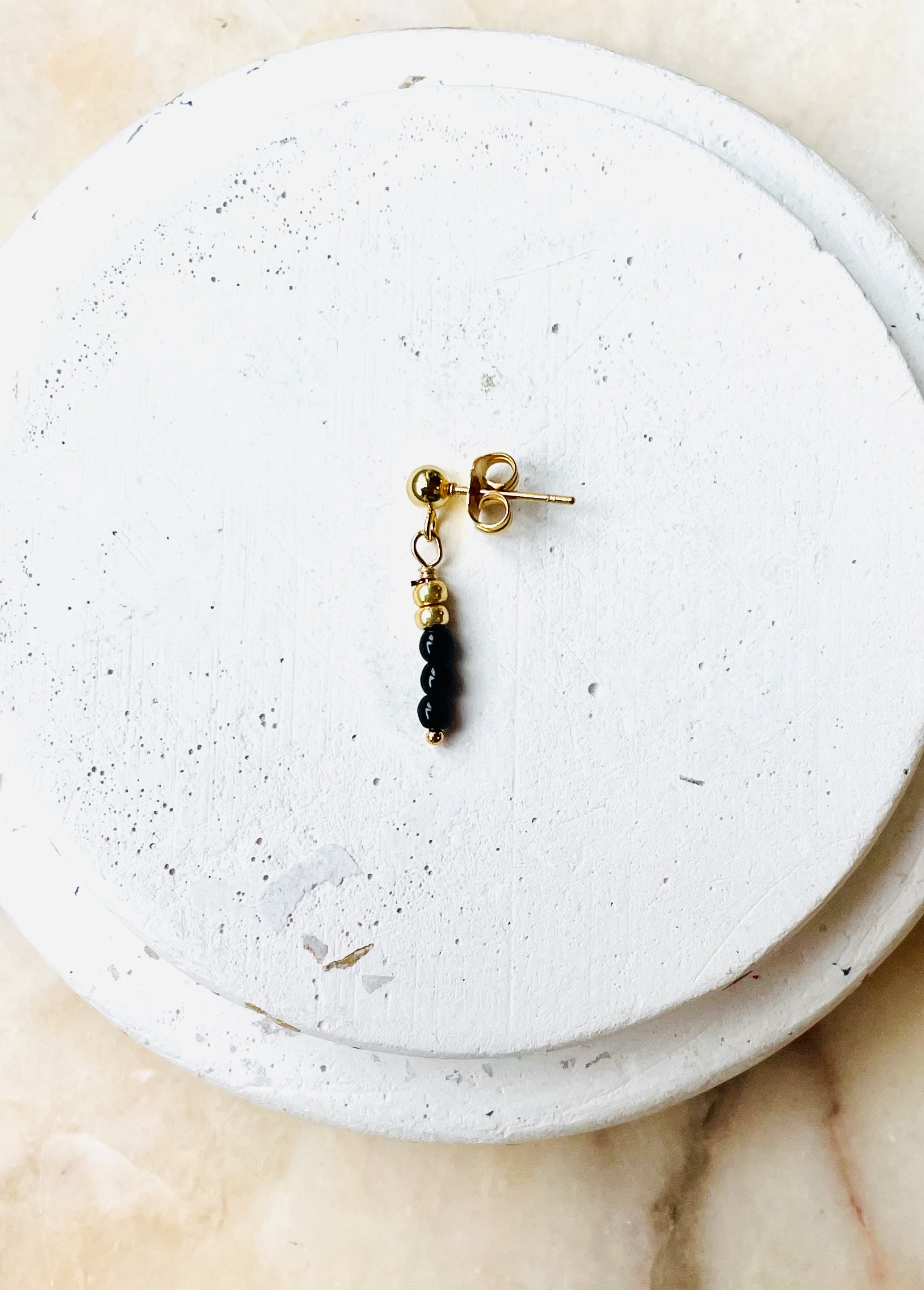 Cette monoboucle a été réalisée à la main et en série limitée dans notre atelier situé en Belgique. Elle se compose d’une base en acier inoxydable et de perles en verre . Longueur: 2cm. Coloris: noir et gold.