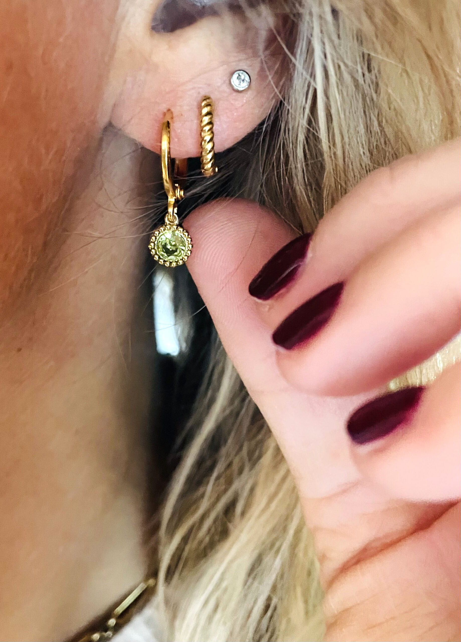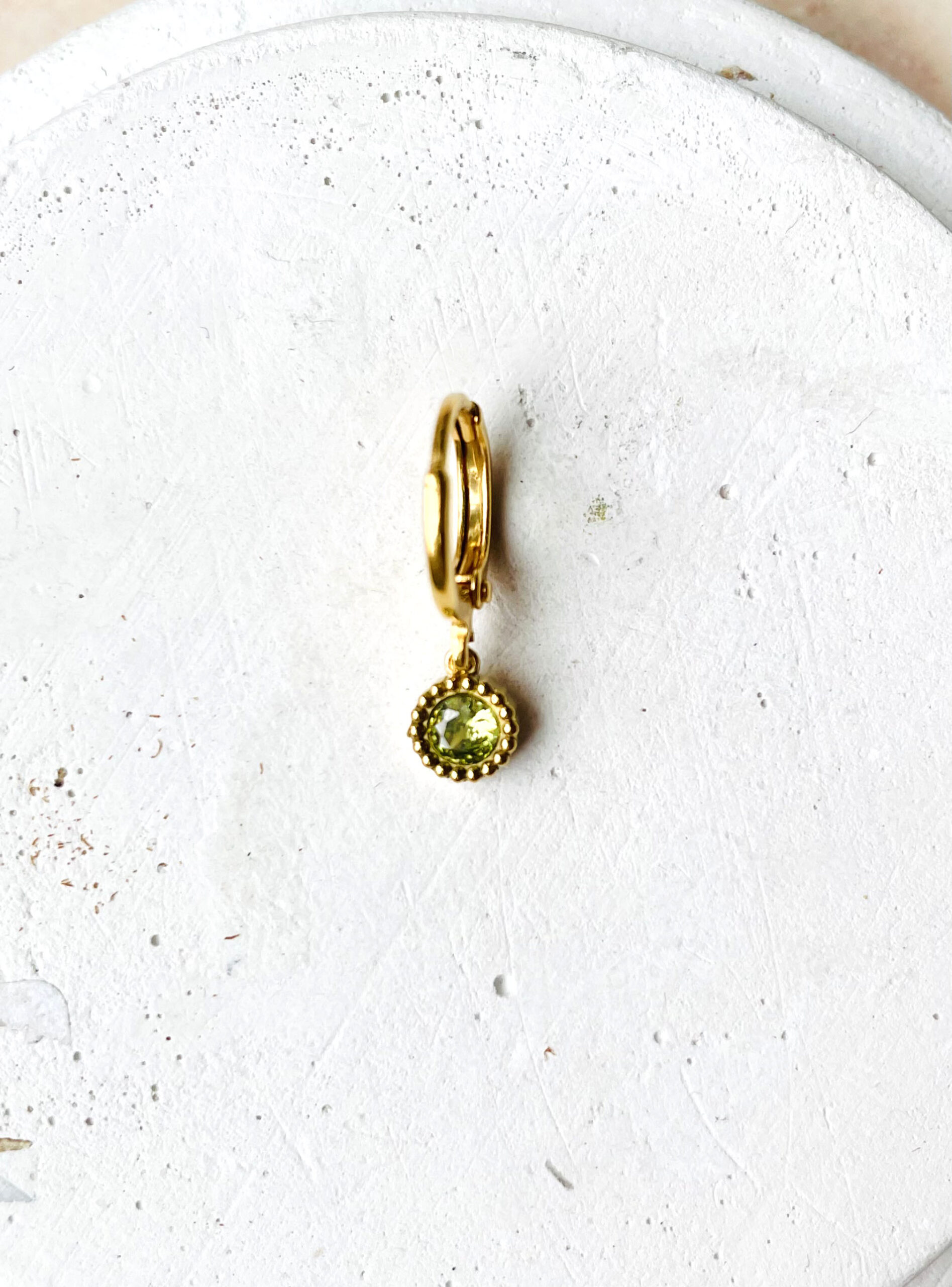 Cette créole a été montée à la main et en série limitée dans notre atelier situé en Belgique. Longueur: 1,8cm. Elle se compose d’une base dorée à l’or fin et d’une breloque en zircon et acier inoxydable. Coloris: kaki et gold.