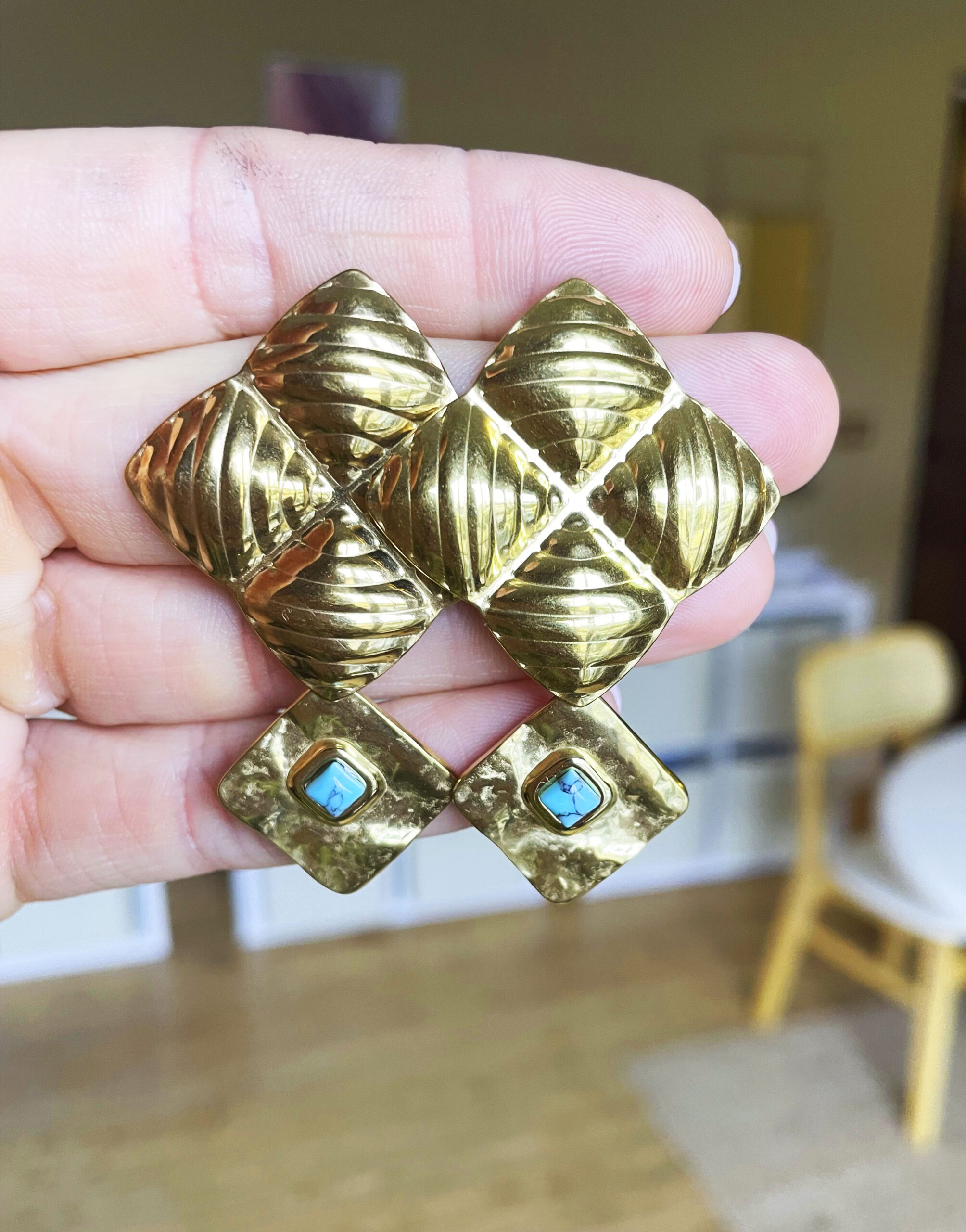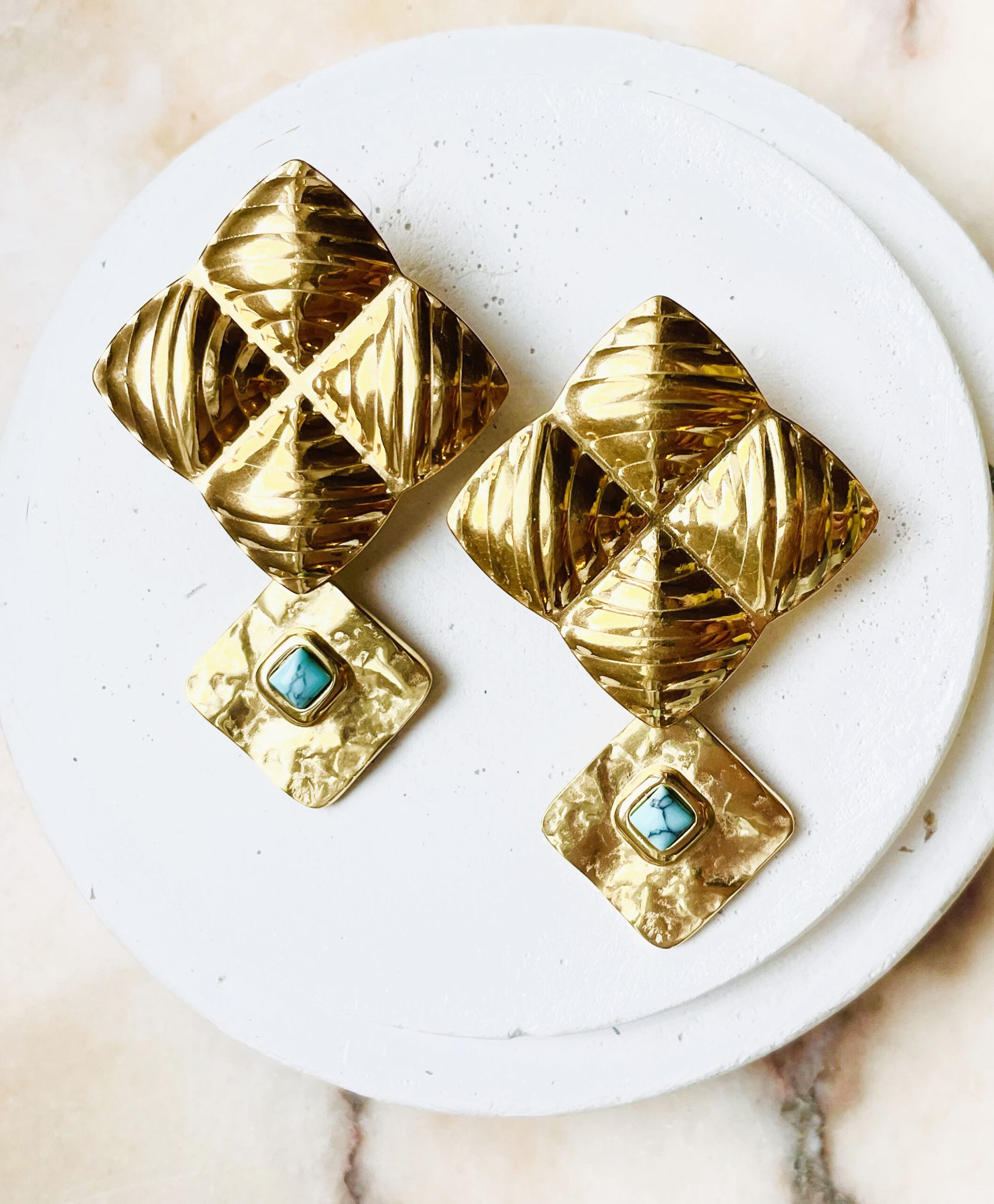 Cette paire de boucles d’oreille a été réalisée à la main et en série limitée dans notre atelier situé en Belgique. Elle se compose d’éléments en acier inoxydable et de cabochons en pierre (en turquoise). Longueur: 5,6cm. Coloris: turquoise avec parfois de petites veines grises dans la pierre et gold. Elles sont très légères.