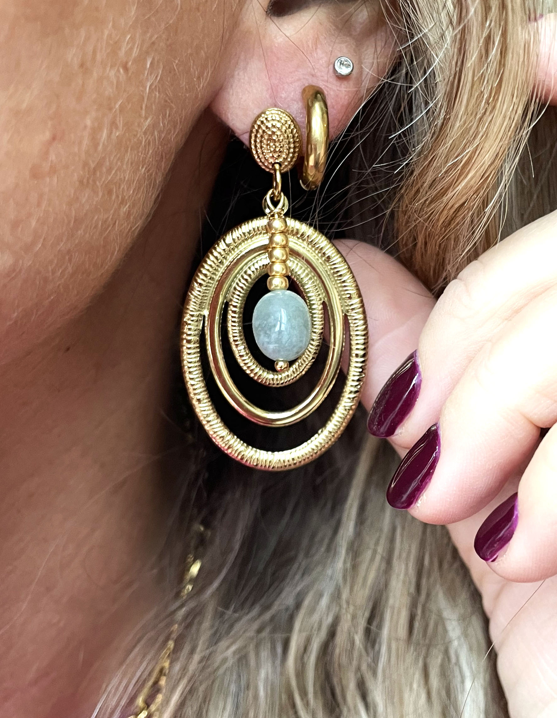 Cette paire de boucles d’oreille a été réalisées à la main et en série limitée dans notre atelier situé en Belgique. Elle se compose de perles en jade et d’éléments en acier inoxydable. Longueur: 5,5cm. Coloris:  vert d’eau, gold.