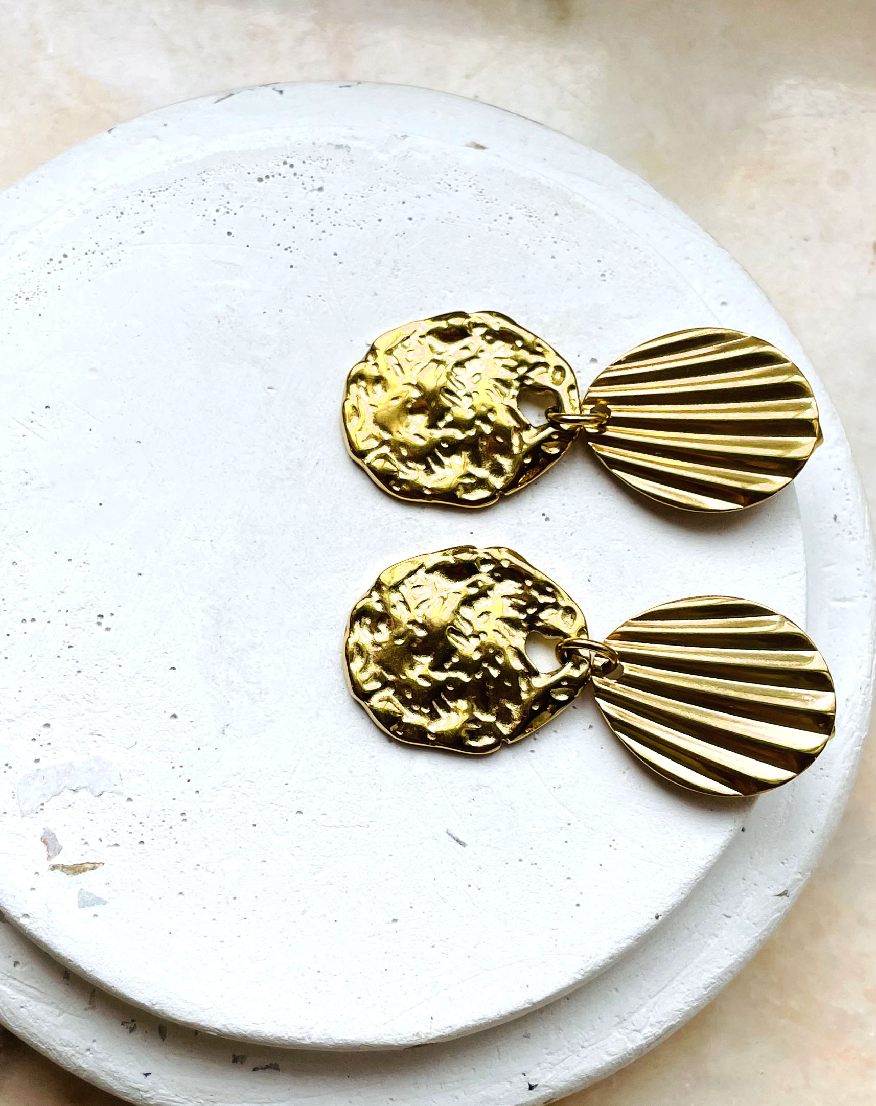 Cette paire de boucles d’oreille a été fabriquée à la main et en série limitée dans notre atelier situé en Belgique. Elle se compose d’élément en acier inoxydable. Coloris: gold. Longueur: 4,5cm.