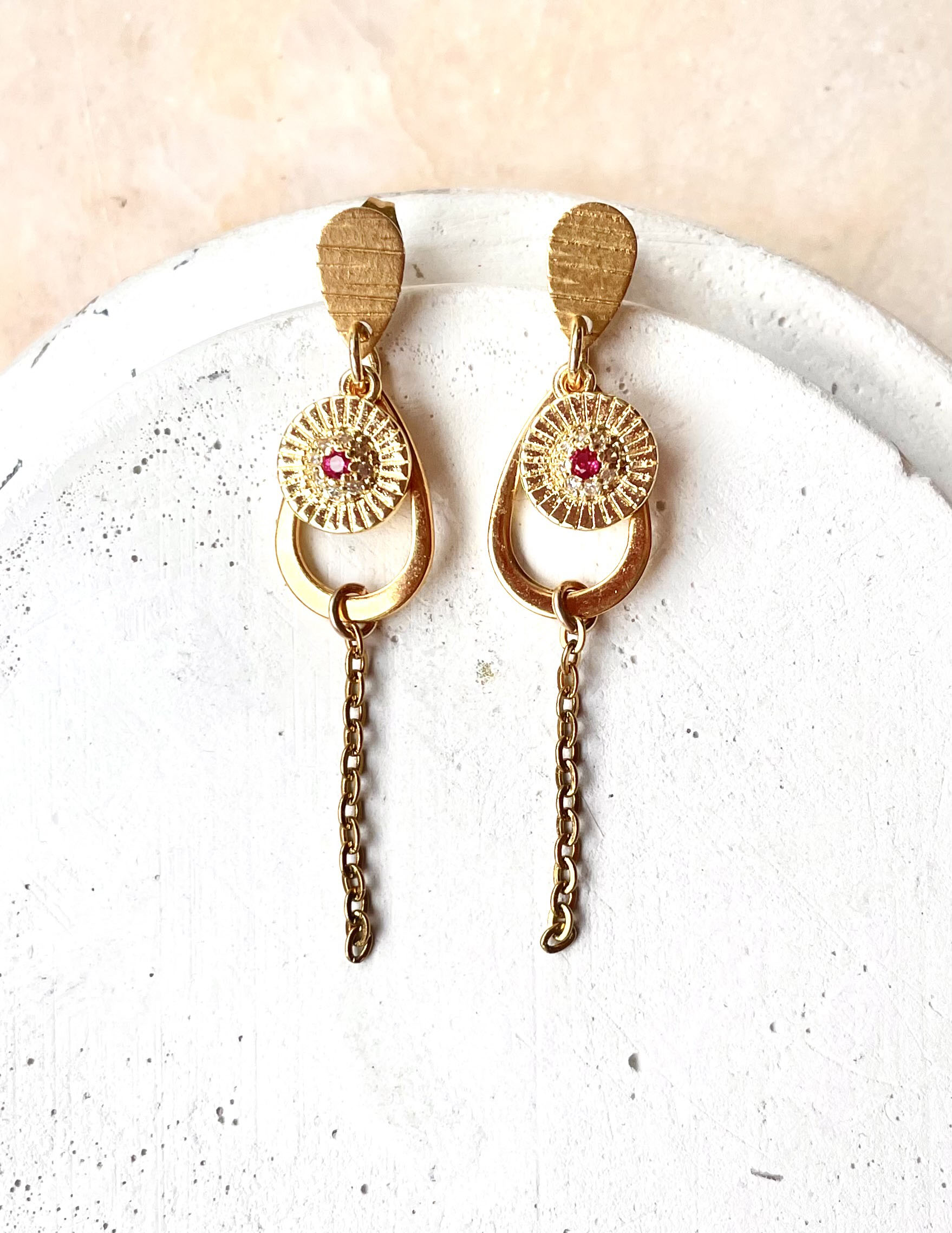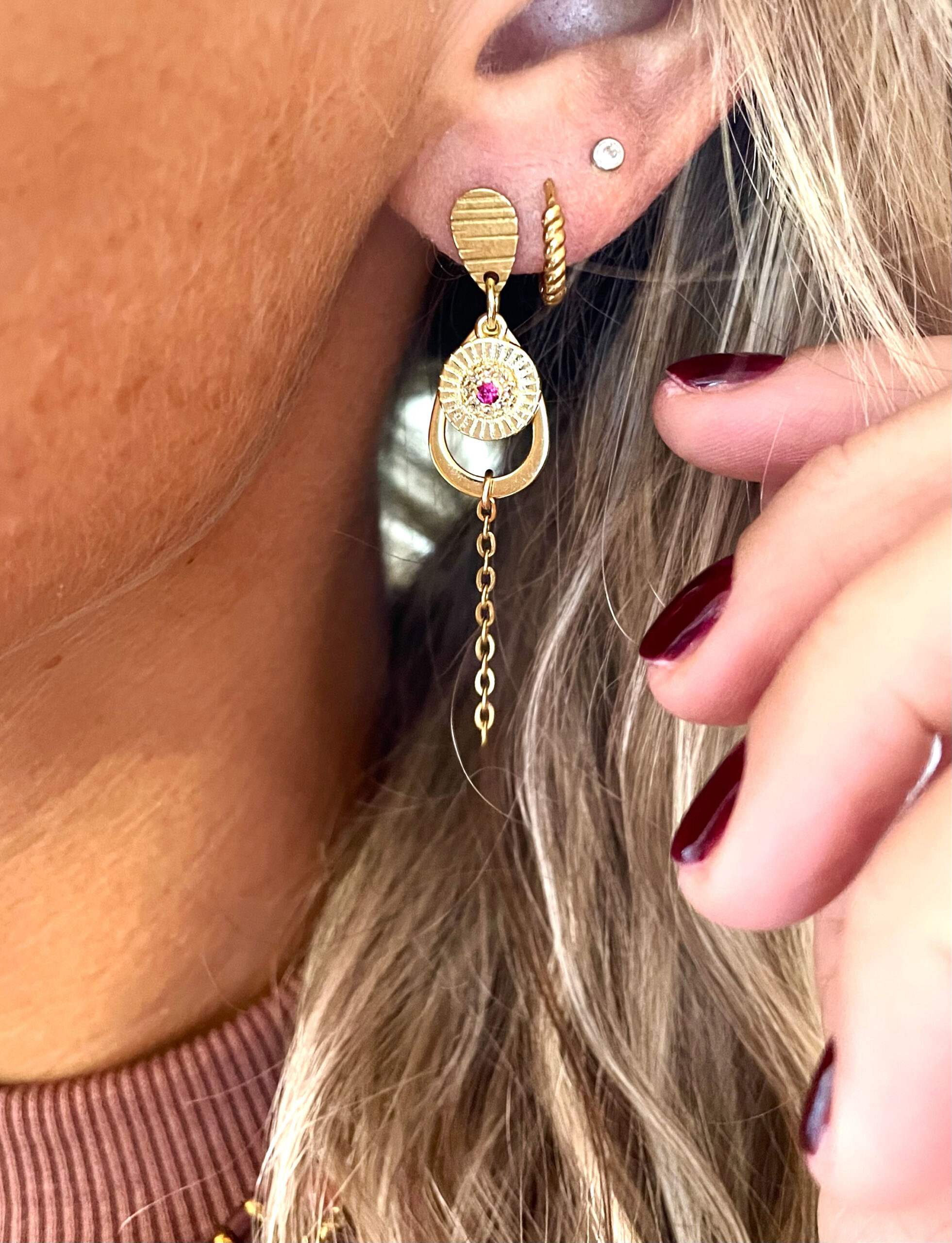 Cette paire de boucles d’oreille a été réalisée à la main et en série limitée dans notre atelier situé en Belgique. Elle se compose d’une base en acier inoxydable et d’une breloque aurifiée avec un zircon. Coloris: fushia, gold. Longueur: 5cm.