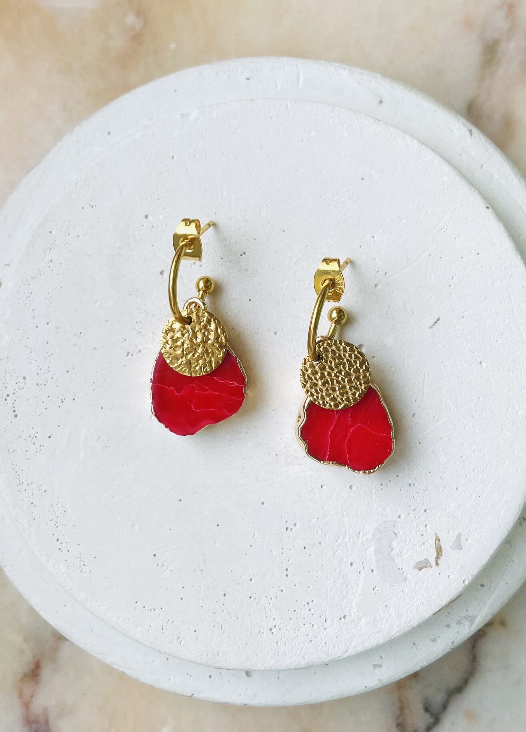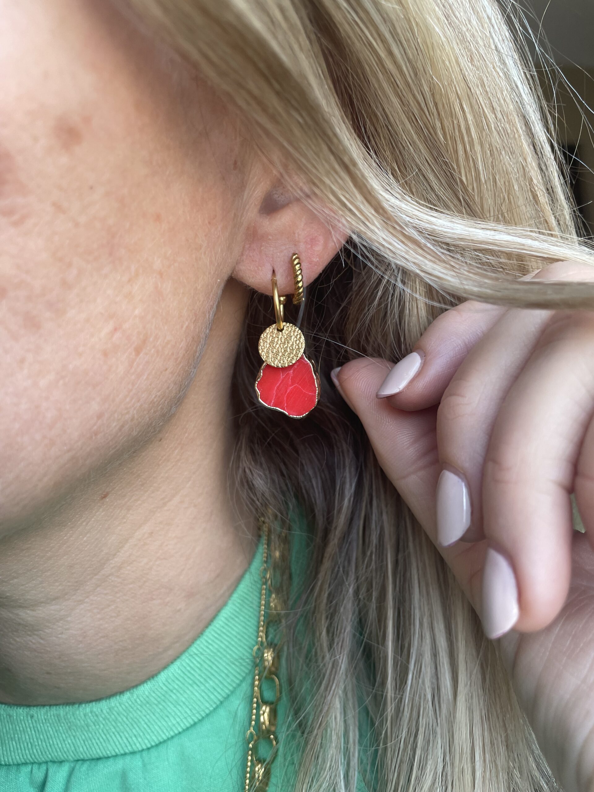 Cette paire de créoles a été réalisée à la main et en série limitée dans notre atelier situé en Belgique. Elle se compose d’éléments en acier inoxydable et de résine imitation pierre. Coloris: rouge orangé, gold.