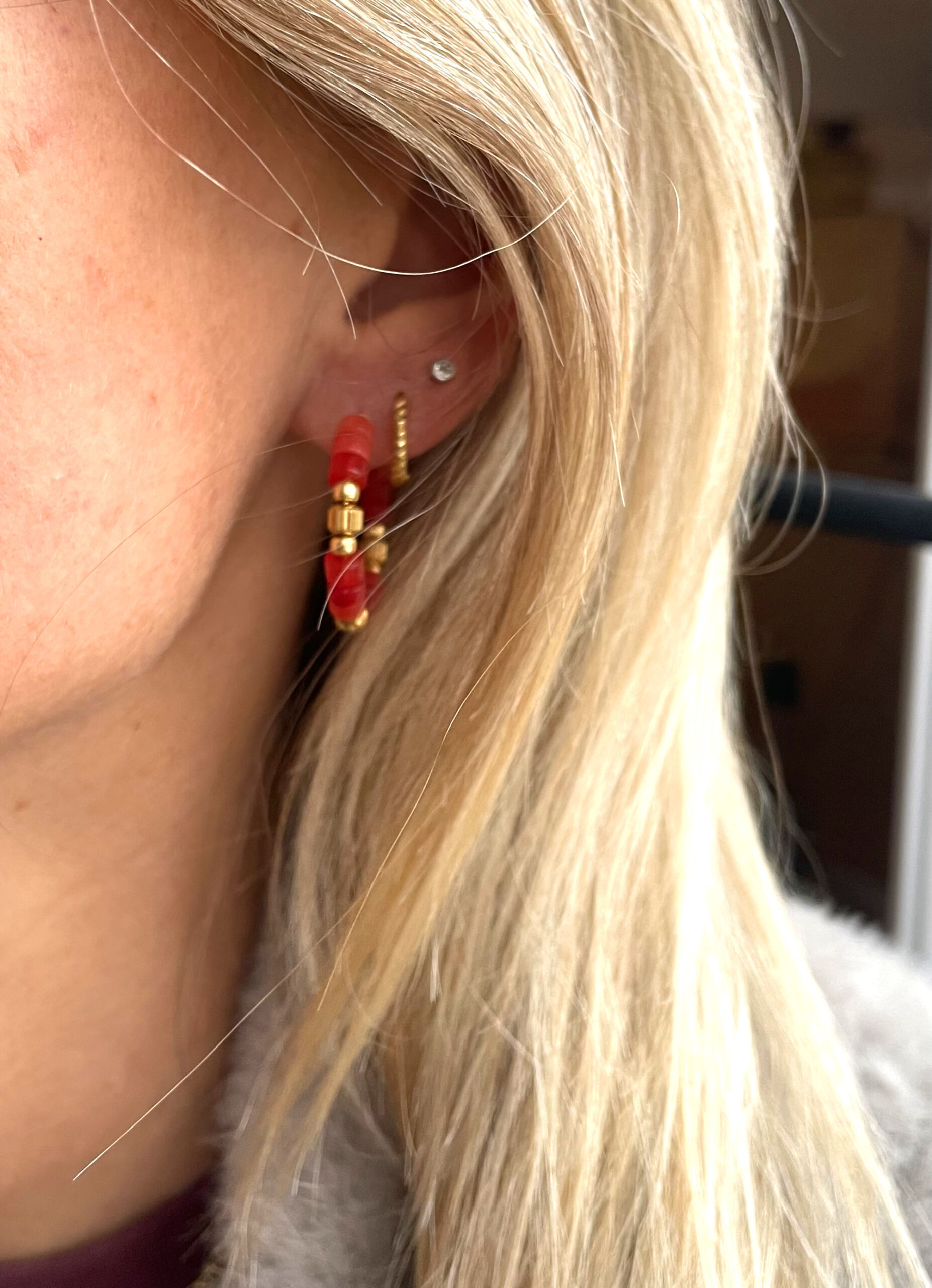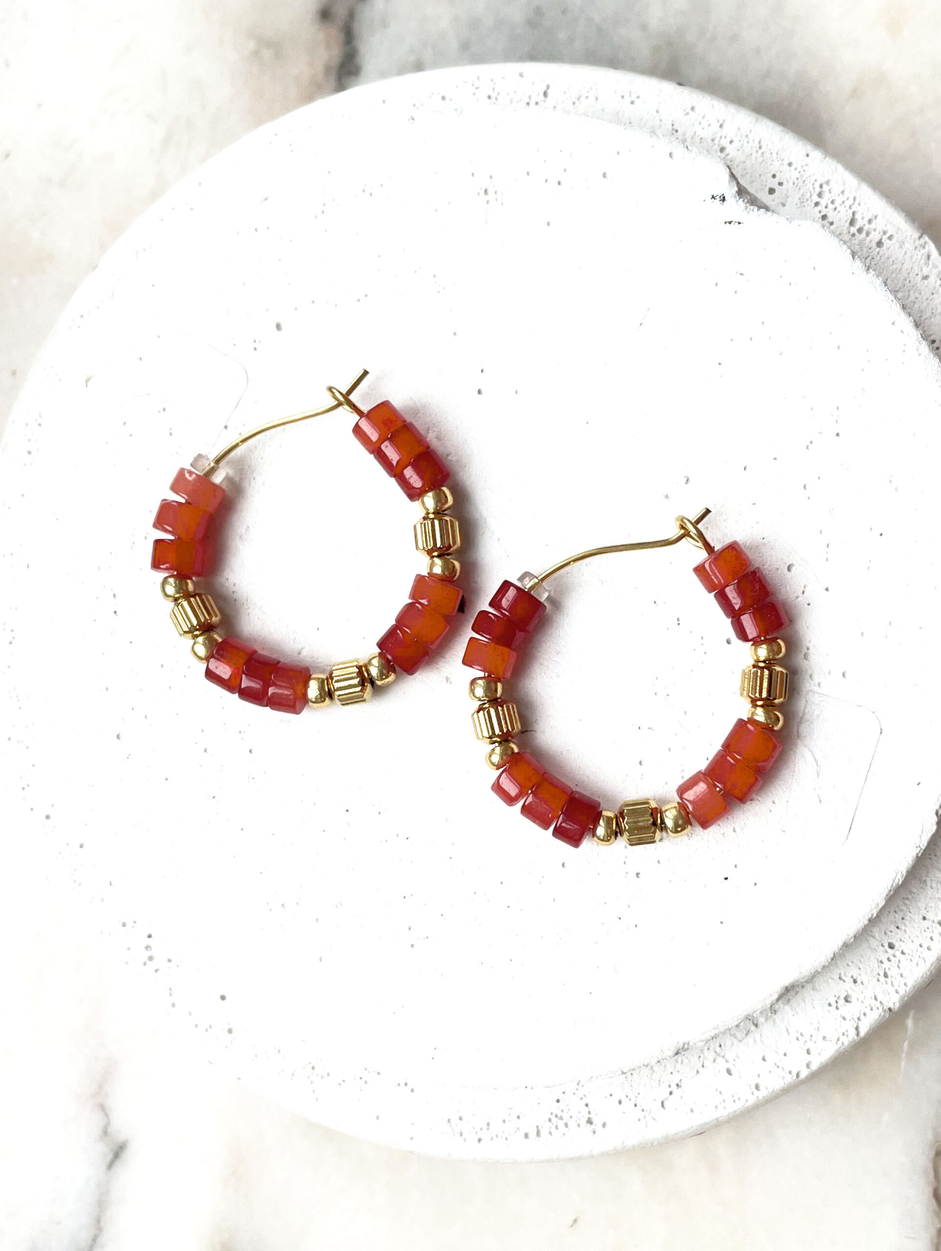 Cette jolie paire de créoles a été réalisée à la main et en série limitée dans notre atelier situé en belgique. Elle se compose de perles en pierres de tourmaline et d’acier inoxydable. Coloris: rouge orangé et gold. Diamètre: 2,6cm.