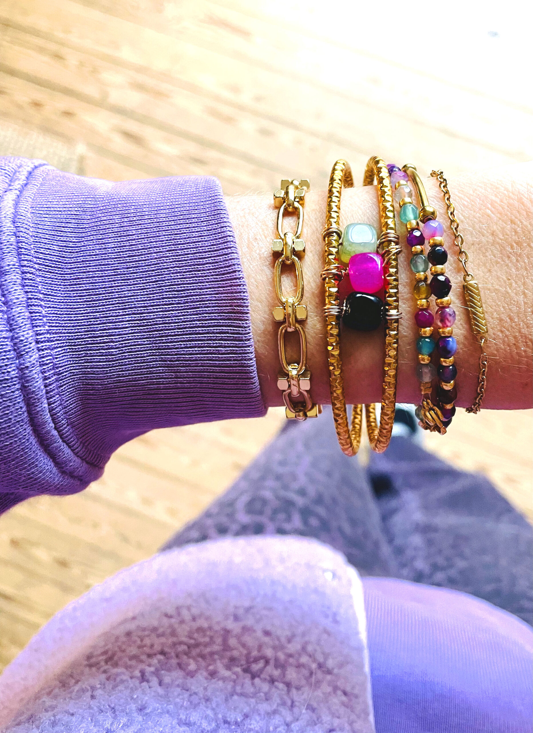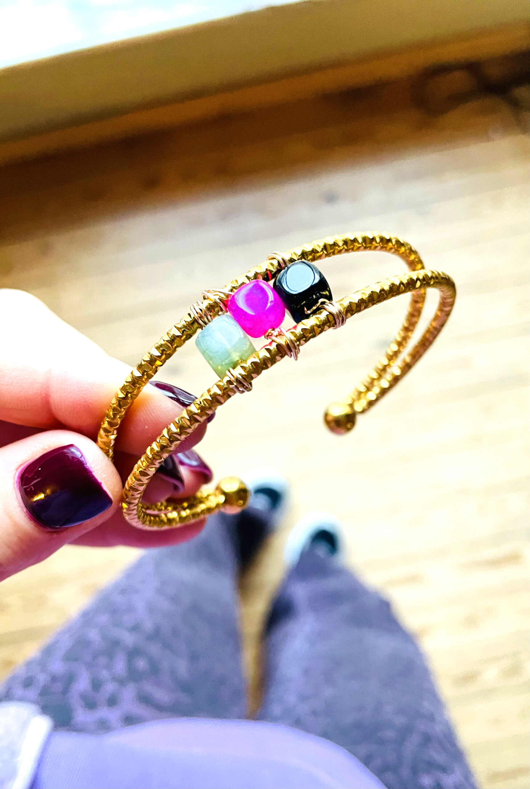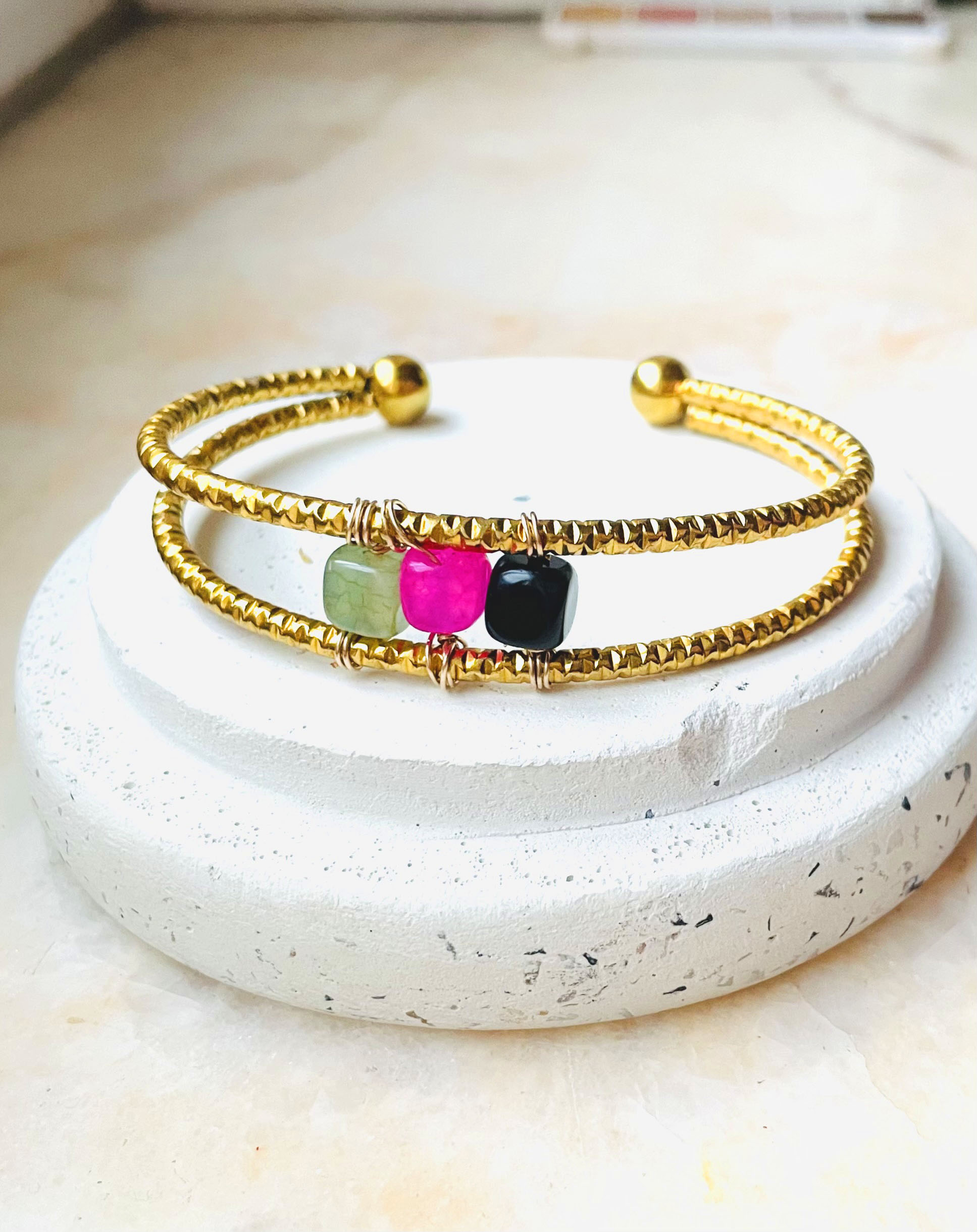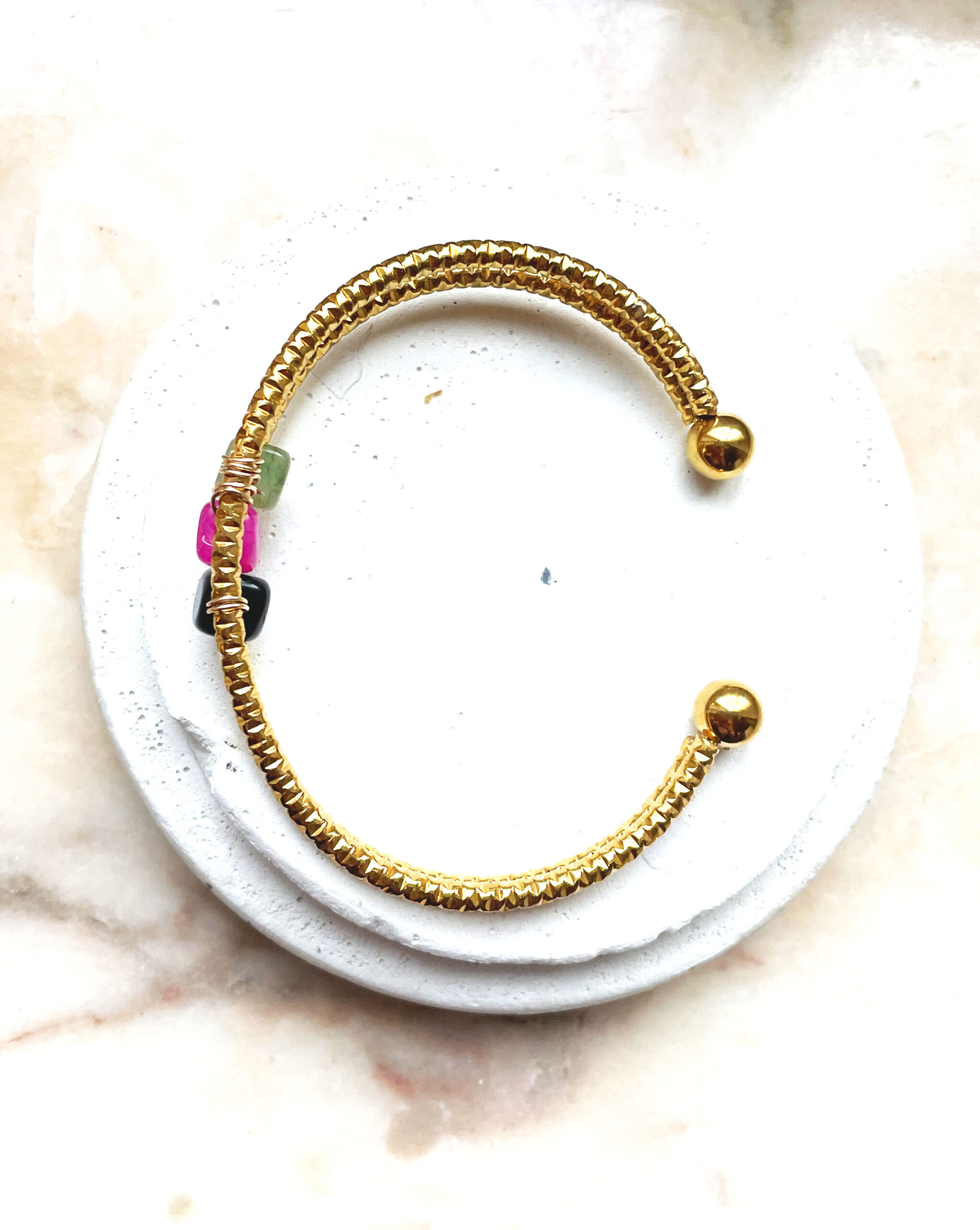 Ce jonc a été réalisé à la main et en série limitée dans notre atelier situé en Belgique. Il se compose d’une base en acier inoxydable recouvert d’une couche dorée et de pierres cubiques en jade et agate. Coloris: vert, noir, fushia et gold. Taille: 7cm > 5,5cm. Convient plutôt à un poignet de 17cm à 20cm si vous aimez qu’il ne bouge pas. Evitez le contact l’eau pour que la couche dorée ne ternisse pas et que les couleurs des pierres ne bougent pas.