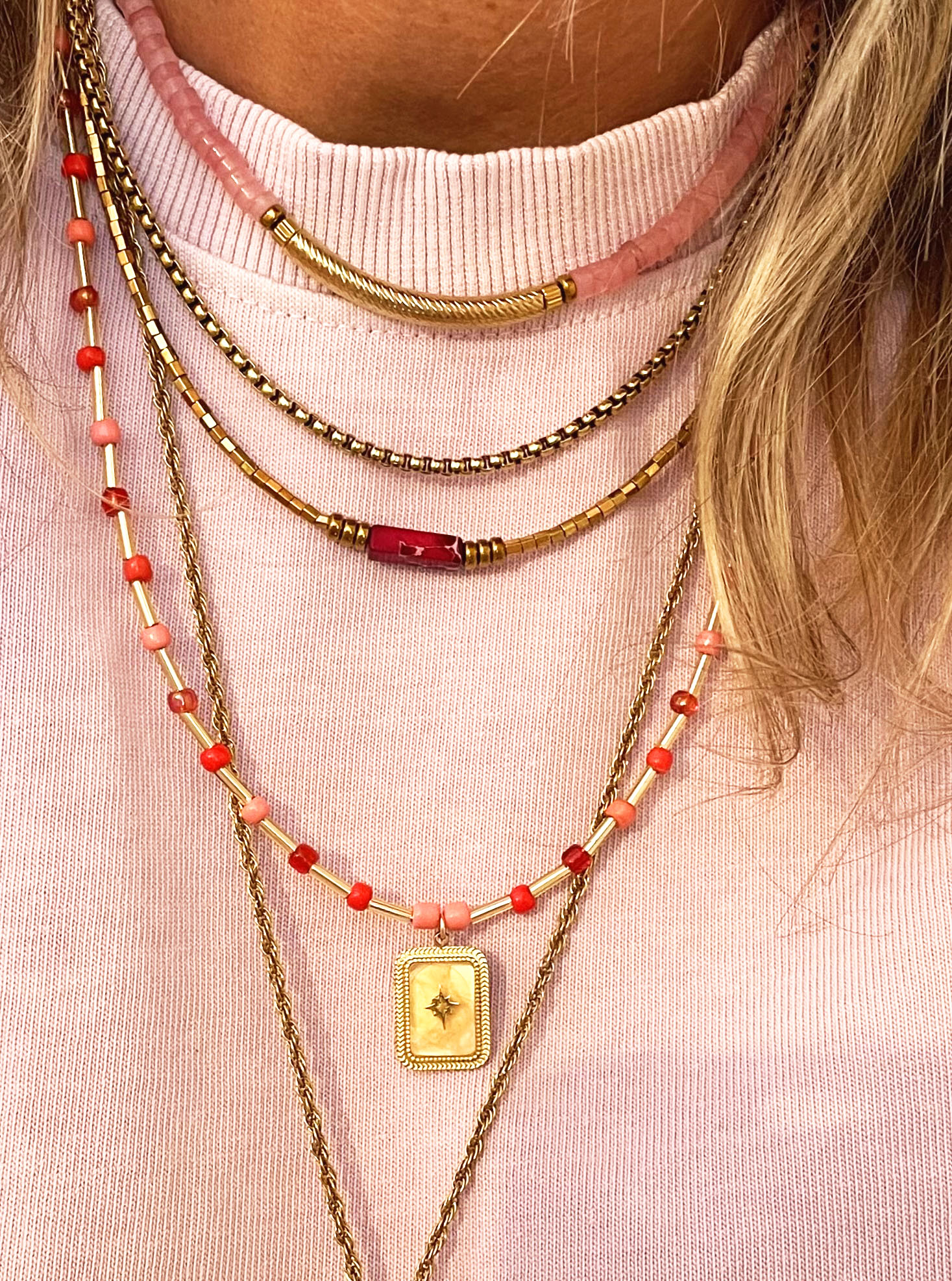 Ce collier a été fabriqué à la main et en série limitée dans notre atelier situé en Belgique. Il se compose de perles en verre et en pierres et d’un pendentif en acier inoxydable et pierre (quartz rose). Coloris: roe pastel, corail, rouge, bordeaux et gold. Longueur: +/- 52cm > 57cm.