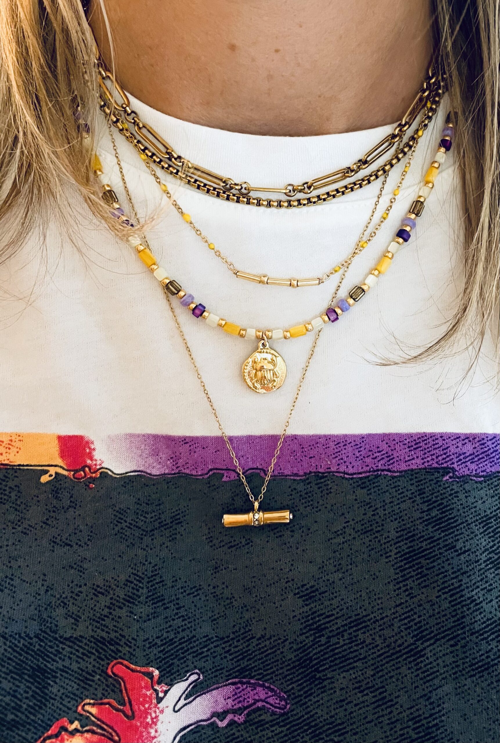 Ce collier a été produit à la main et en série limitée dans notre atelier situé en Belgique Il se compose d’éléments en acier inoxydable et de perles de verre. Coloris: jaune, gold. Longueur: 37cm > 42cm.