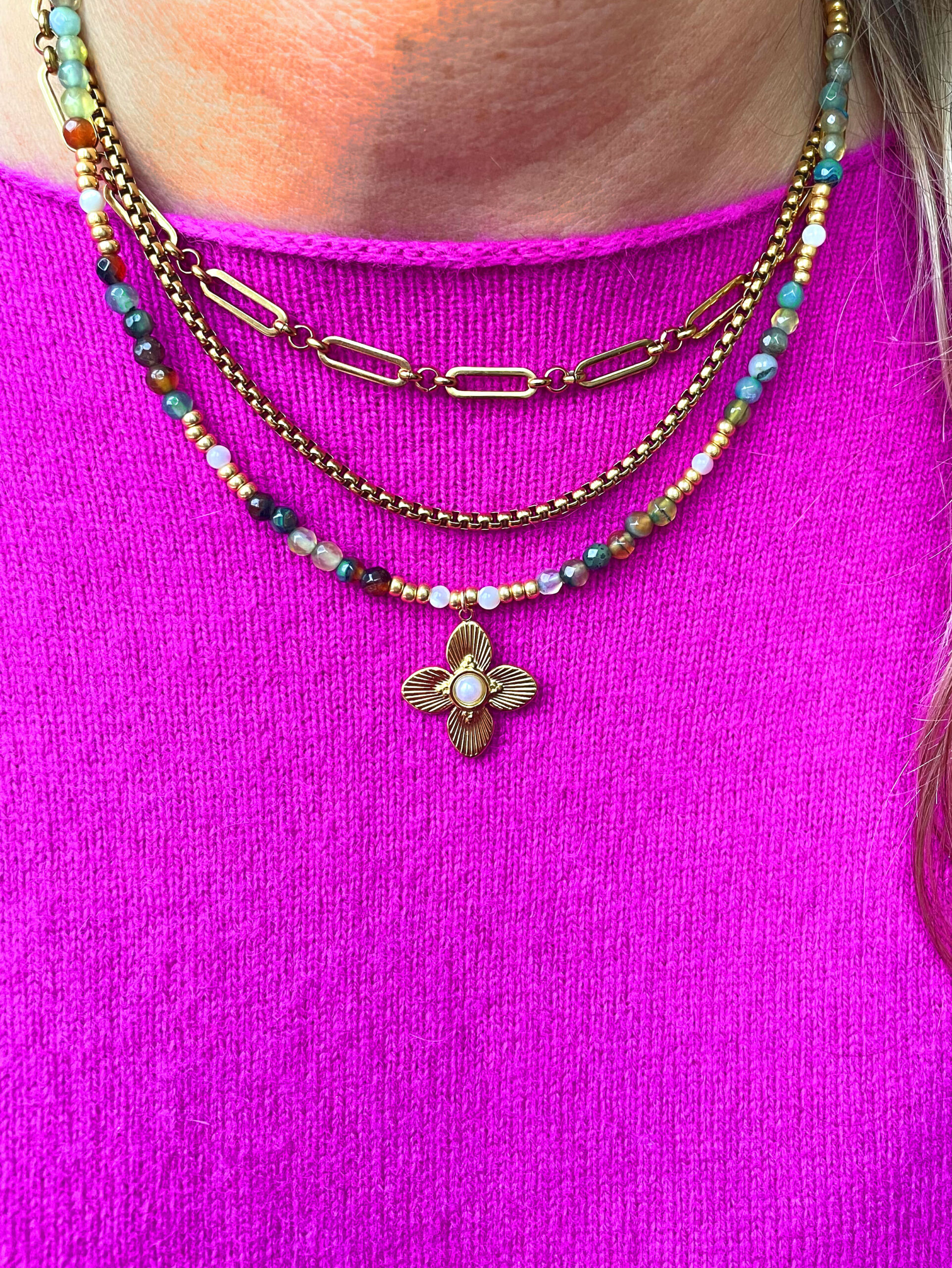 Ce collier a été réalisé à la main et en série limitée dans notre atelier situé en Belgique. Il se compose de perles en agate, en verre et d’éléments en acier inoxydable. Longueur: 42cm > 47cm. Coloris: vert, marron, ocre, gold, nacre.