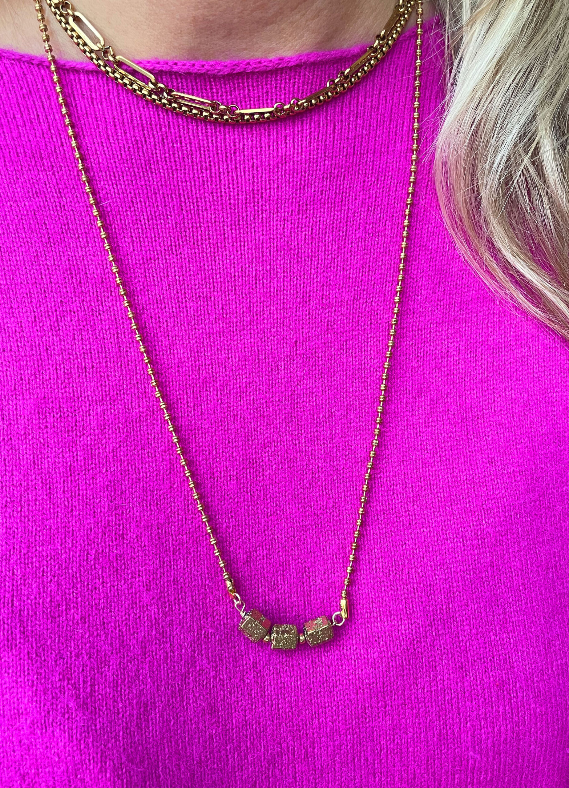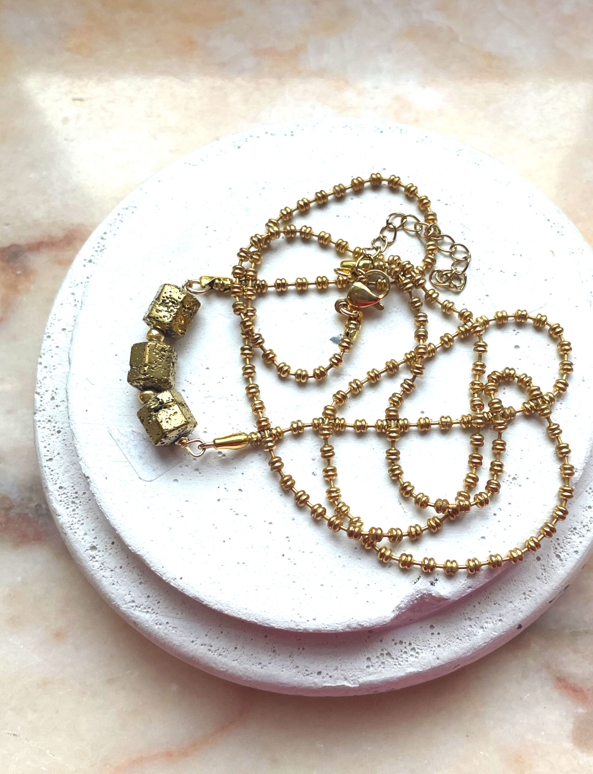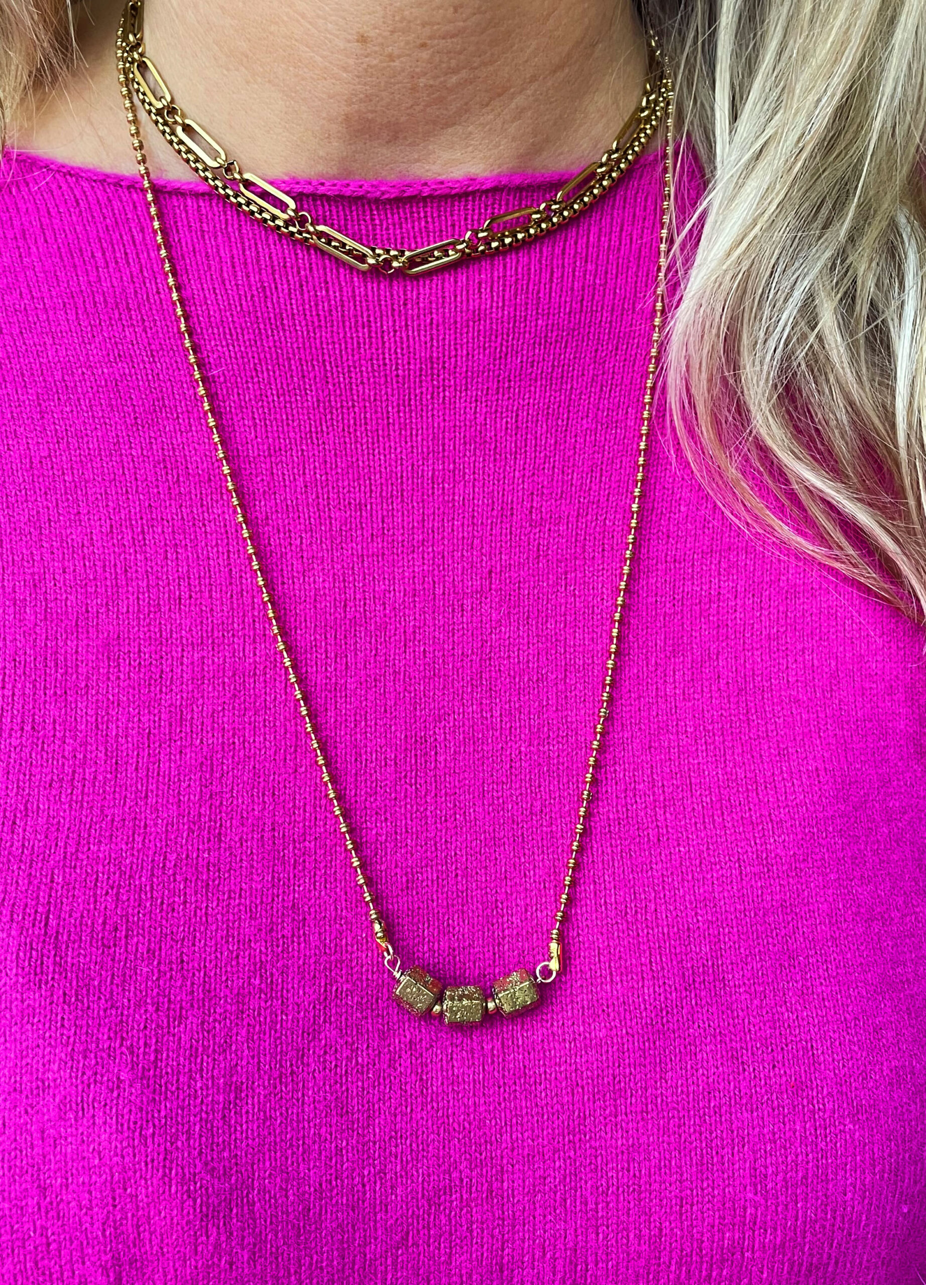 Collier mi-long réalisé à la main et en série limitée dans notre atelier situé en Belgique. Il se compose d’une base en acier inoxydable et de pierres en hématite. Longueur: 63cm > 68cm. Coloris: gold.