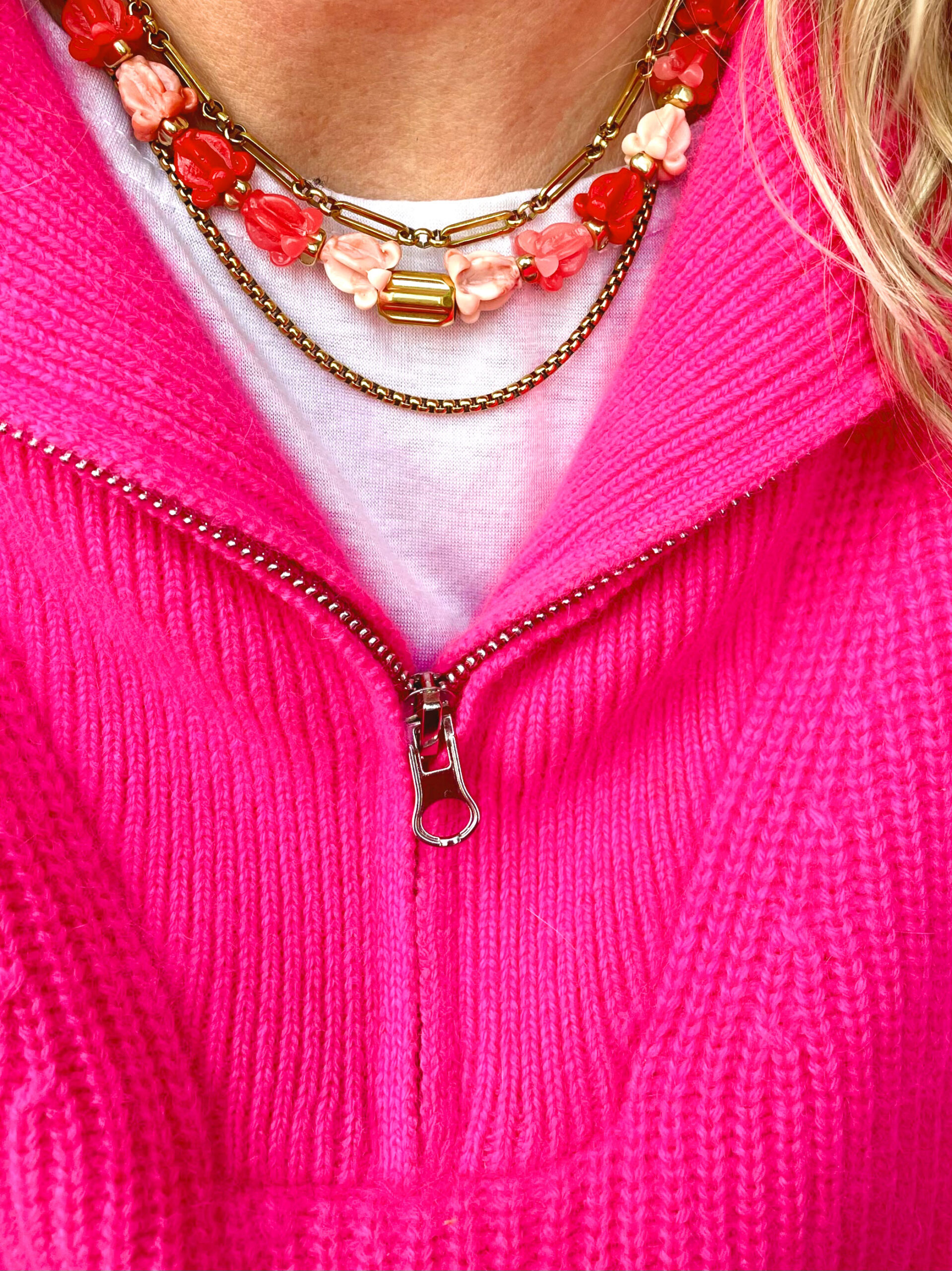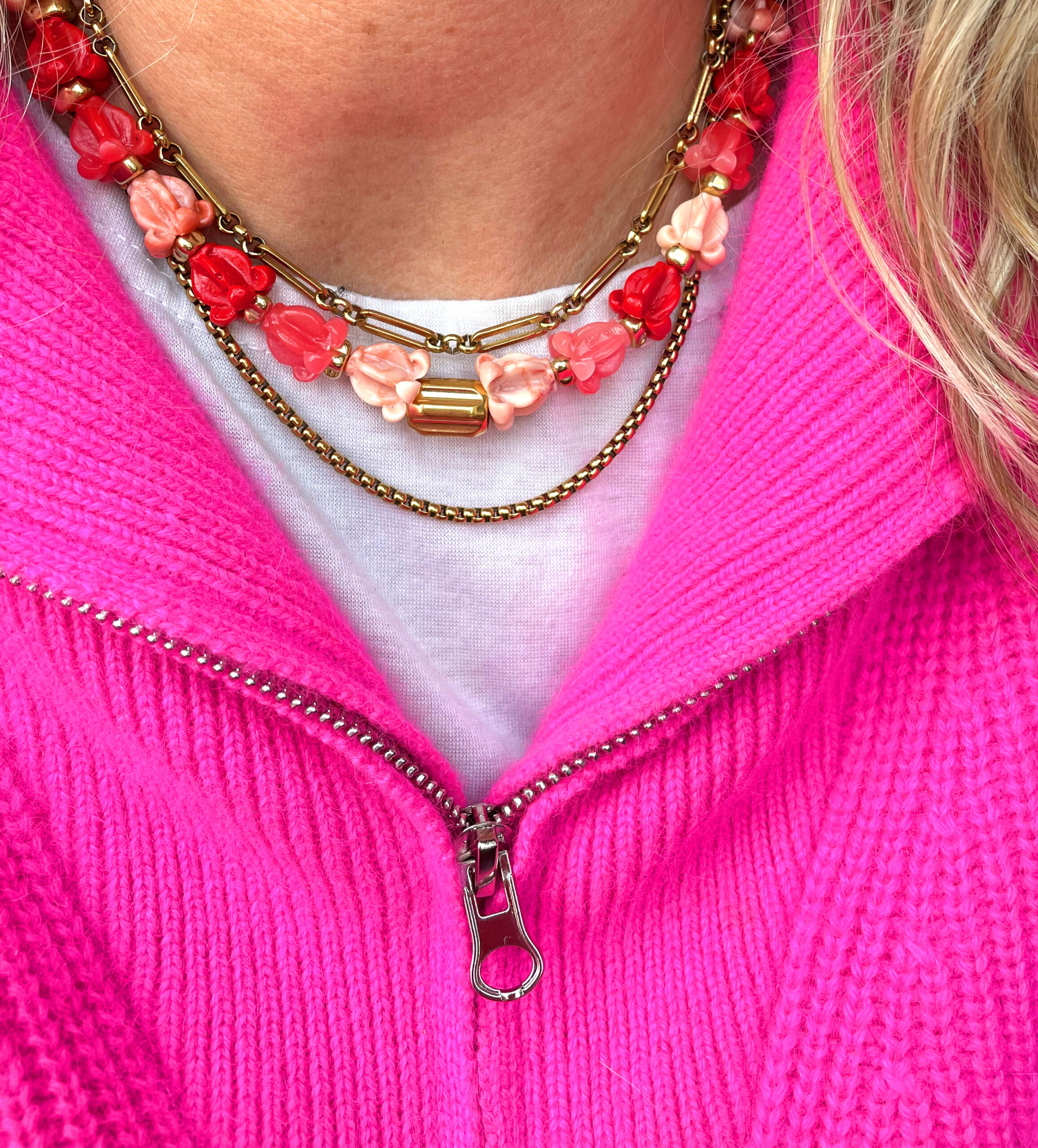Ce collier a été réalisé à la main et en série limitée dans notre atelier situé en Belgique. Il se compose de perles en résine, en hématite et acier inoxydable. Longueur: 42cm > 47cm. Coloris: rouge, corail, gold.