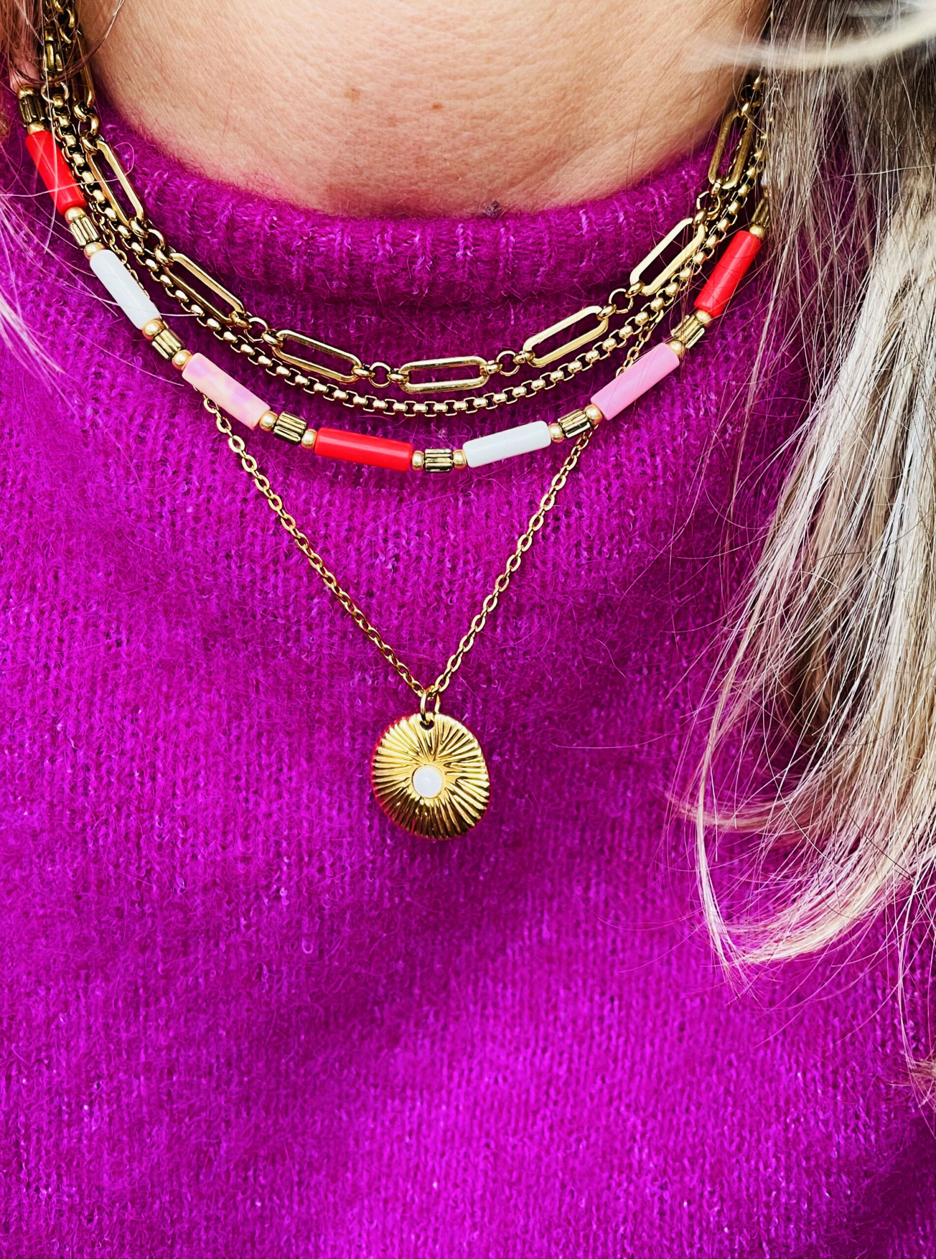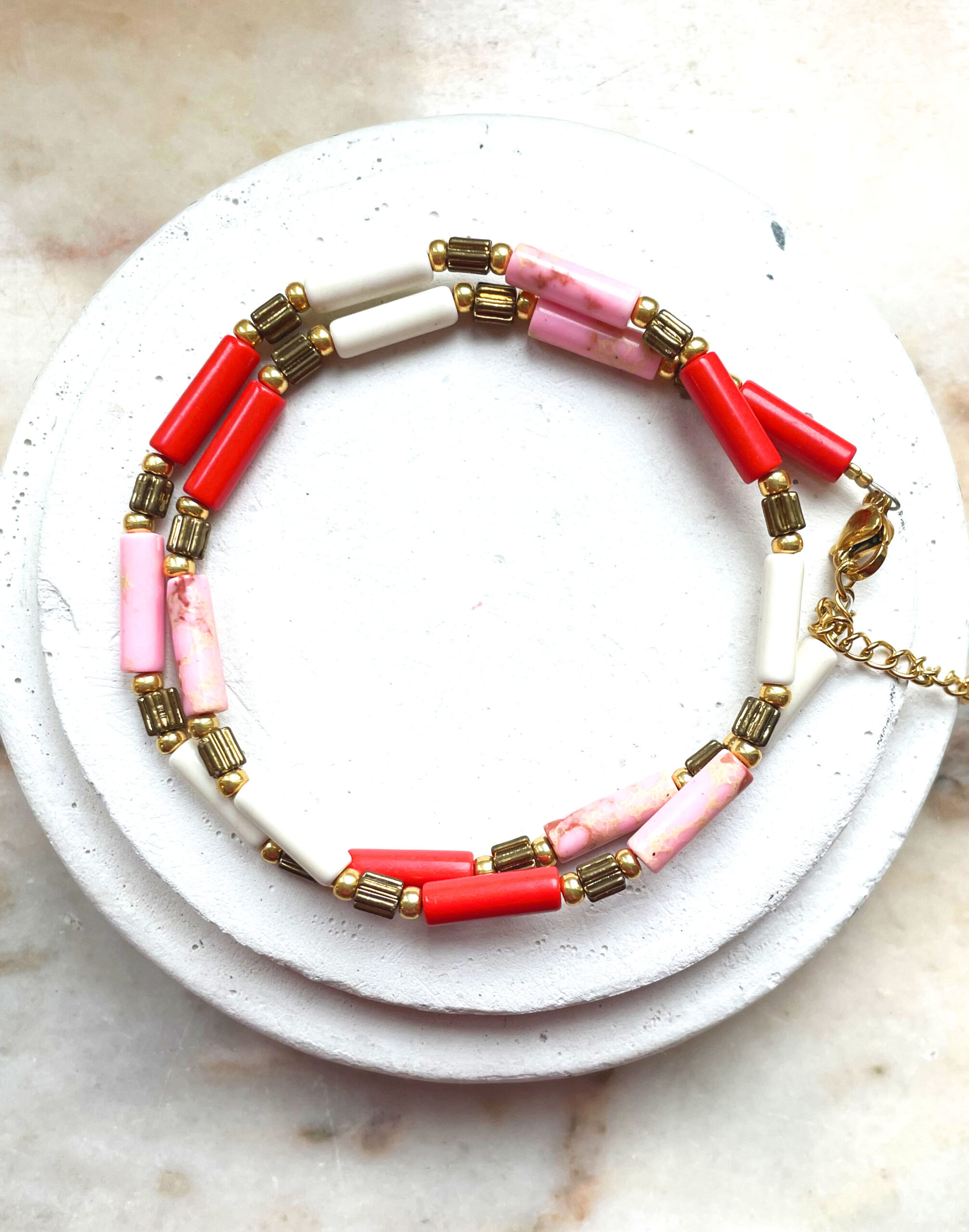 Ce collier a été réalisé à la main et en série limitée dans notre atelier situé en Belgique. Il se compose de perles en pierres, en verre et d’éléments en acier inoxydable. Longueur: 40cm > 45cm. Colopris: rose pastel, blanc, rouge orangé et gold.
