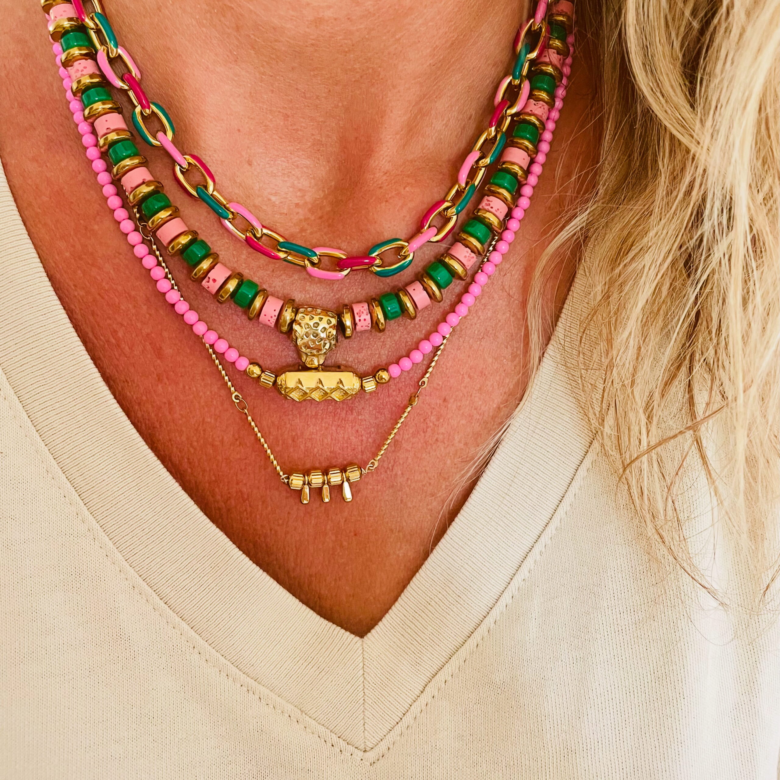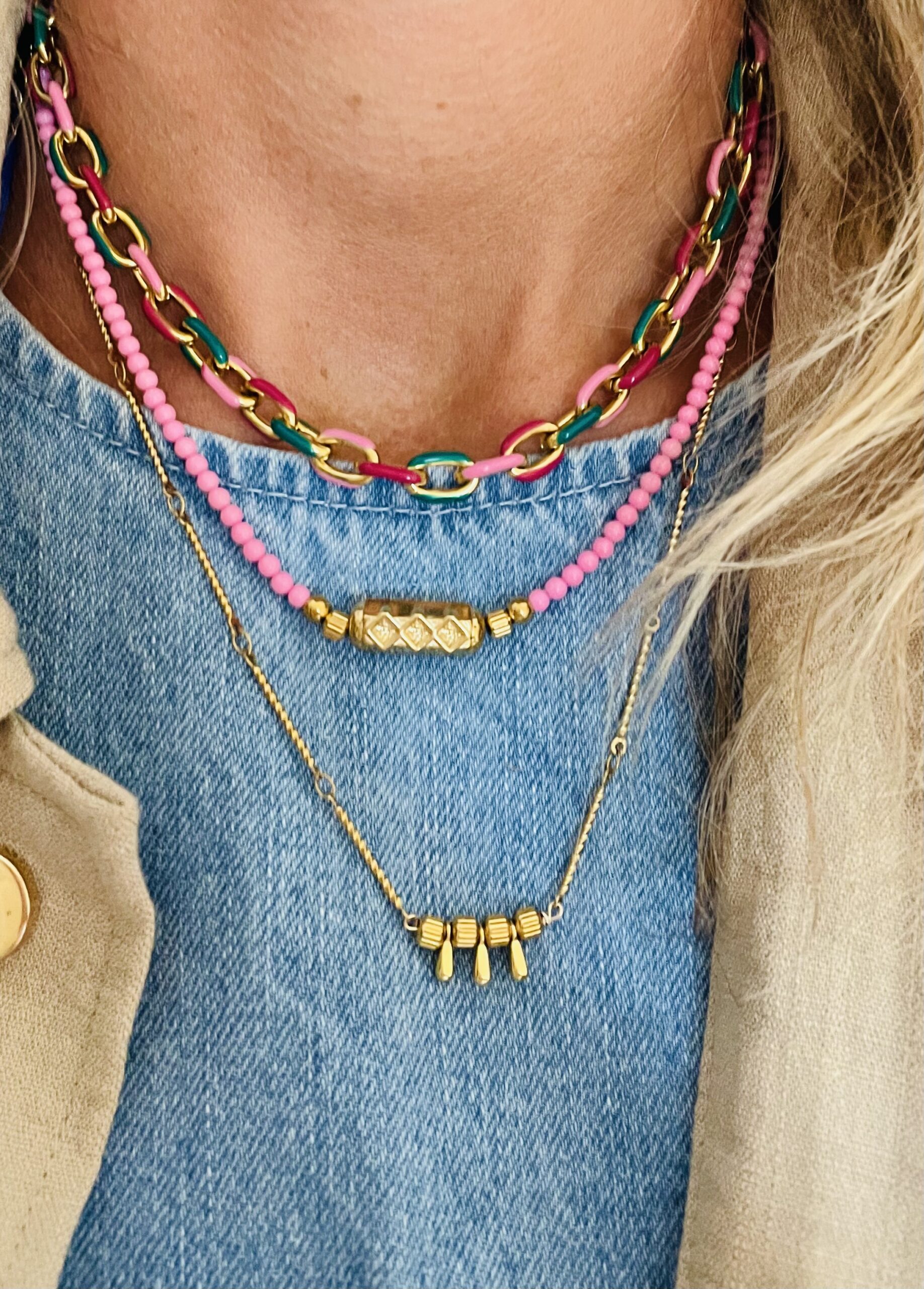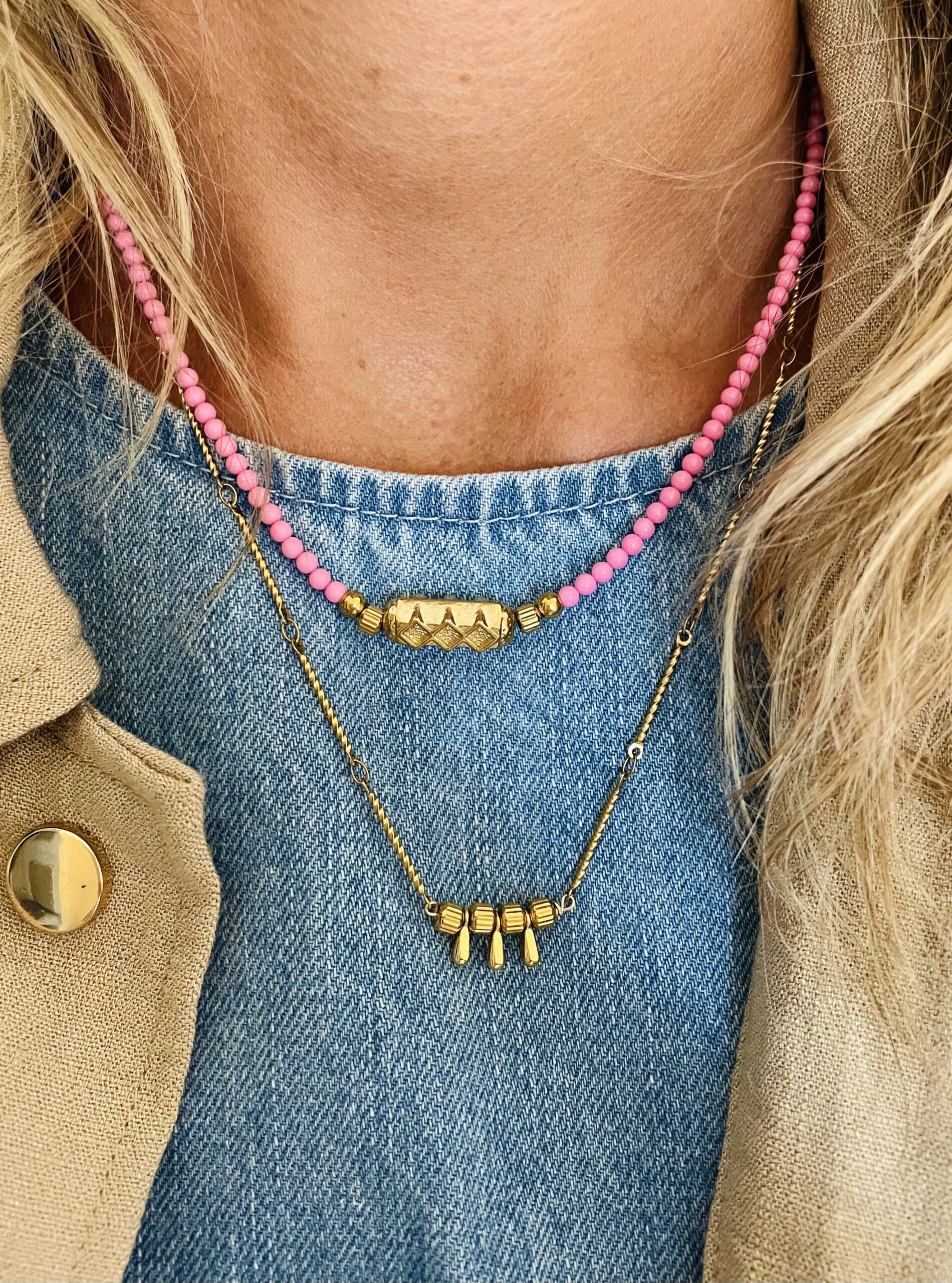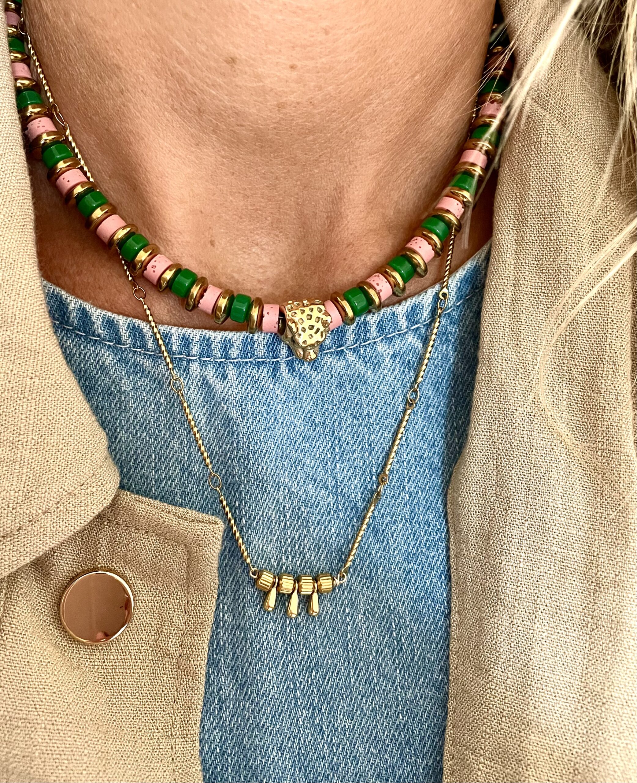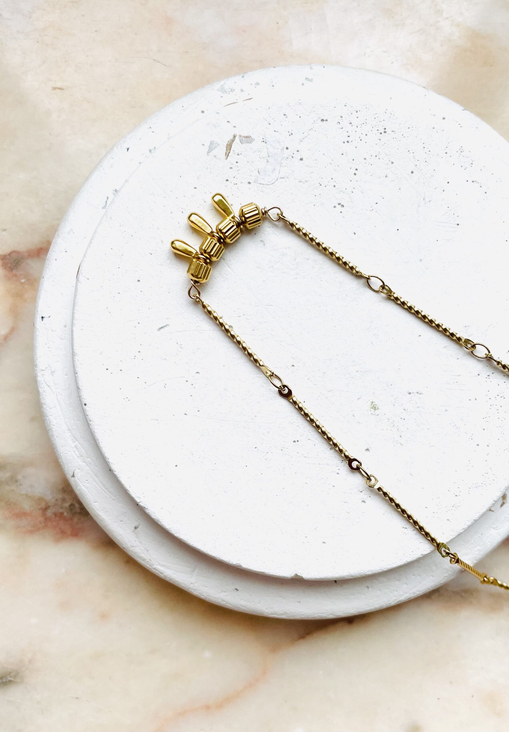 Ce collier a été fabriqué à la main et en série limitée dans notre atelier situé en Belgique. Il se compose d’une chaîne et d’éléments en acier inoxydable. Longueur: 46cm > 51cm. Coloris: gold.