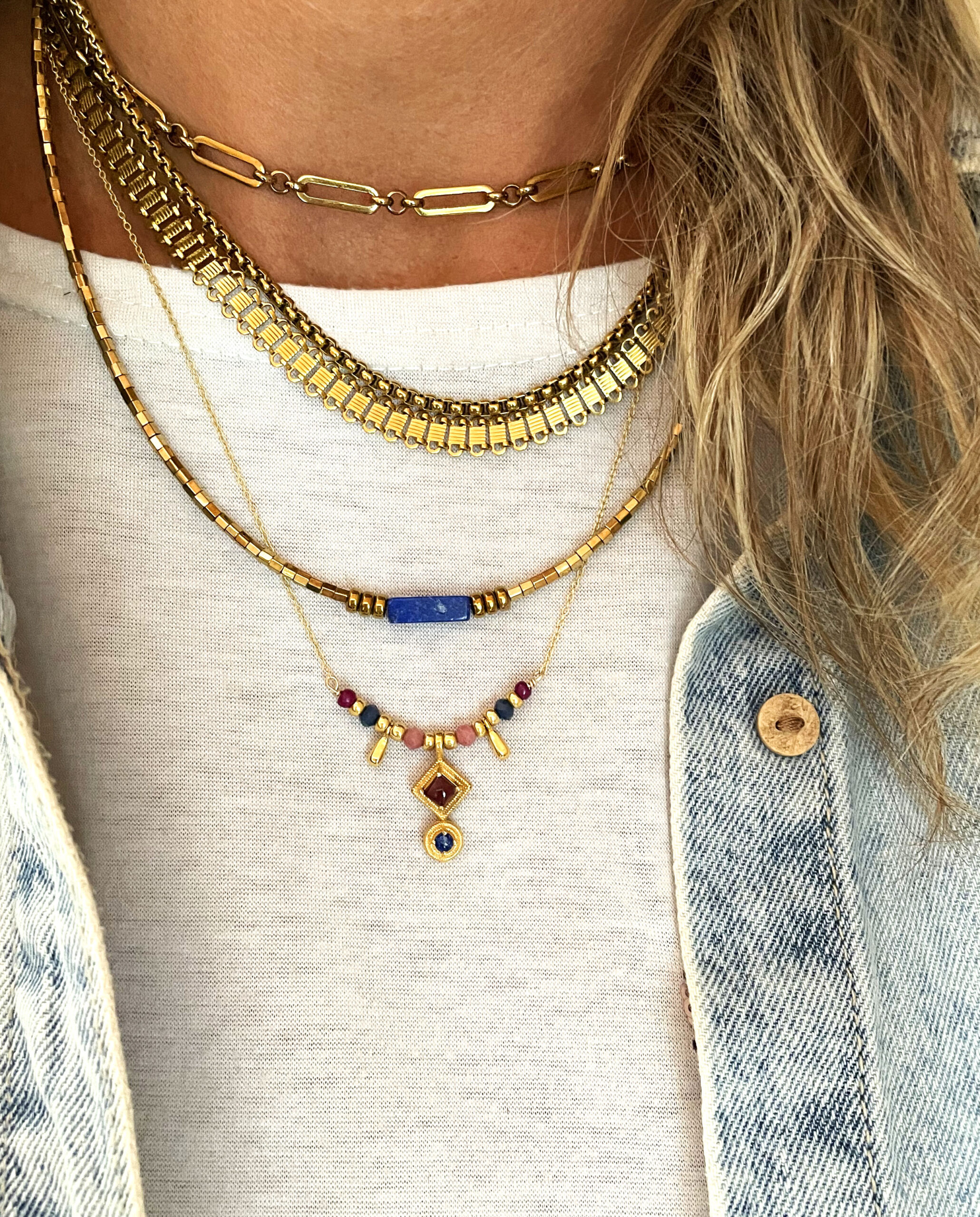 Ce collier a été réalisé à la main et en série limitée dans notre atelier situé en Belgique. Il se compose d’une chaine en laiton plaqué or, de perles en pierres et en verre et d’un pendentif en grenat et lapis lazuri. Coloris: bleu, grenade, vieux rose et gold. Longueur: 50cm > 55cm.