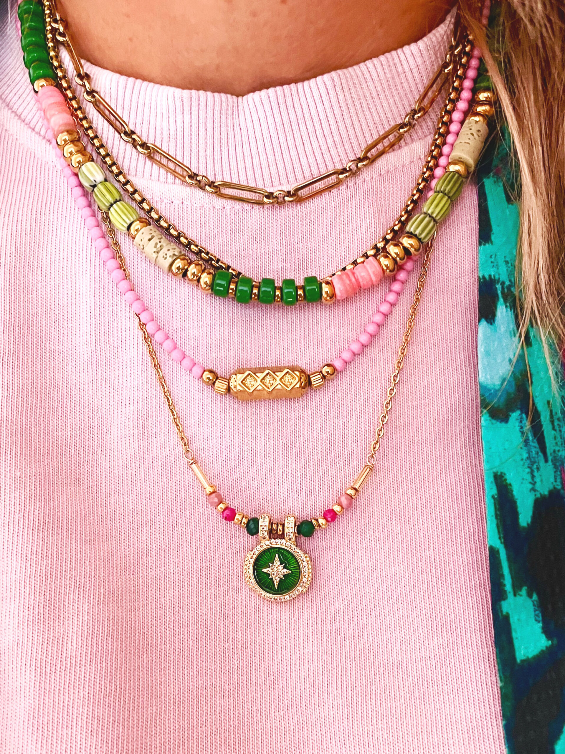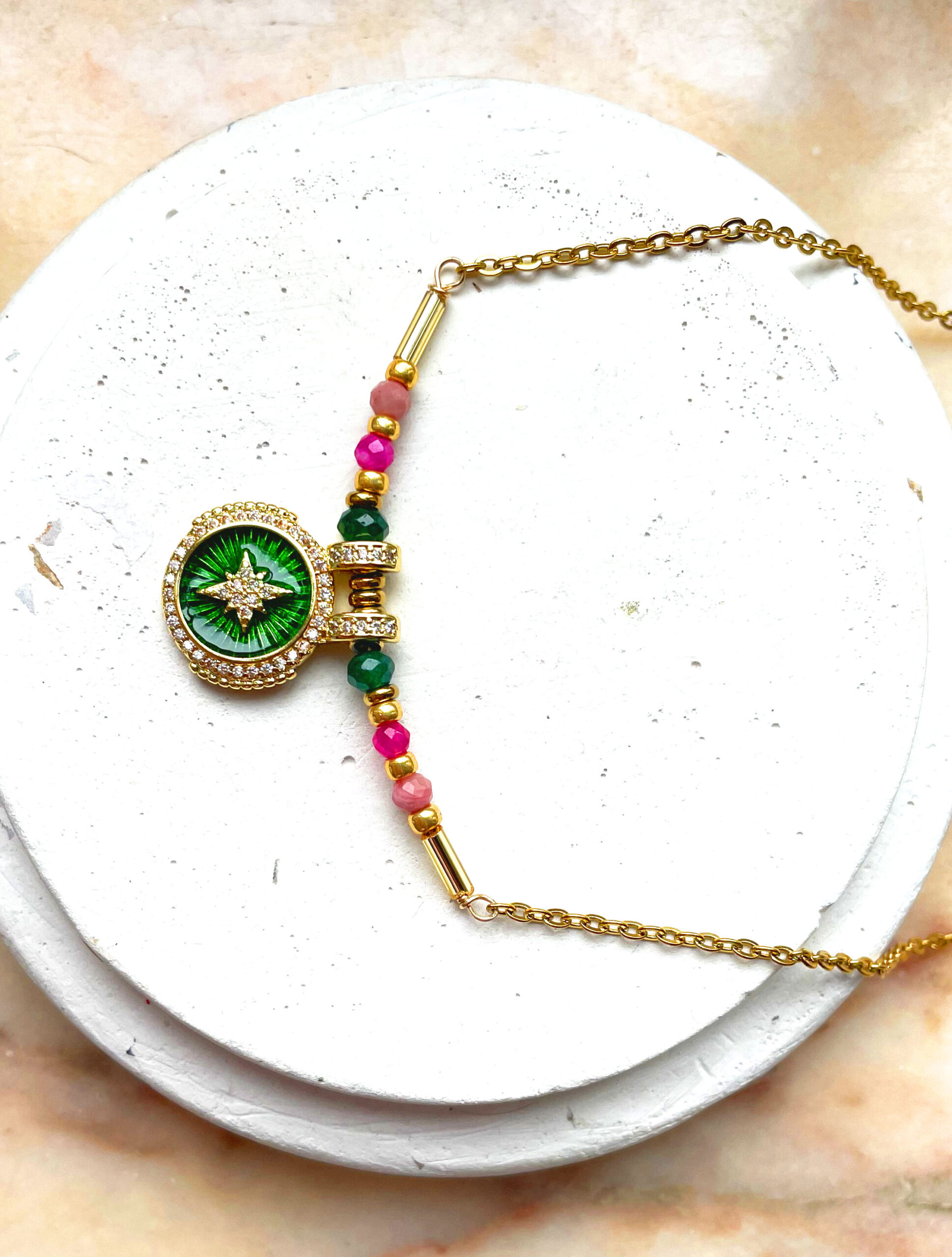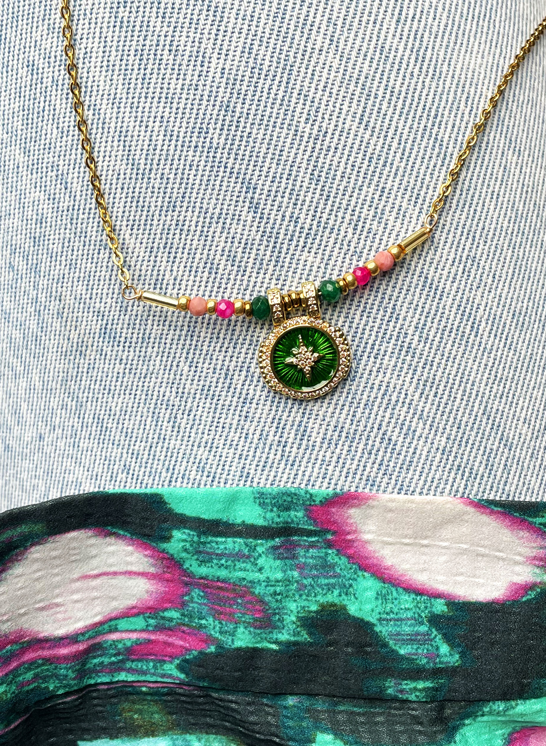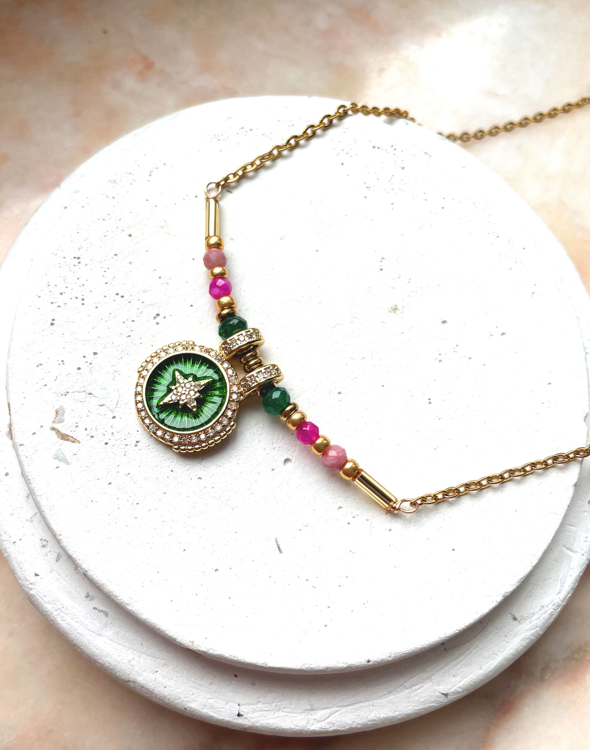 Ce collier a été réalisé à la main et en série limitée dans notre atelier situé en Belgique. Il se compose d’une chaine en acier inoxydable et de perles en pierres et en verre, d’un pendentif émaillé aurifié et de zircons. Coloris: vert, fushia, rose et gold. Longueur: 49cm > 54cm.