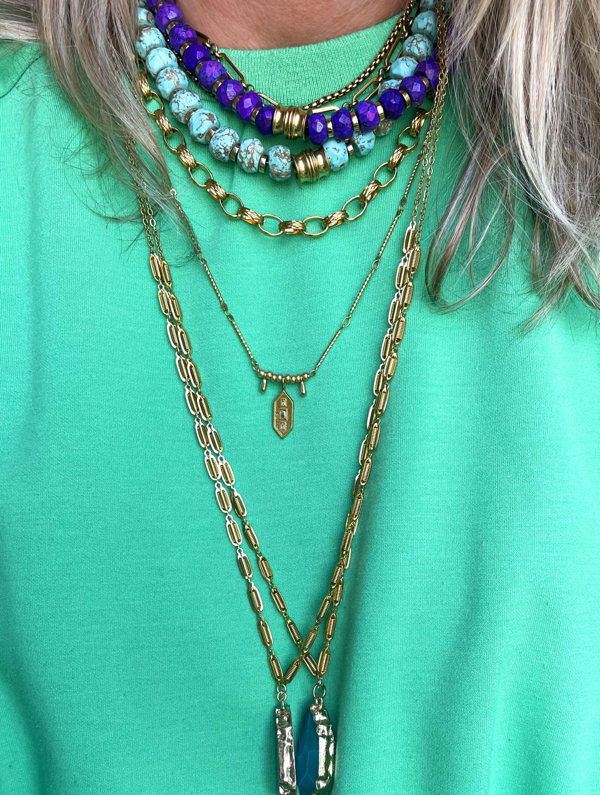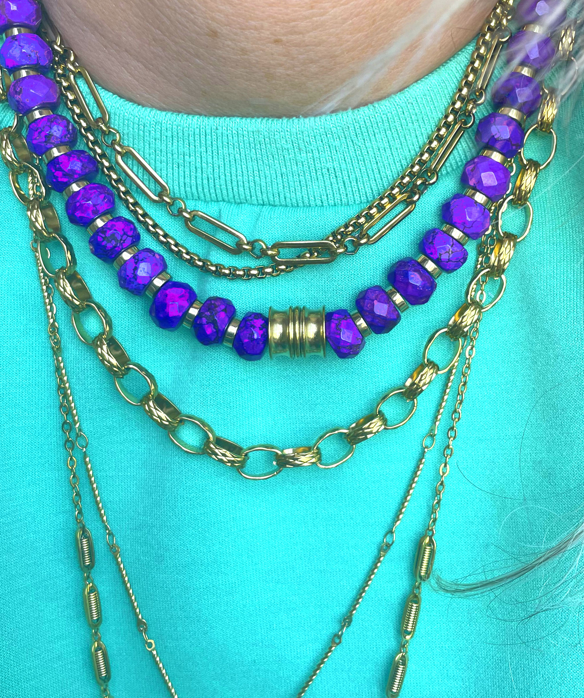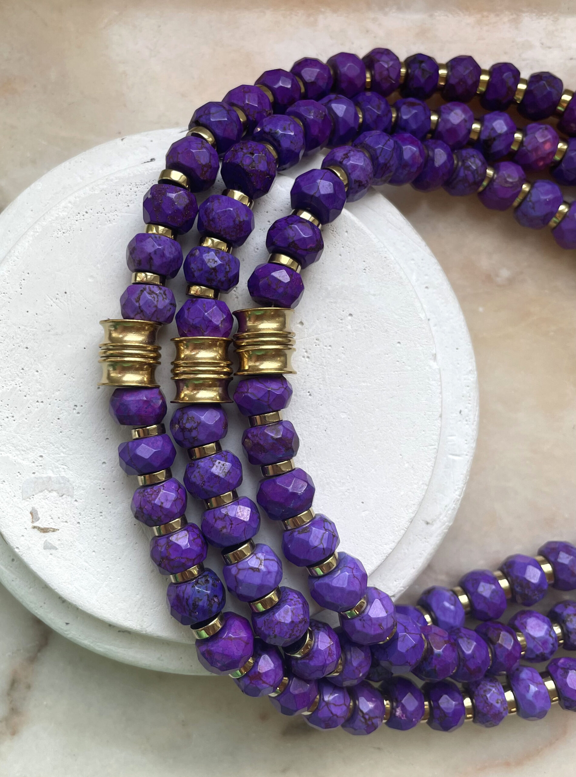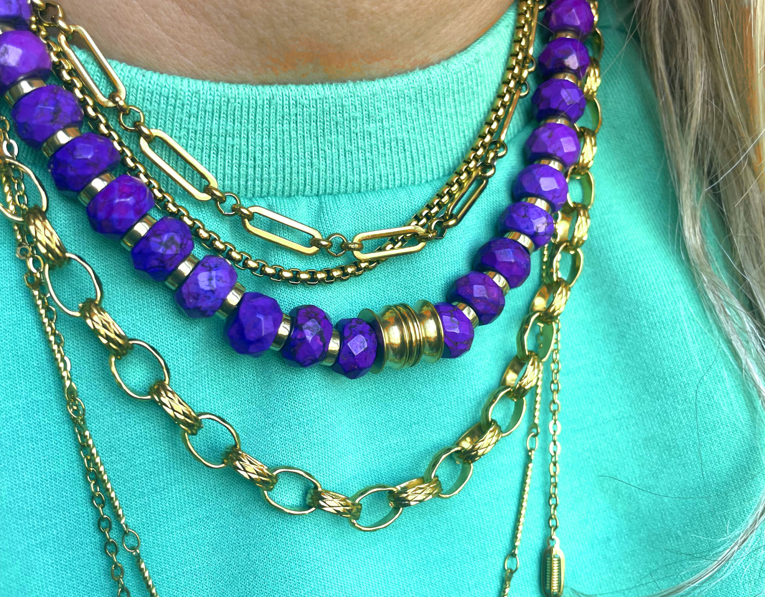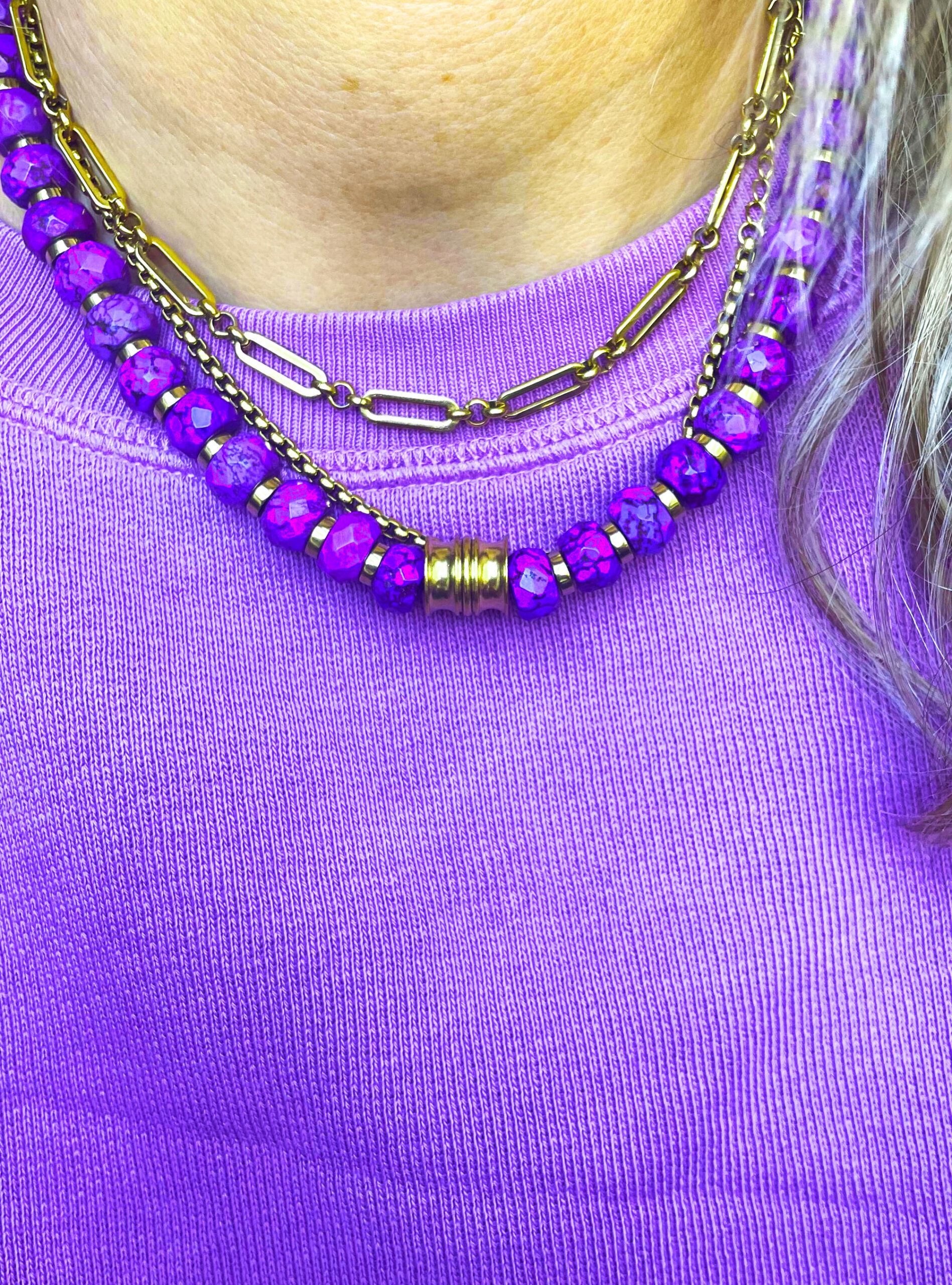 Ce collier a été réalisé à la main et en série limitée dans notre atelier situé en Belgique. Il se compose de perles en pierres (amethyste) et d’éléments en acier inoxydable. Longuur: 40cm > 45cm. Coloris: mauve et gold.