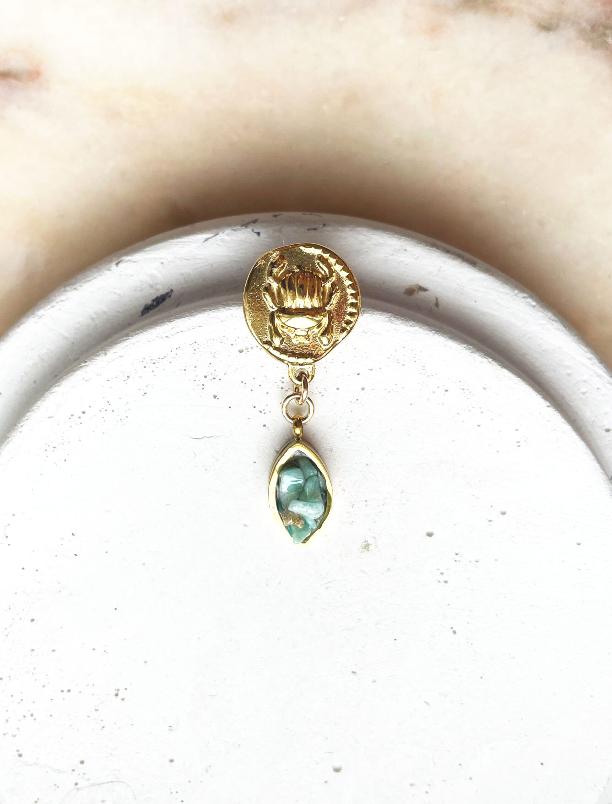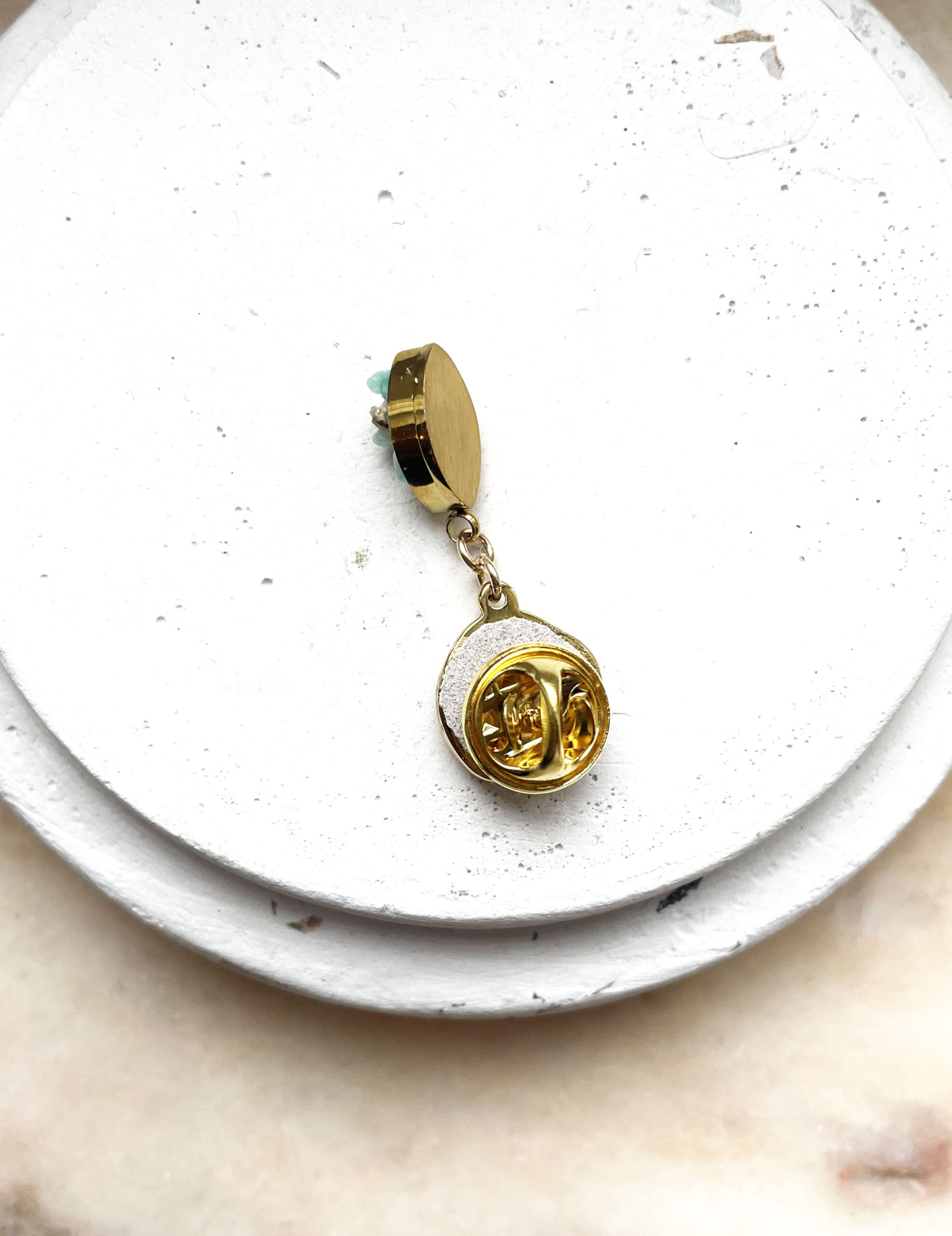 Ce pin’s a été réalisé à la main et en série limitée dans notre atelier situé en Belgique. Il se compose d’une base en laiton et d’éléments en acier inoxydable et pierre. Coloris: vert et gold. Longueur: 3,5cm.