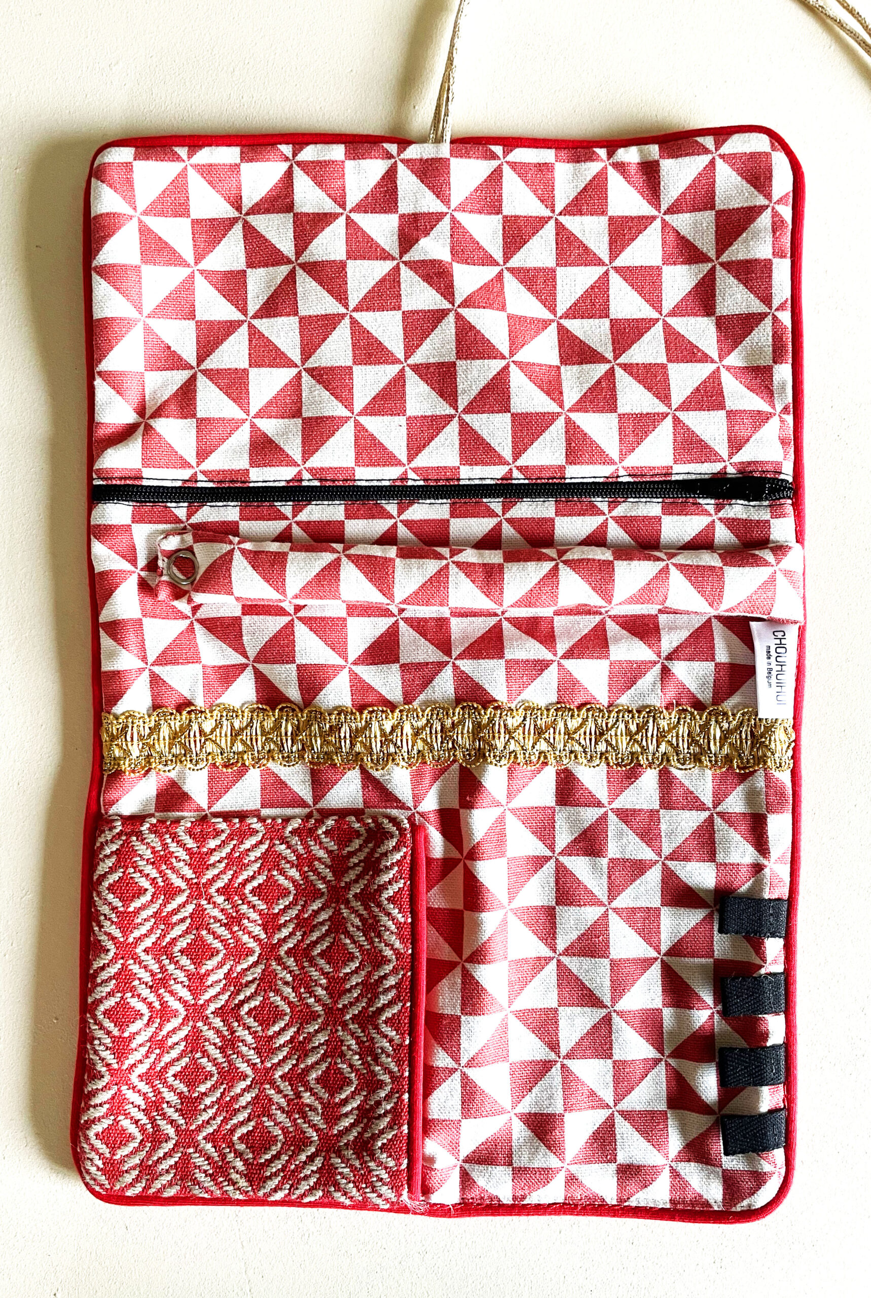 Cette pochette a été pensée et imaginée dans l’atelier Chouhuihui et réalisée dans un atelier protégé situé en Belgique. Les tissus ont été sélectionnés avec beaucoup de soin dans un magasin de tissus d’ameublement en Belgique ou le choix s’est porté sur des restants de chutes afin d’éviter le gaspillage. Le boudin avec pression permet de ranger bague et/ou créoles, les 4 rubans les colliers qui se glissent ensuite dans la poche, le compartiment a tirette sert à y placer les barrettes, les joncs, les bijoux plus imposants et la dentelle est à utiliser pour les boucles d’oreille. Taille de la pochette ouverte: 31cm x 21cm, Taille de la pochette fermée: 21cm x 11cm. Matières: Coton, polyester,… Coloris: rouge, rouge rosé, blanc, beige,..